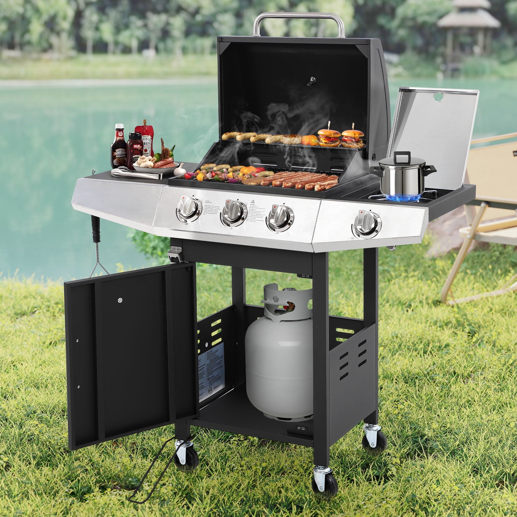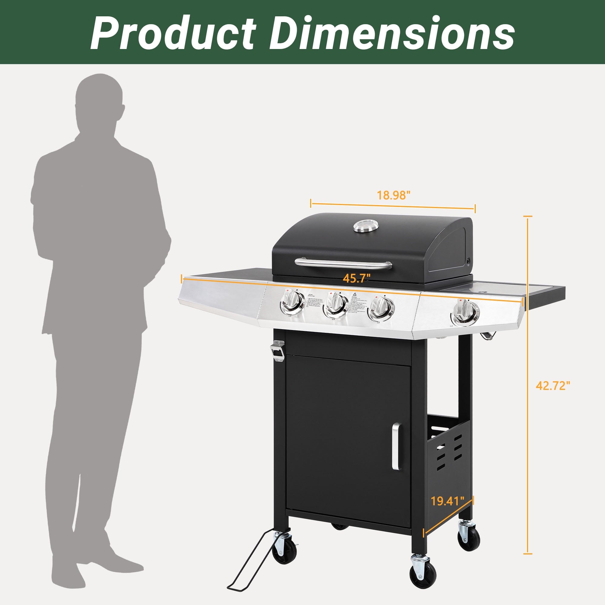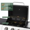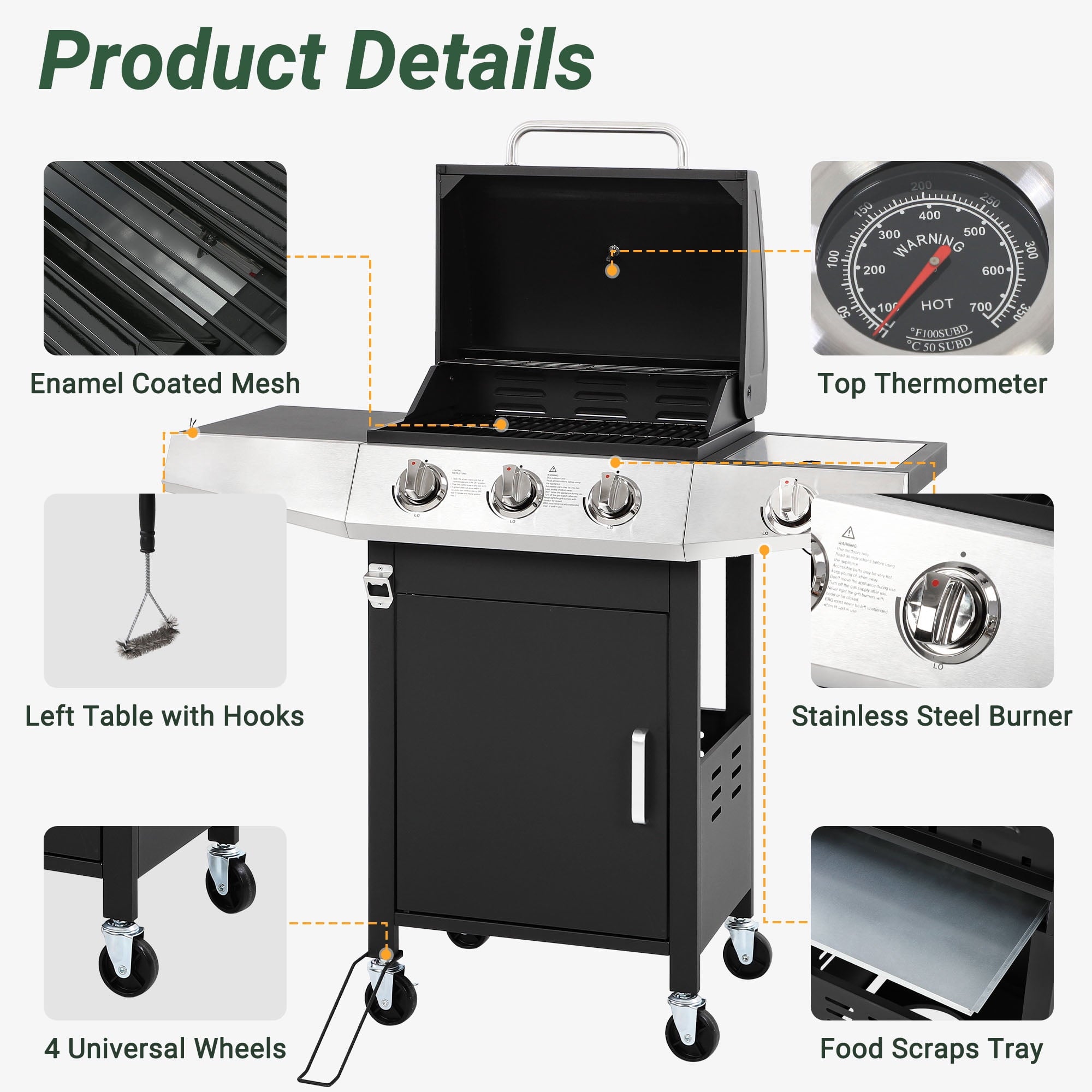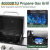 3. Scientific Design: Propane gas grill is more environmentally friendly with a built-in stainless steel thermometer; 4 switch knobs individually control Main burners and a side Burner for a total of 40000 BTU output.