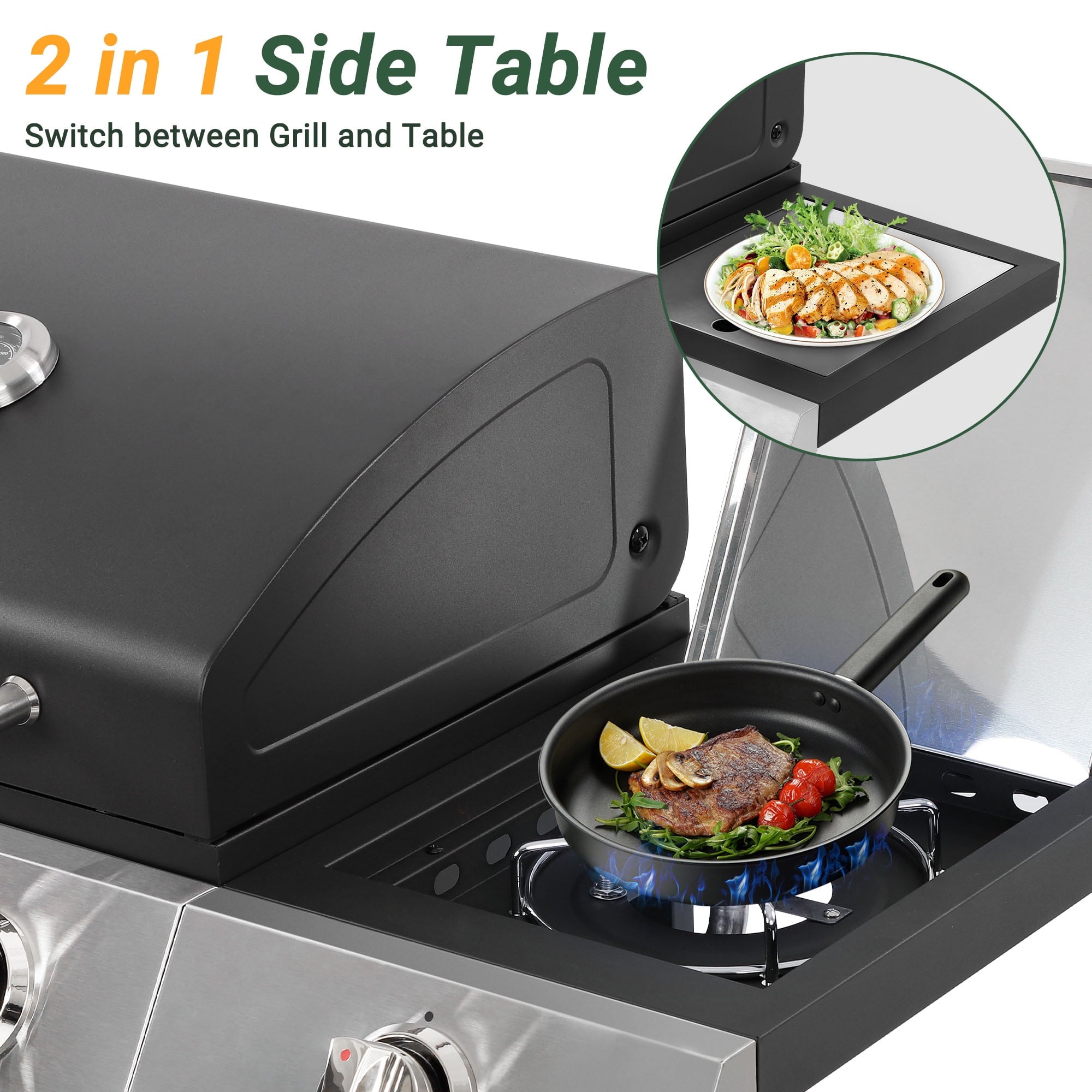 Thoughtful Design: With a built-in thermometer for accurate temperature monitoring and a versatile 2-in-1 side table offering extra prep space, this grill is engineered for convenience and precision.