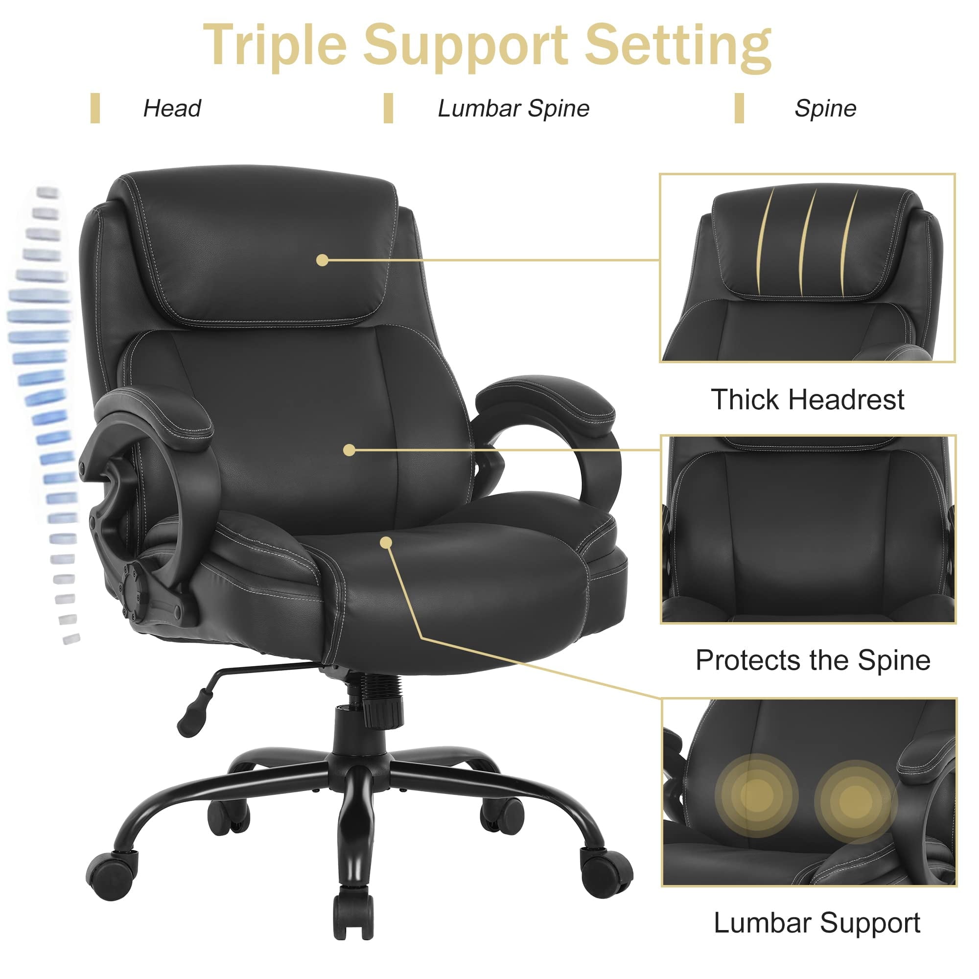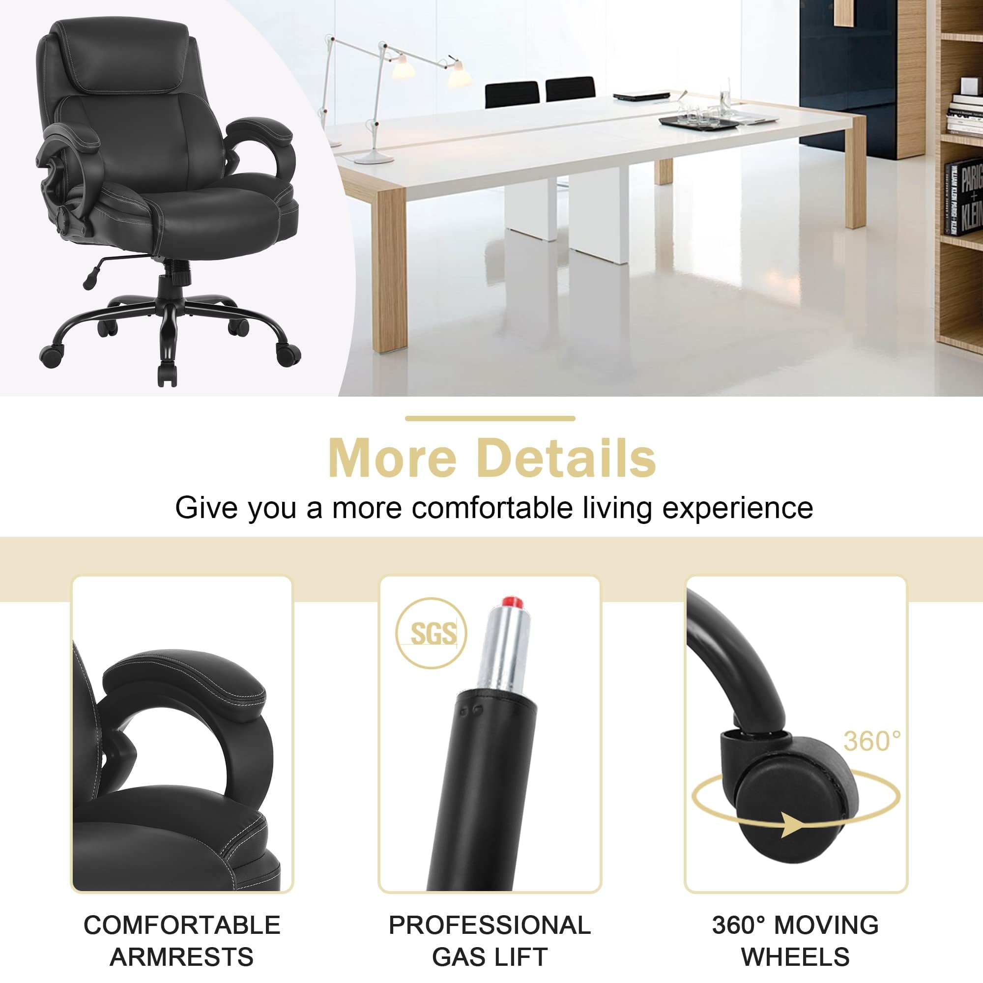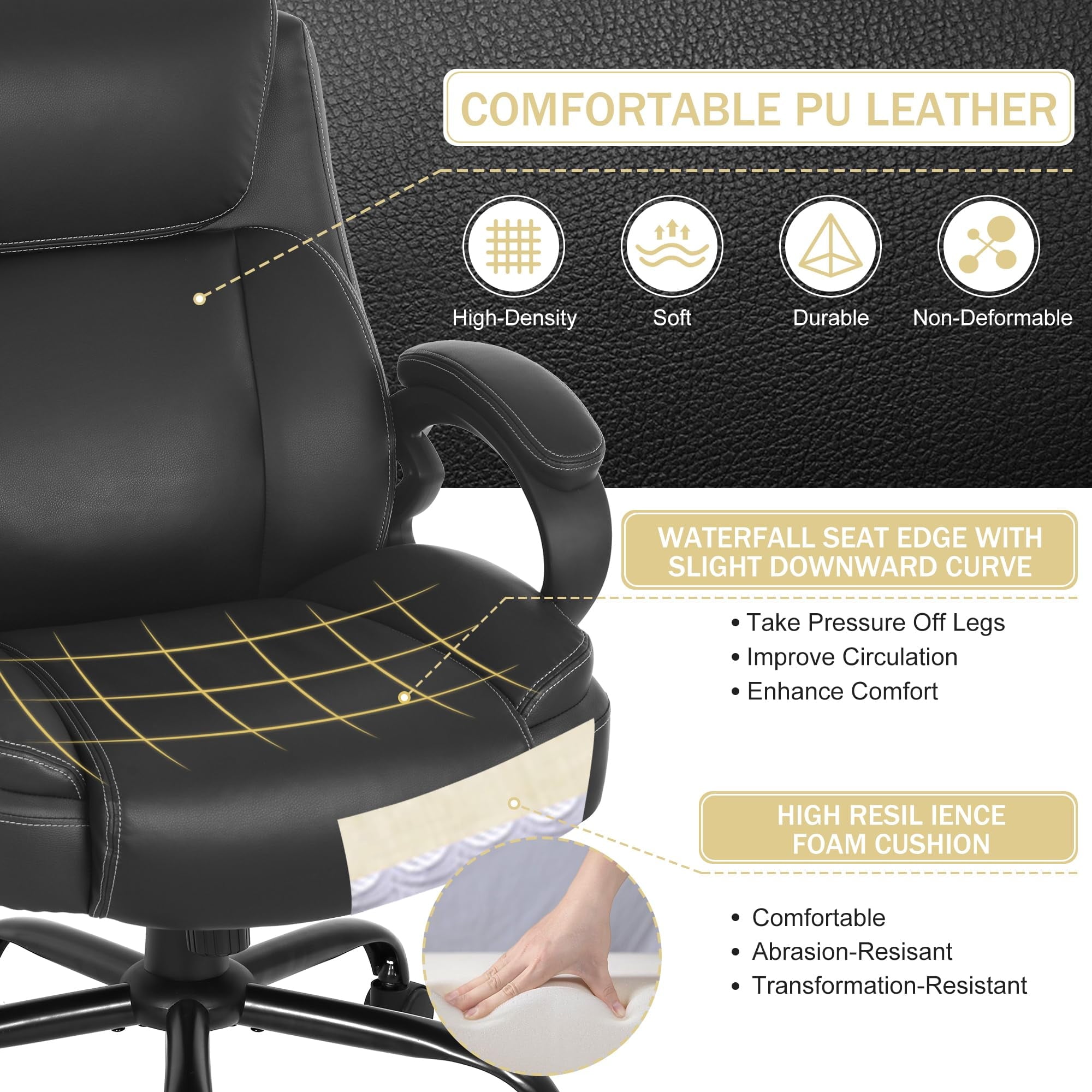 - 📚【COMFORTABLE CUSHION】The large and tall office chair is upholstered in breathable, soft PU leather. The thick cotton seat with springs alleviates muscle pain caused by prolonged sitting while promoting natural airflow in the seating area. This prevents sweat and back overheating and ensures you feel comfortable and cozy.