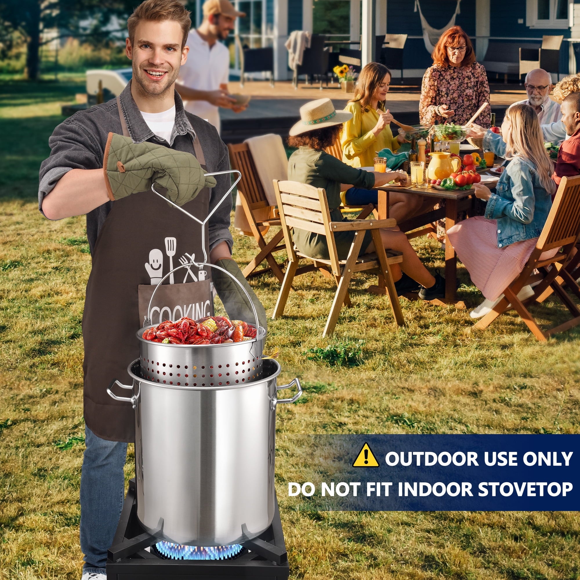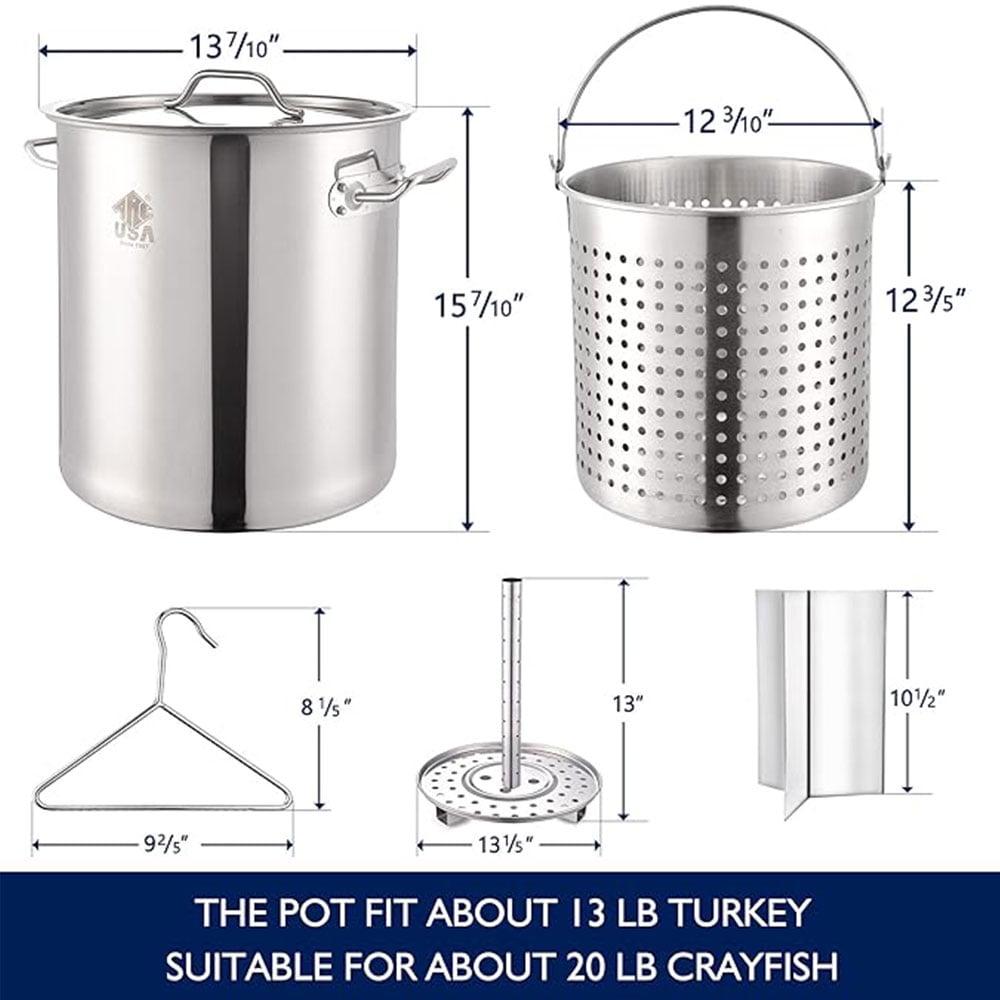 • Best Choice: This seafood boil pot with basket kit is your best choice for frying turkey, cooking crawfish, seafood, shrimp, crab, lobster and tamale steamer for Thanksgiving and Christmas.200,000 BTU/h high heat output, fast cooking.Ideal set for your outdoor burner kit.
