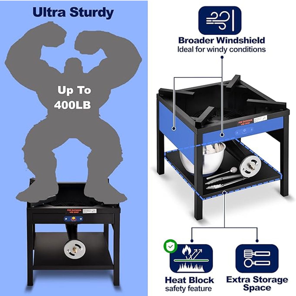 • Hight-Heat Output: ARC Single burner propane stove has a Heavy-Duty Square Stove with 200,000BTU high heat output.16.5″ * 16.5″ large cooking area, suitable for different cookware: barbecue grills, turkey fryer pots or tamale steamer, etc.