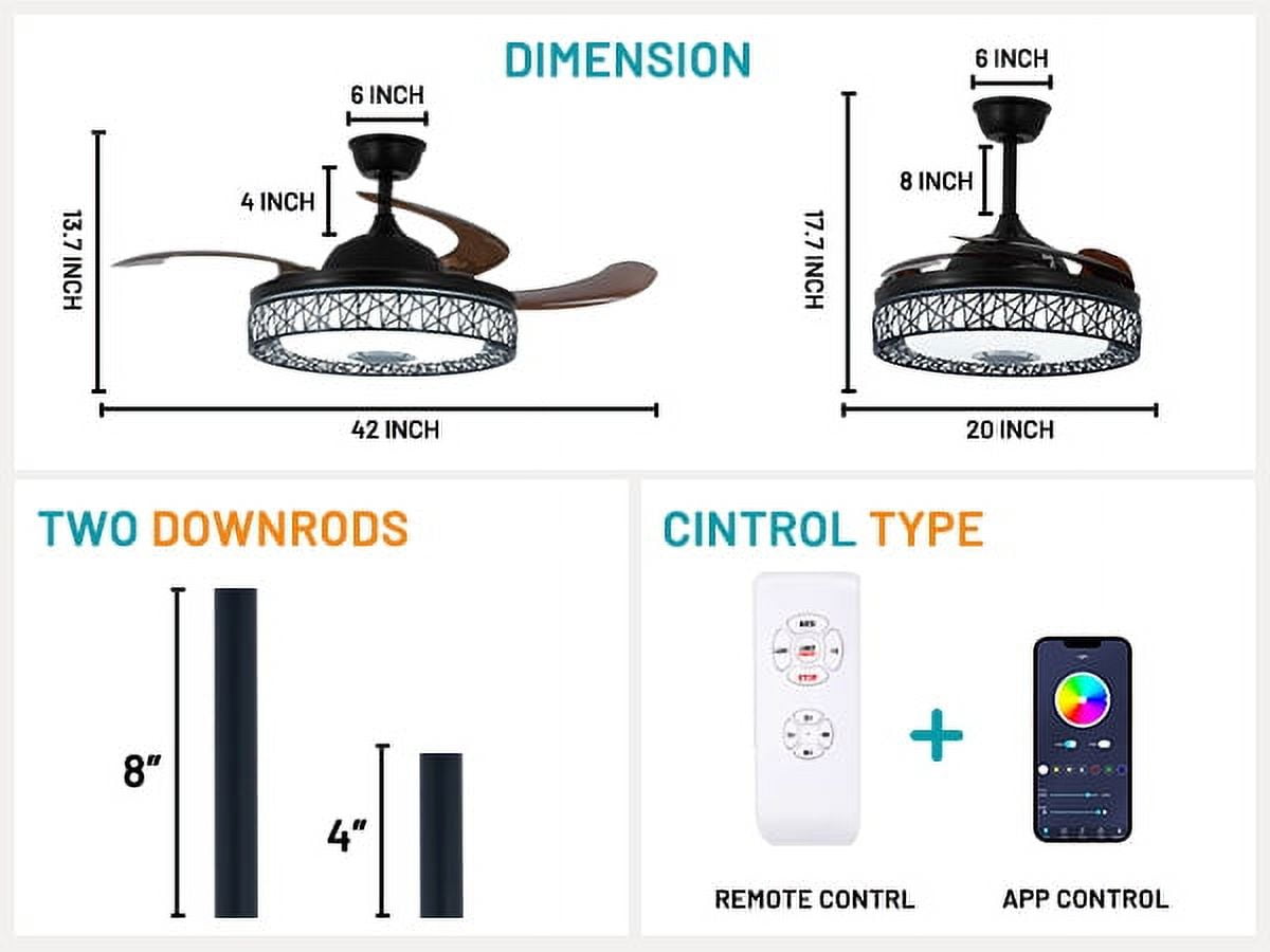 Size after installation: 42.13″ (diameter of fan blade after expansion) *13.78″ (height) or so, the “two-dimensional code” on the Bluetooth installation manual in the mobile phone scan code package can download APP, and the mobile phone can play music and control lighting
