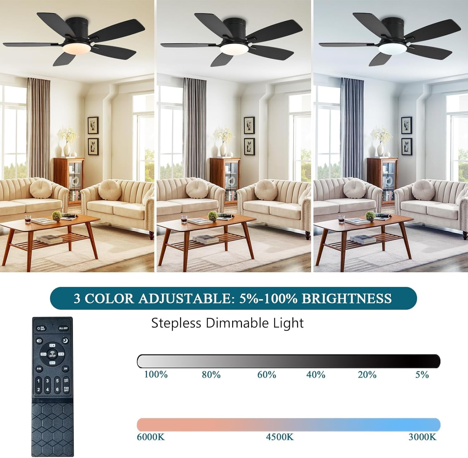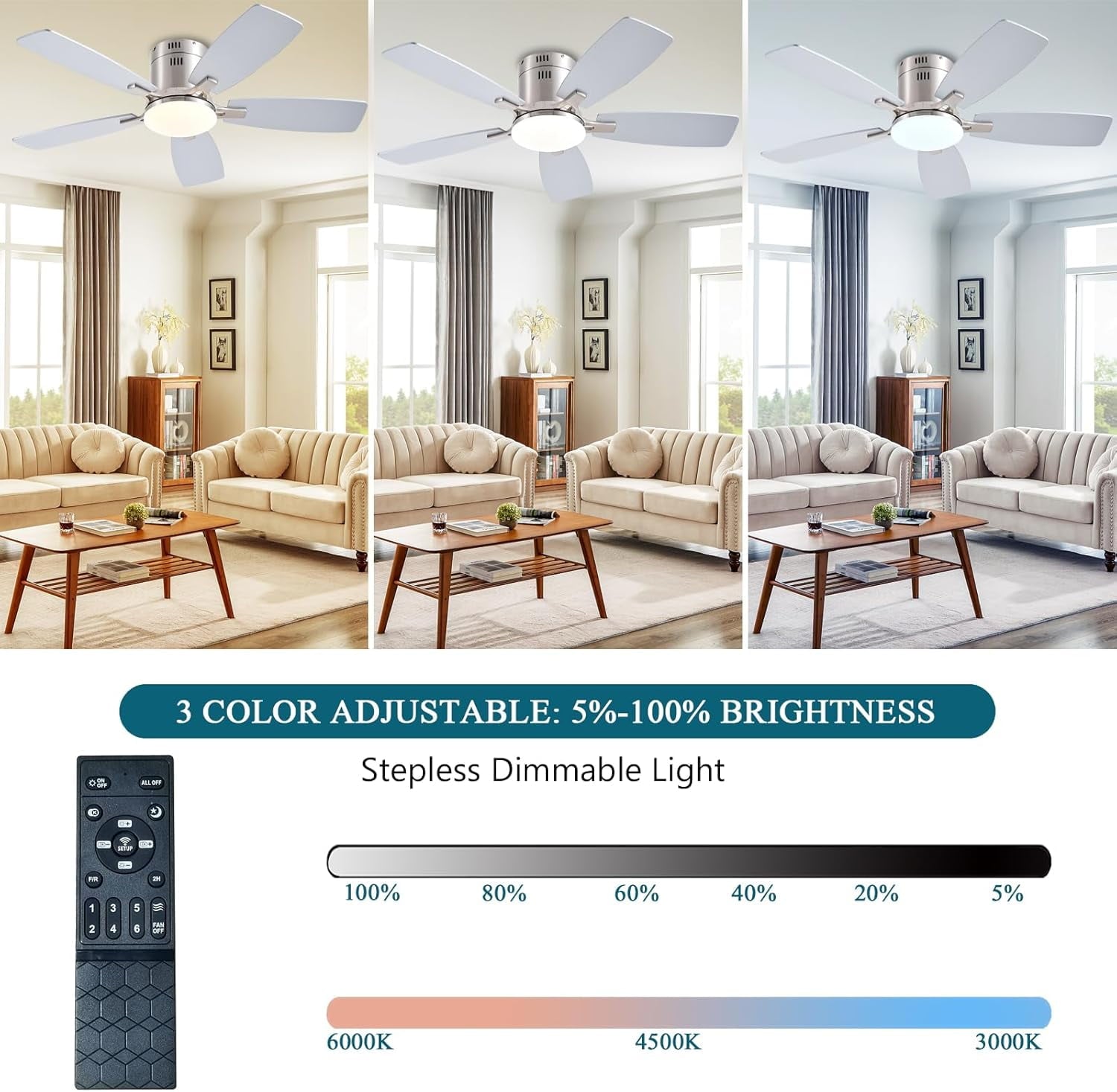 - Dimmable Modern Ceiling Fan: This 42 inch ceiling fan has 30W dimmable LED lights. LED can adjust brightness(5%-100%), and can change three color temperatures (warm light 3000K/daylight 4000K/cool light 6500K), you can adjust different color temperatures and brightness when you are partying, working or reading. The advantage of LED light sources is that they are more eye-friendly, energy efficient, and have a longer life than ordinary incandescent and fluorescent light sources.
