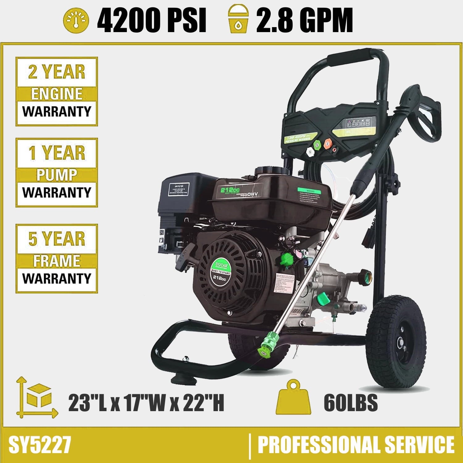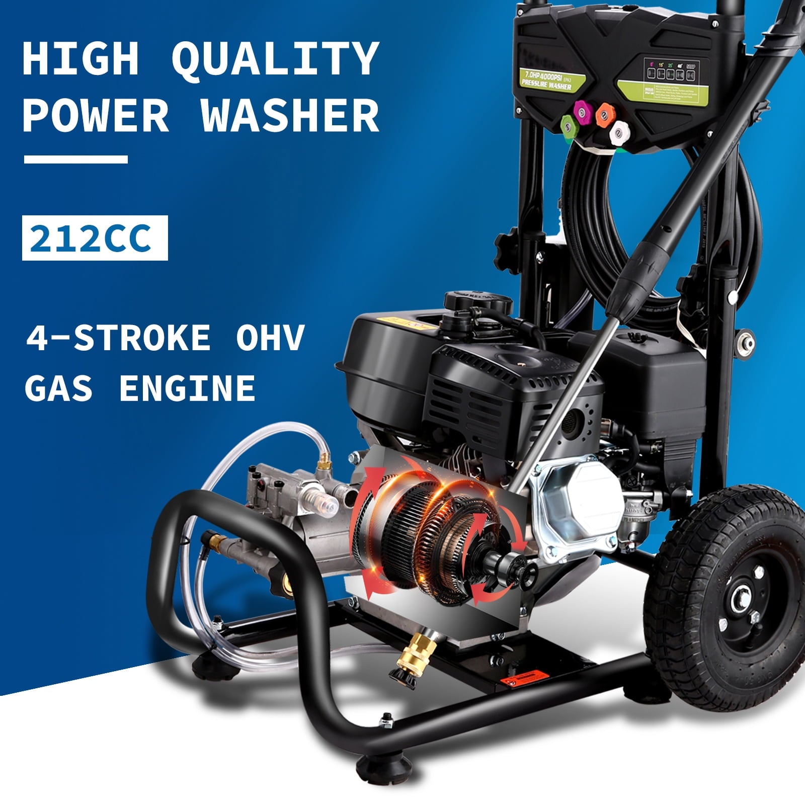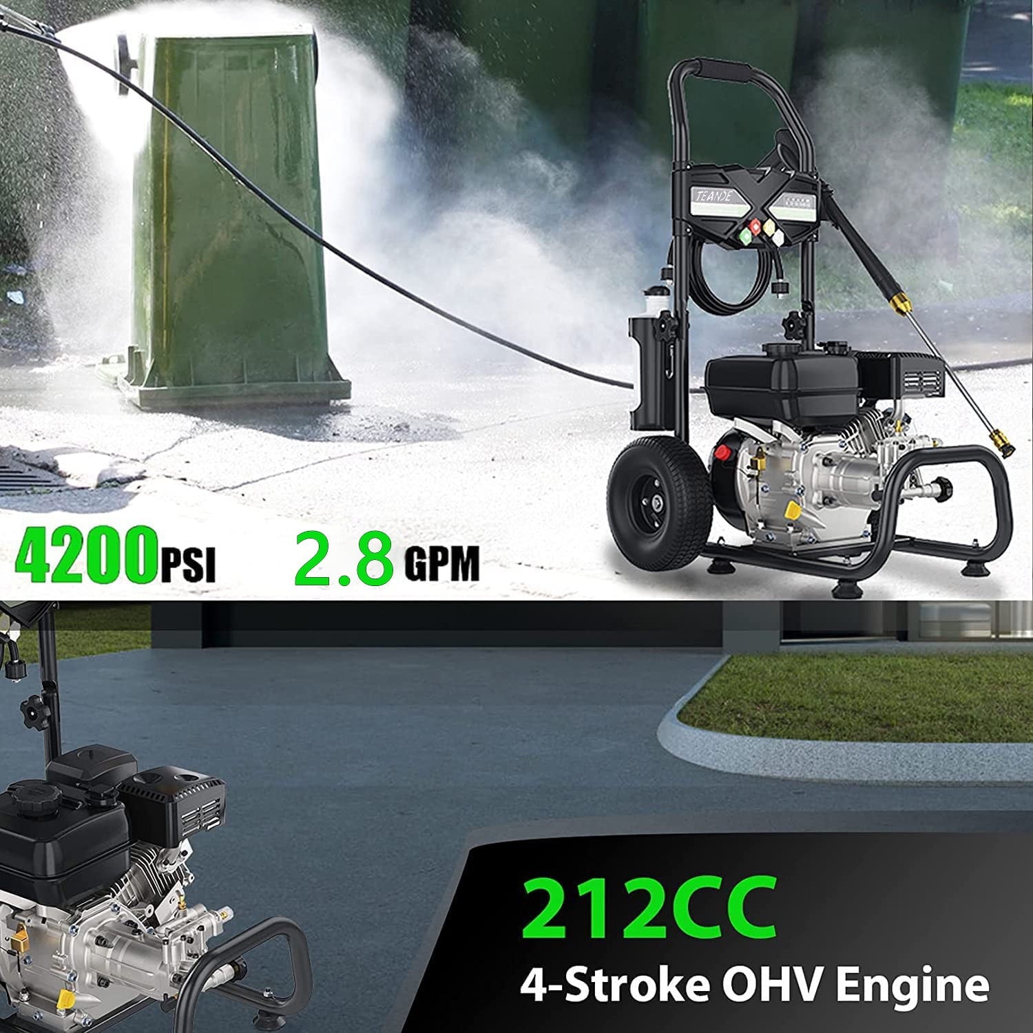 - >>>[Have Great Power!]MAX 4200 PSI 2.8 GPM,get Stubborn stains disappear immediately! So POWERFUL to FIX MOST HEAVY CLEANING JOBS! Perfect for Decks, Sidewalks, Siding, Fences, Railings, Garage Floors, Exterior Walls, Cars and Patio Furniture.>>>[5 Quick-connect Nozzles Set]With 0°,15°,25°,40°and Soap Nozzles ,deal with different washing tasks, 0°for ultra pressure,15°for high pressure,25°for medium pressure,40°for low pressure and Soap Nozzles for soap cannon.>>>[Powerful Engine]Gas powered 212cc 7.0 Gross HP engine offers Great power!Convenient, Durable and Reliable. Easy to Fill nearly 1 Gallon/3.6L Fuel Volume and 600 ML oil quantity.