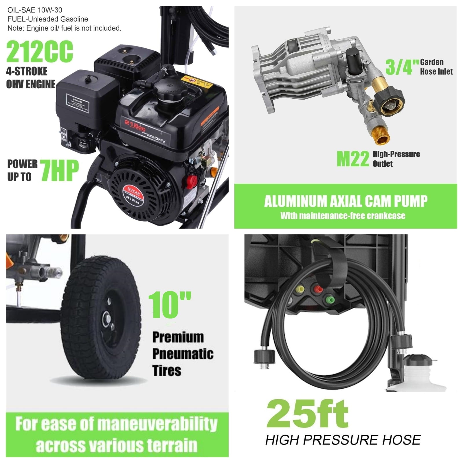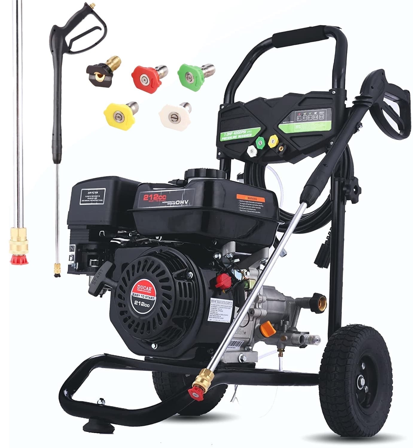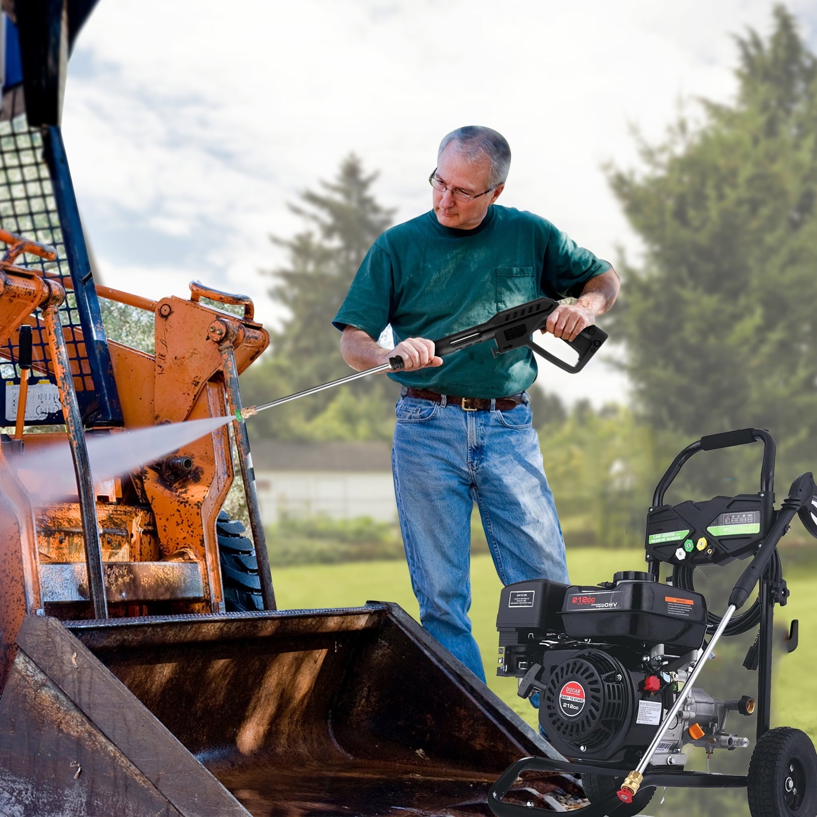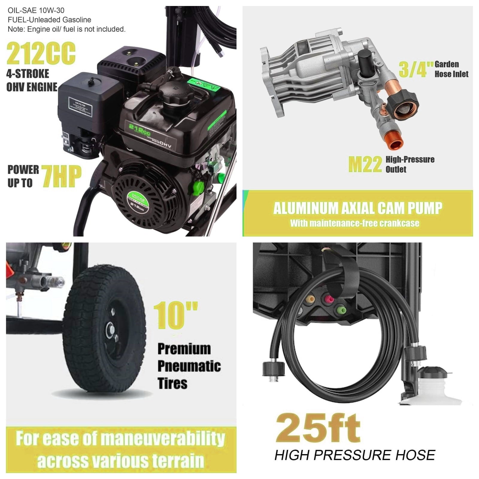 - >>>[Have Great Power!]MAX 4200 PSI 2.8 GPM,get Stubborn stains disappear immediately! So POWERFUL to FIX MOST HEAVY CLEANING JOBS! Perfect for Decks, Sidewalks, Siding, Fences, Railings, Garage Floors, Exterior Walls, Cars and Patio Furniture.>>>[5 Quick-connect Nozzles Set]With 0°,15°,25°,40°and Soap Nozzles ,deal with different washing tasks, 0°for ultra pressure,15°for high pressure,25°for medium pressure,40°for low pressure and Soap Nozzles for soap cannon.>>>[Powerful Engine]Gas powered 212cc 7.0 Gross HP engine offers Great power!Convenient, Durable and Reliable. Easy to Fill nearly 1 Gallon/3.6L Fuel Volume and 600 ML oil quantity.