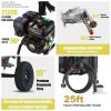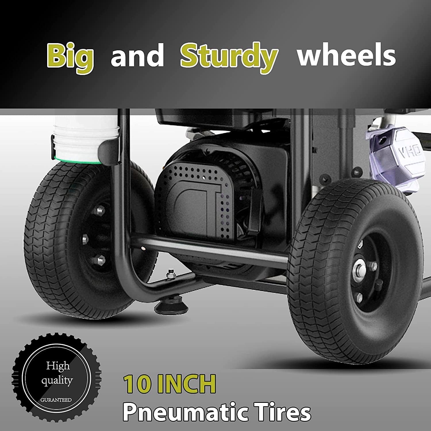 - >>>[ 25FT Hose and BIG Wheels] The 25ft hose is long enough to easily extend to all corners and hard-to-reach areas. The long hose design allows the user to operate the equipment more flexibly, no longer limited by space constraints. Big Steady Rubber Wheels let the pressure washer move easily!