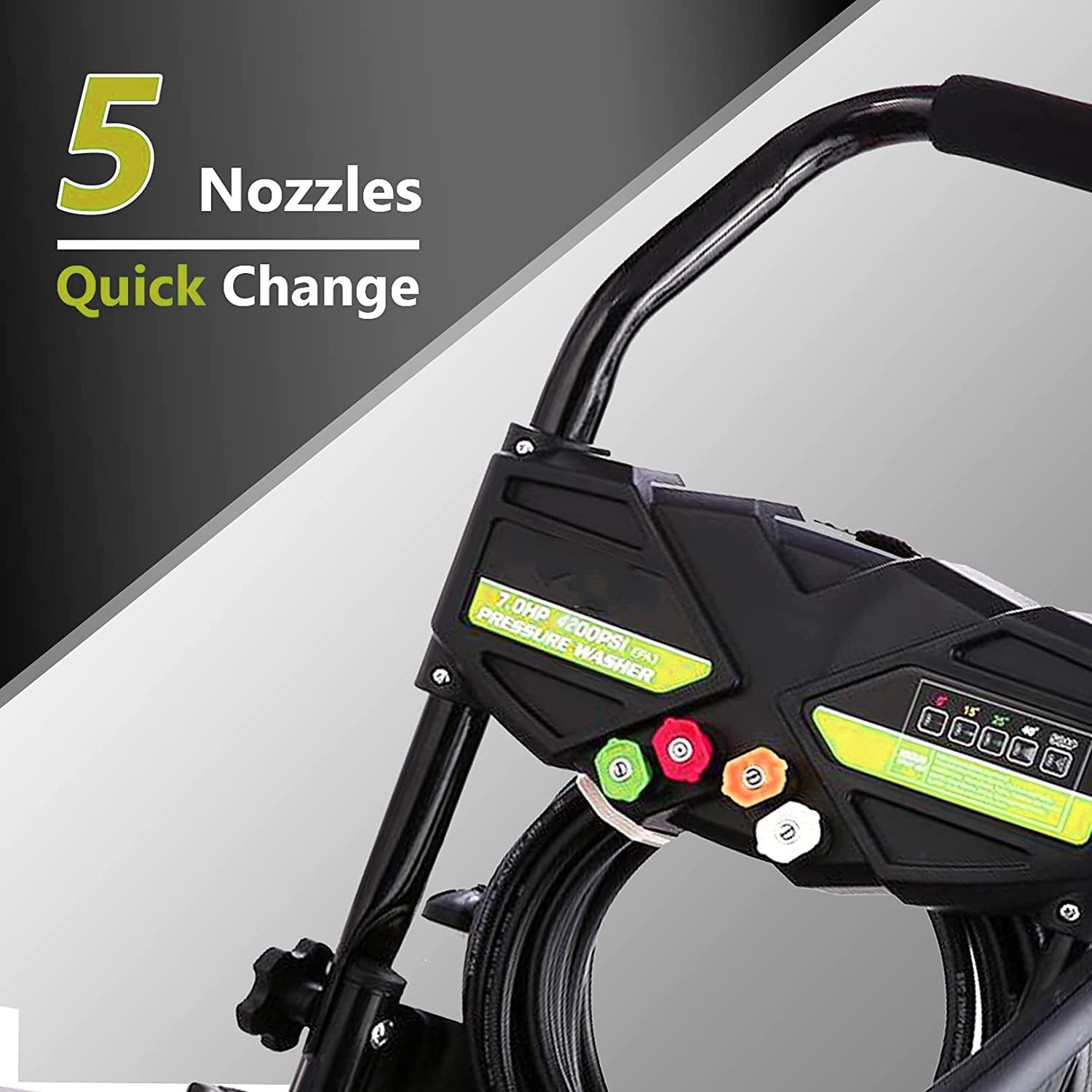 - >>>[5 Quick-connect Nozzles Set]With 0°,15°,25°,40°and Soap Nozzles ,deal with different washing tasks, 0°for ultra pressure,15°for high pressure,25°for medium pressure,40°for low pressure and Soap Nozzles for soap cannon.