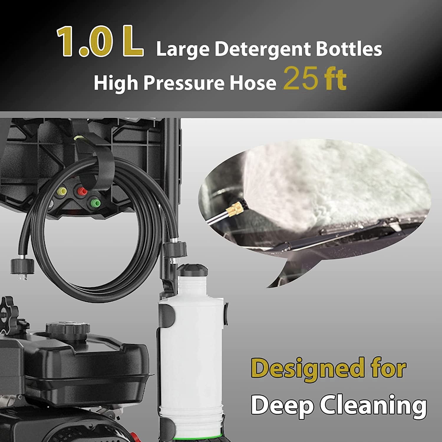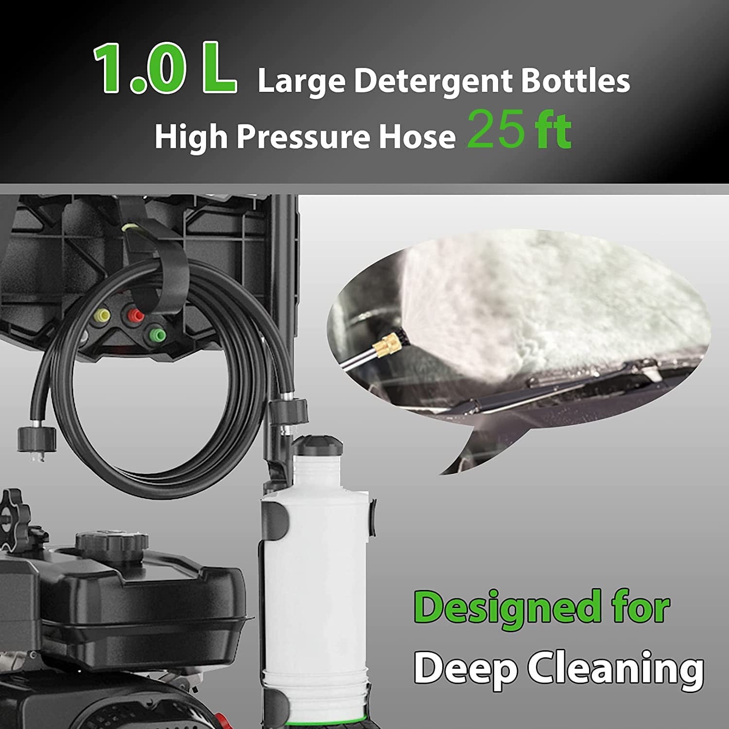 - >>>[Soap Tanks and BIG Wheels]1L soap tank with adjustable switch,detergent can automatically mix with water!And adjust the proportion as you want.Big Steady Rubber Wheels let the pressure washer move easily!>>>Easier to Move: Equipped with big wheels and two 0.7L soap tank. The big Steady Rubber Wheels let the pressure washer move easily! The detergent can automatically mix with water by adjustable switch on the soap tank, then you can upgrade your cleaning job.