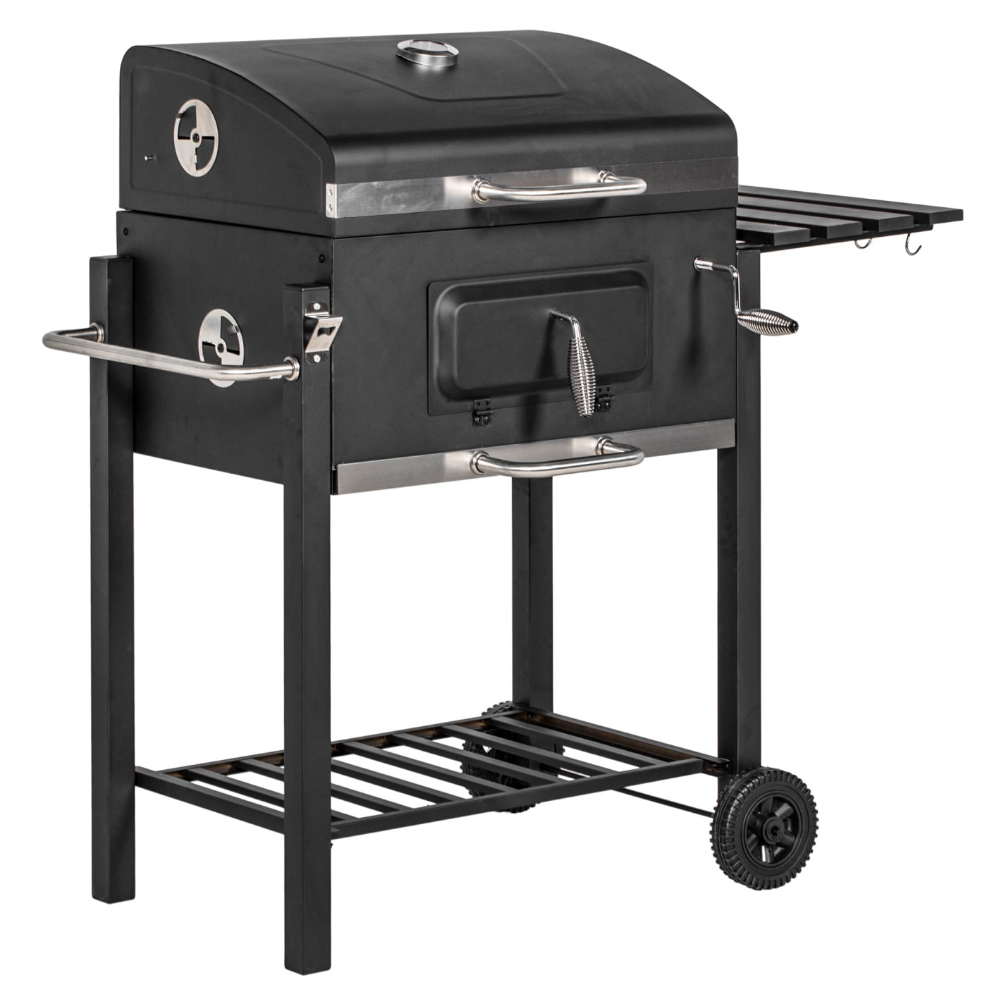 • [Control the Charcoal] Featuring a lid, adjustable vents, and charcoal pan that manually moves up and down, our BBQ grill keeps you in control. A thermometer on the front keeps you informed as you hold in heat to get your food just right.