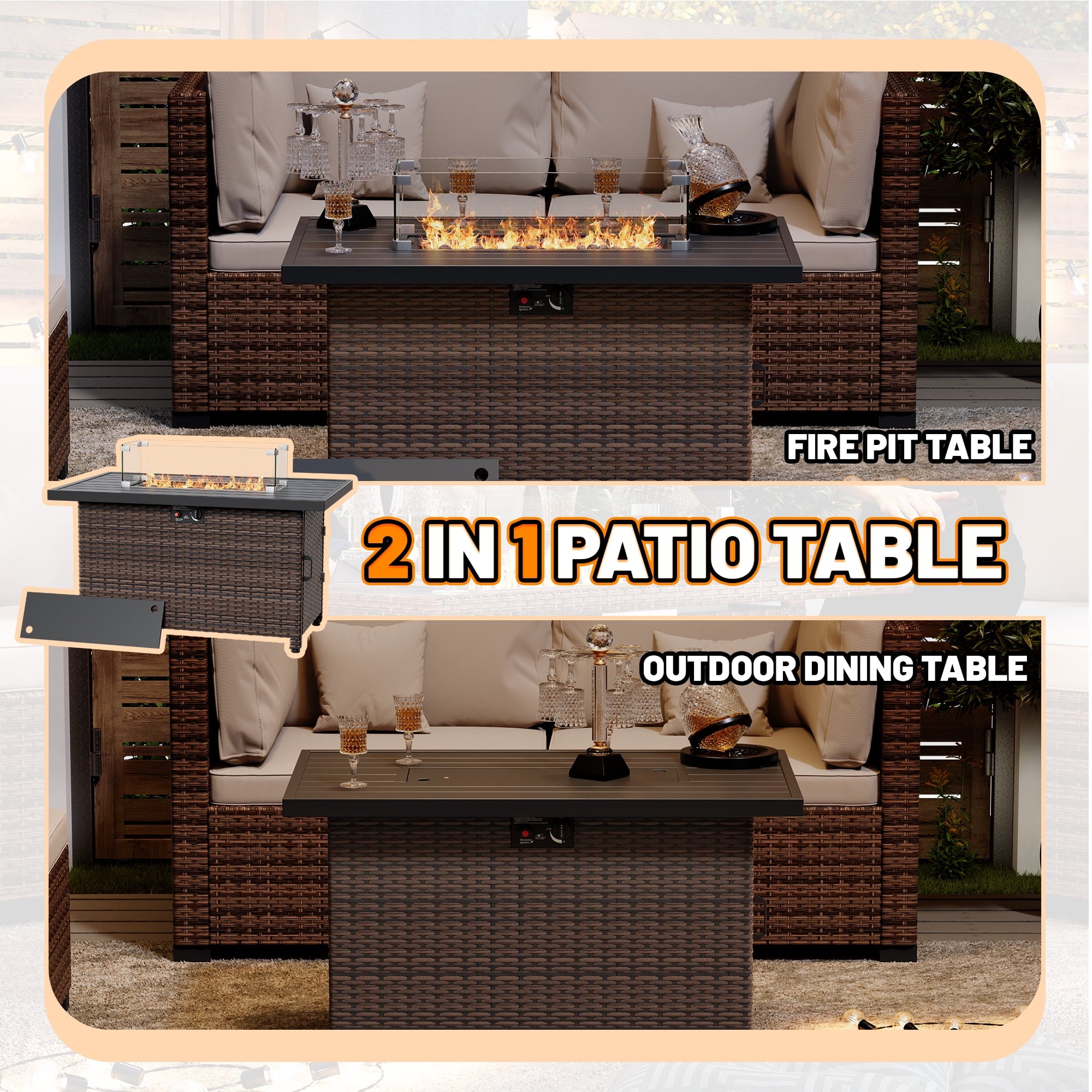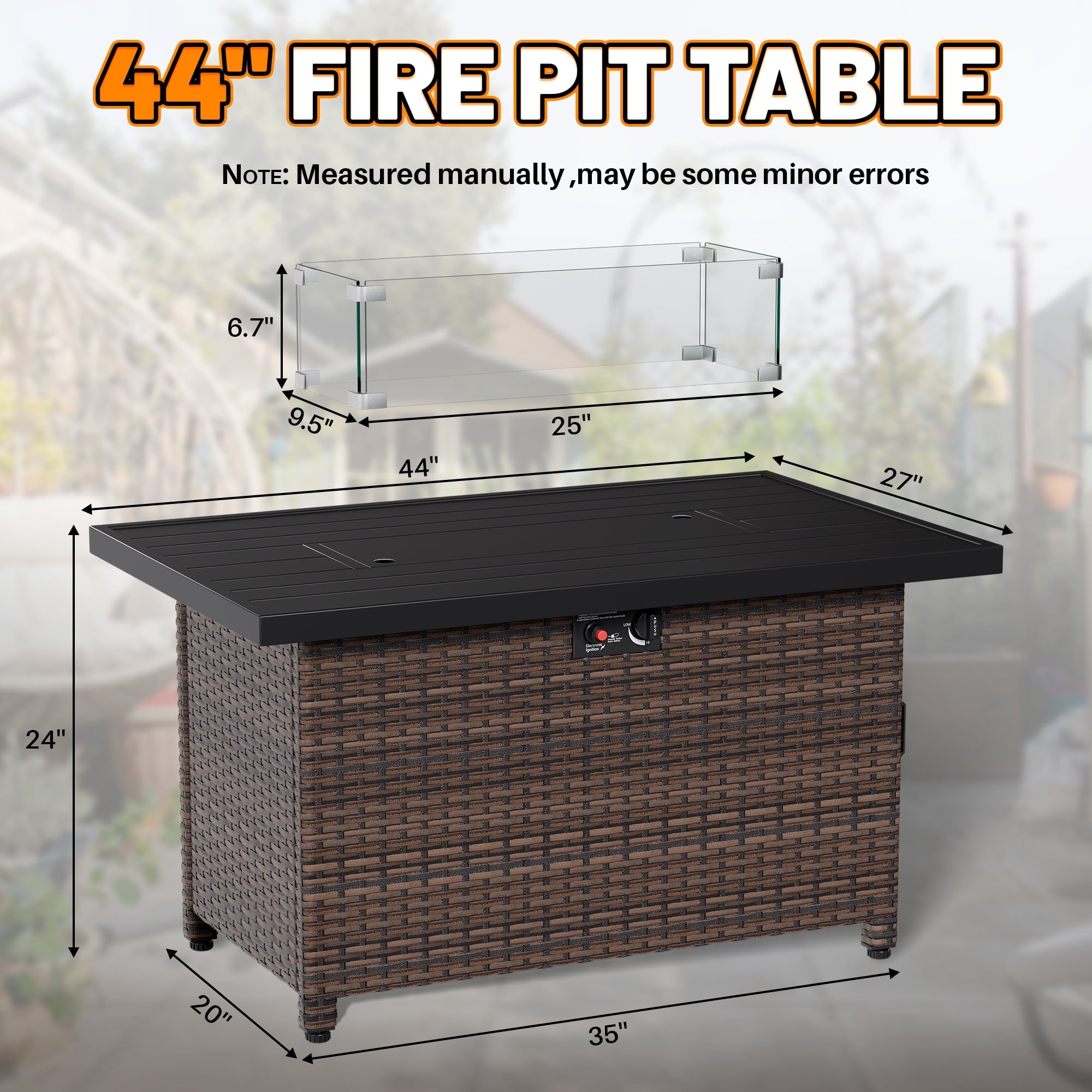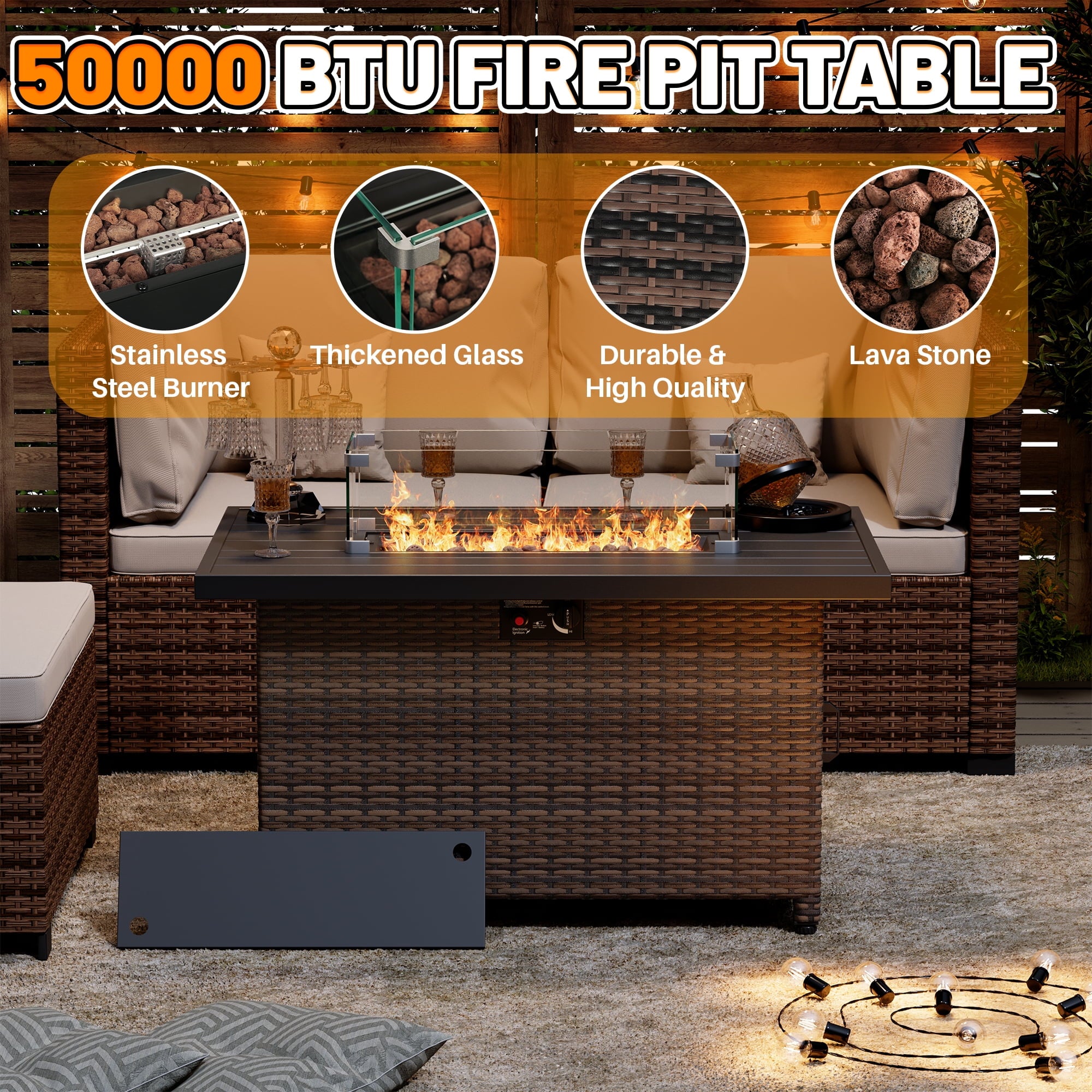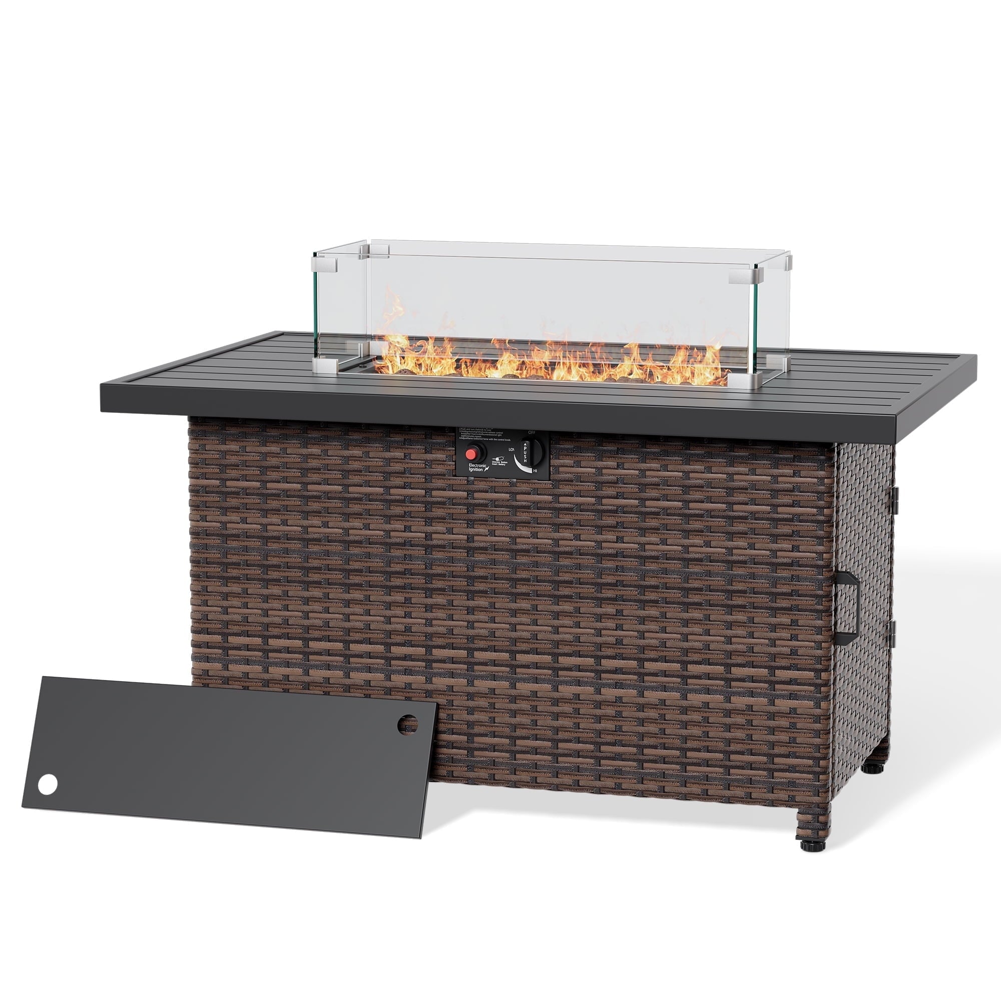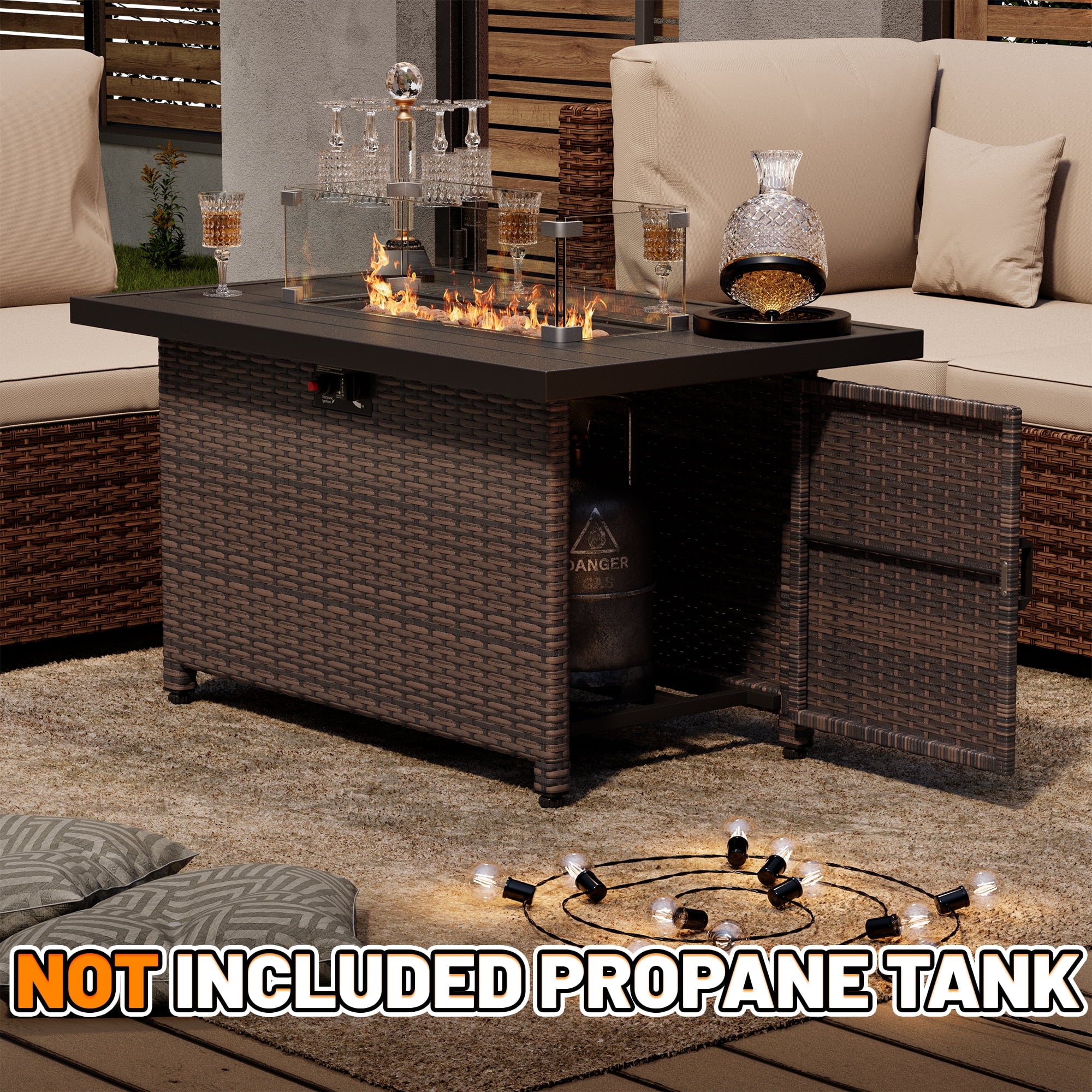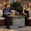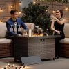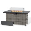 Transform your outdoor space with the 44 Inch Outdoor Wicker Fire Pit Table. This stylish and functional fire pit table features a powerful 50,000 BTU propane burner, providing ample warmth for your patio or garden gatherings. The elegant wicker design adds a touch of sophistication to any outdoor decor, while the included glass wind guard and lid ensure safety and convenience.