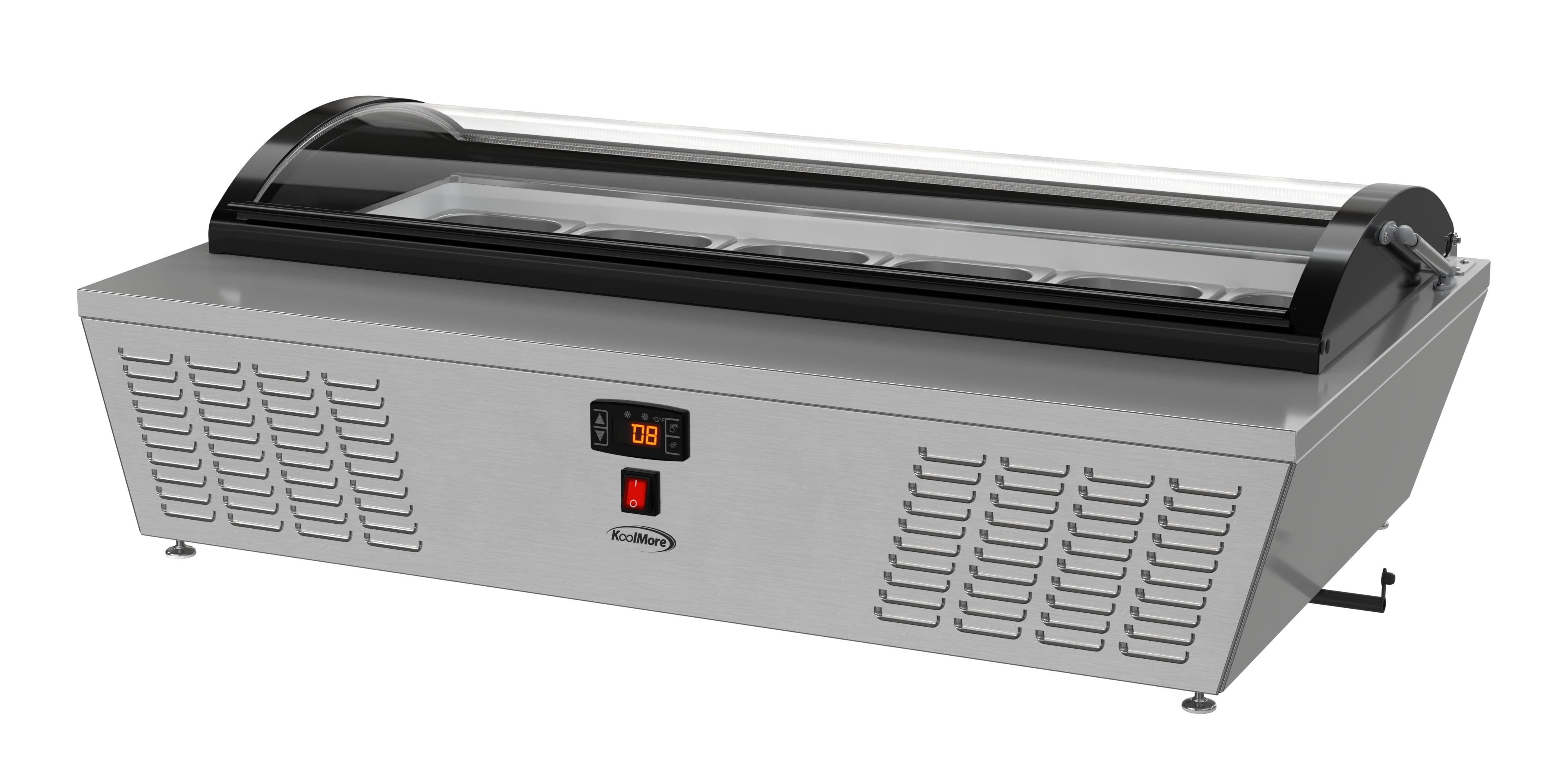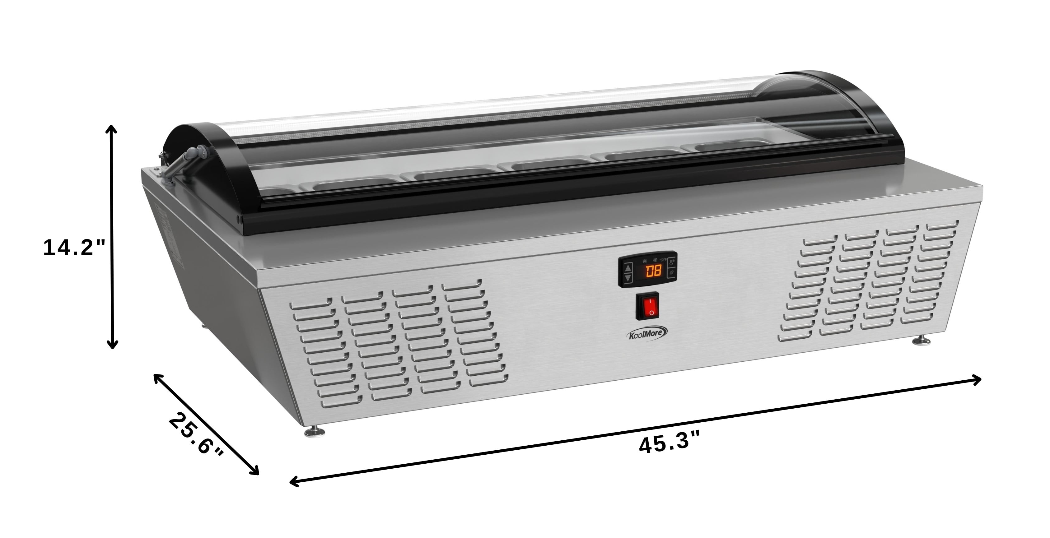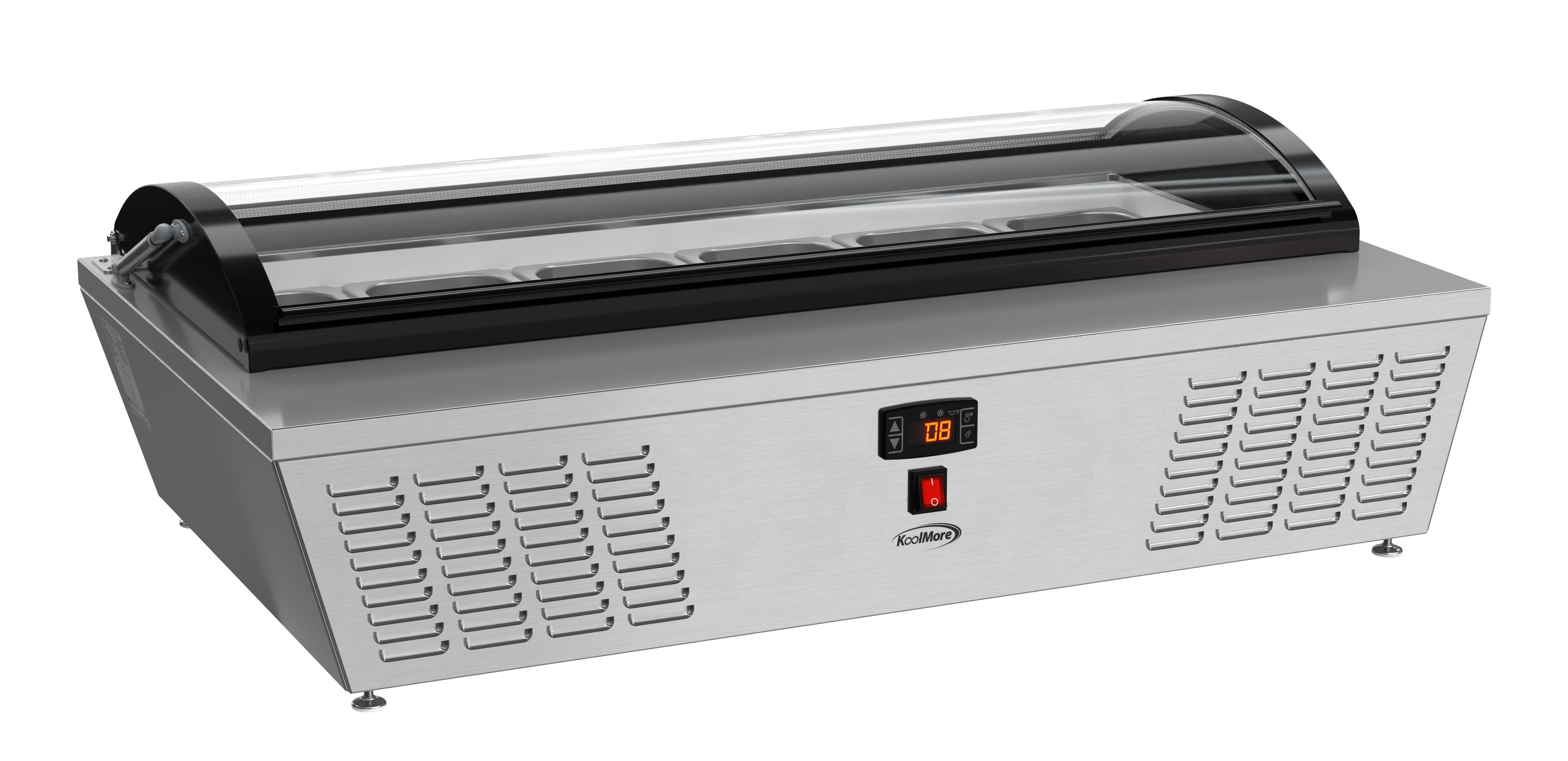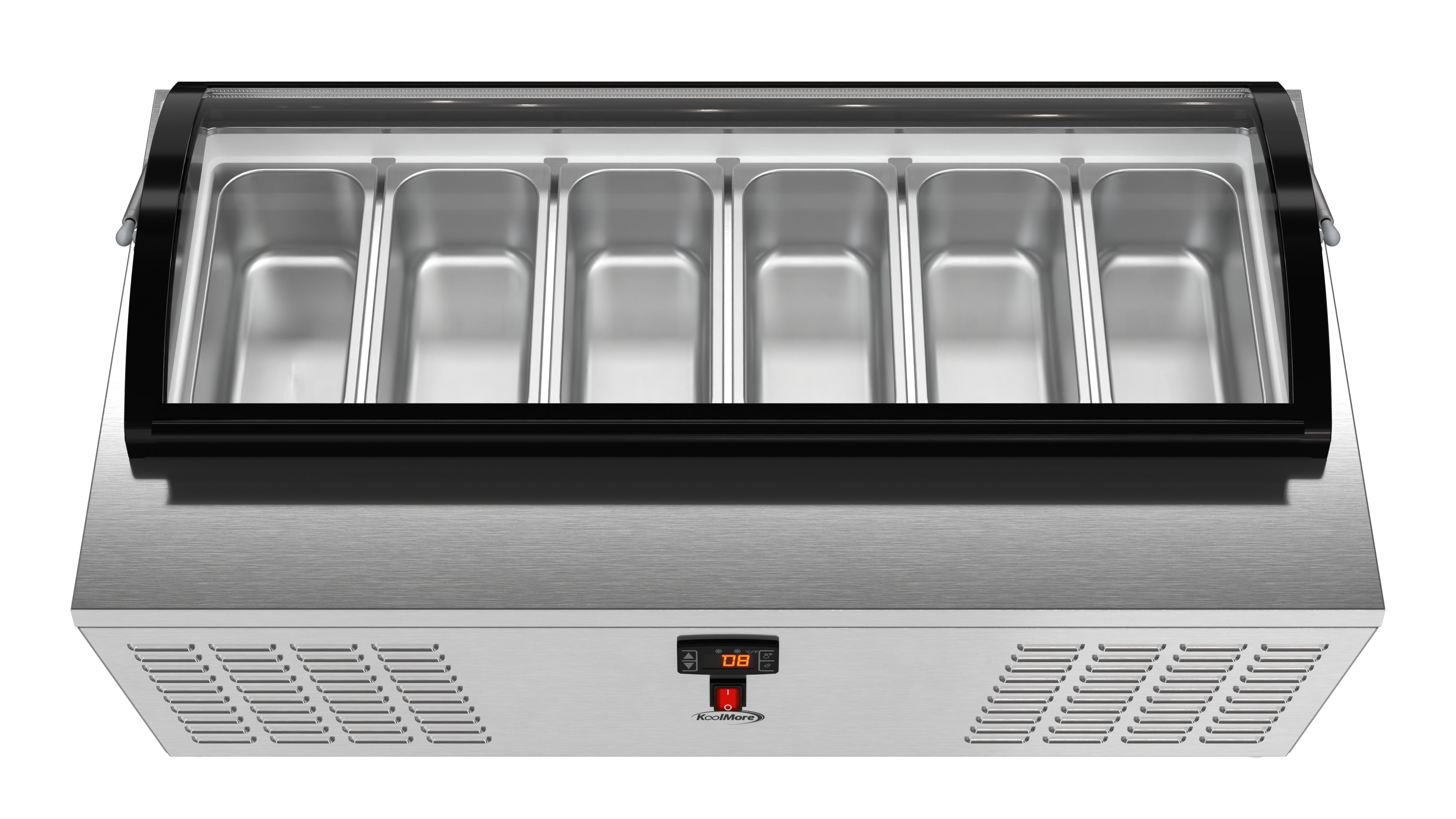 KoolMore 45 in. Countertop Ice Cream Display Freezer with Curved Glass Top with 6 Pans The 45-inch Countertop Ice Cream Freezer is a stylish and functional solution for ice cream shops, cafés, and food service venues. With a static cooling system that preserves frozen goods at an ideal temperature range of 7.6°F to 10.4°F, this freezer ensures the best quality for your ice cream and desserts. Its stainless-steel body and double-tempered glass construction promise durability and safety, while the curved glass display cover provides clear visibility of products while protecting them from contaminants. The soft-closing cover adds convenience and extends the unit’s lifespan. The freezer comes with six ½ GN pans, allowing you to showcase multiple flavors at once. Its compact countertop design optimizes space, and the energy-efficient operation of 1080 KWH/year reduces costs. The digital temperature control makes it easy to adjust settings, while the plug-and-play installation ensures quick setup. ETL certification guarantees safety and sanitation compliance, making this unit a reliable choice for any establishment. Key Features: Stainless Steel and Double-Tempered Glass Construction: Built with durable stainless steel and double-tempered glass, this unit provides long-lasting performance while ensuring your ice cream and other frozen treats are safely displayed. Static Cooling for Optimal Temperature Control: Featuring a static cooling system that maintains a temperature range of 7.6°F to 10.4°F, this freezer is ideal for preserving ice cream without compromising texture or quality. Digital Temperature Control for Convenience: Easily adjust temperatures with the digital control panel, allowing for precision cooling of ice cream or other frozen goods to keep them fresh and ready for service. Curved Glass Display Cover for Visibility and Protection: The elegant curved glass display cover not only showcases your ice cream but also protects it from external contaminants, enhancing both hygiene and visual appeal. Compact Countertop Design for Space Optimization: Designed for countertop use, this compact freezer fits seamlessly into small spaces, making it ideal for cafés, ice cream parlors, or food trucks. Soft-Closing Cover for Durability: The soft-closing feature ensures smooth operation, preventing slams that could damage the unit or the frozen contents, ensuring a longer lifespan for both. Six ½ GN Pans for Serving Variety: Comes equipped with six ½ GN-sized pans, allowing you to display multiple flavors of ice cream, making it easier for customers to choose and for staff to serve. Energy Efficient with Low Consumption: Operating at just 1080 KWH/year, this unit is designed to save on energy costs, making it both environmentally friendly and economical for daily operations. Easy Setup with Plug-and-Play Installation: Featuring a standard NEMA 5-15P plug and a 94.5-inch cord, this freezer is quick and simple to install, reducing setup time in busy commercial kitchens. Stable Countertop Placement : Featuring 4 adjustable plastic feet, this countertop ice cream display freezer provides reliable stability, ensuring it remains securely in place on any surface while offering flexibility for various setups. ETL Certified and 1 Year Manufacturer’s Warranty: Built to meet stringent ETL safety standards, guaranteeing reliable performance, and backed by a comprehensive 1-year warranty covering parts and labor, ensuring support and service should you require assistance.