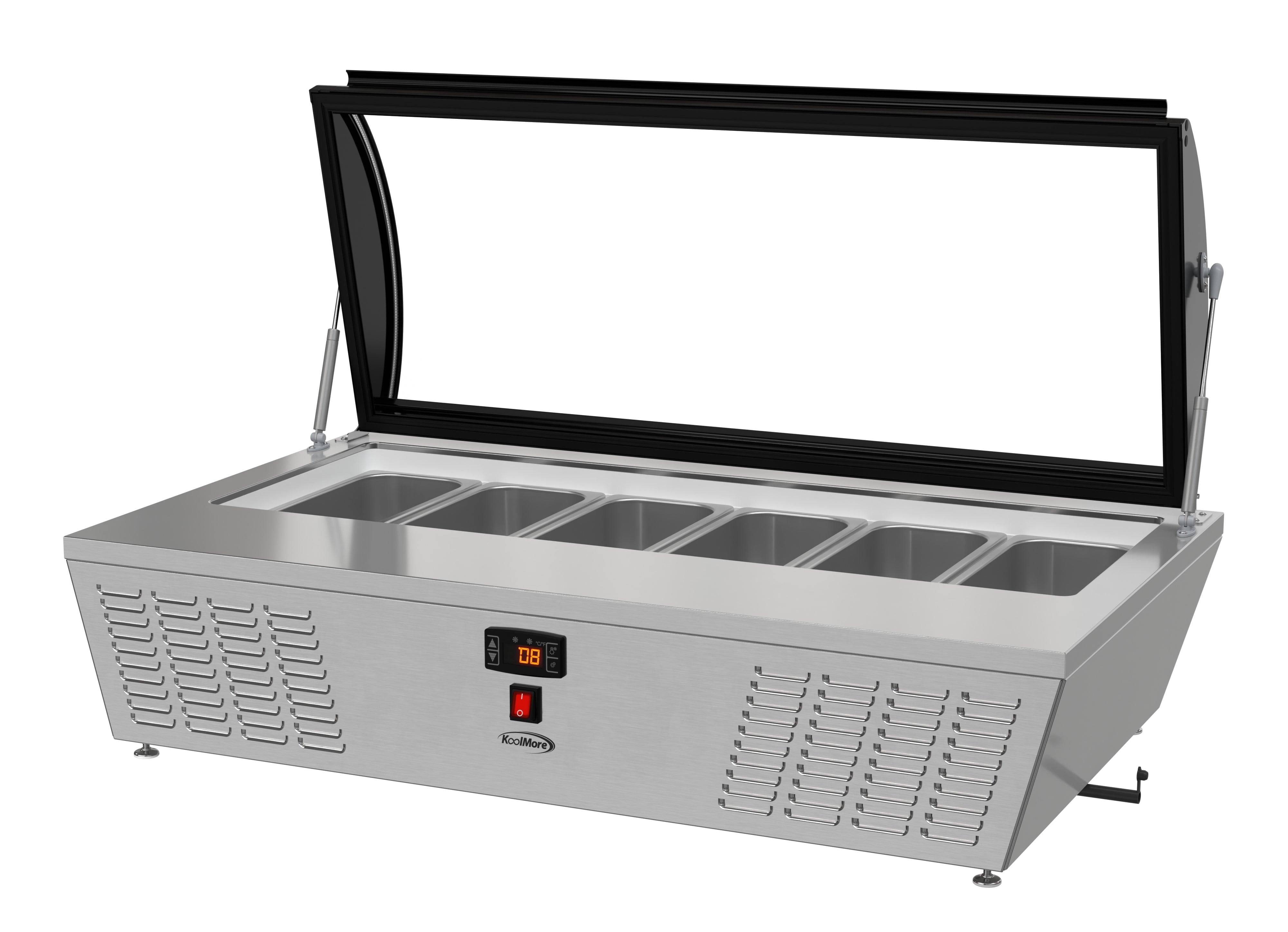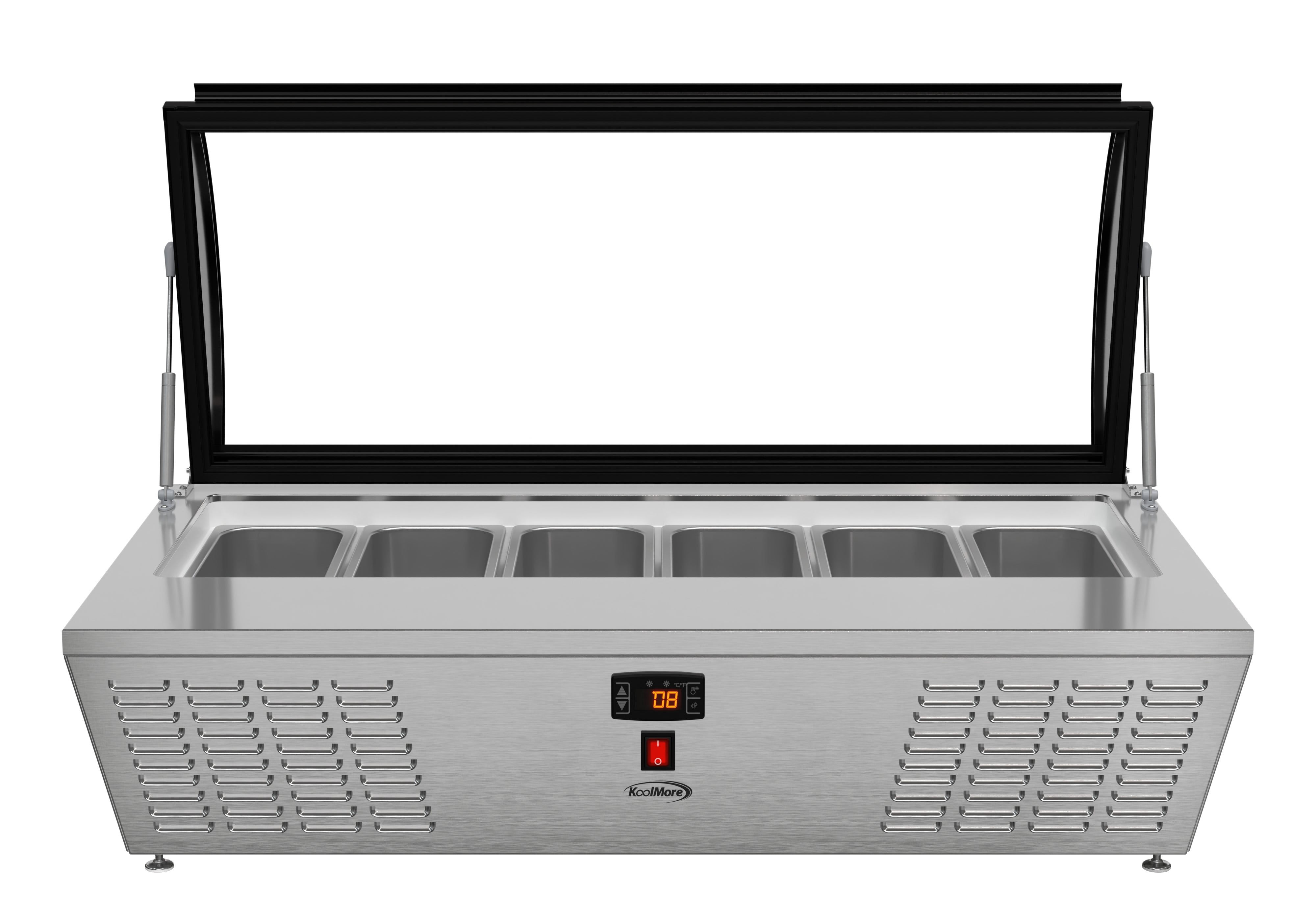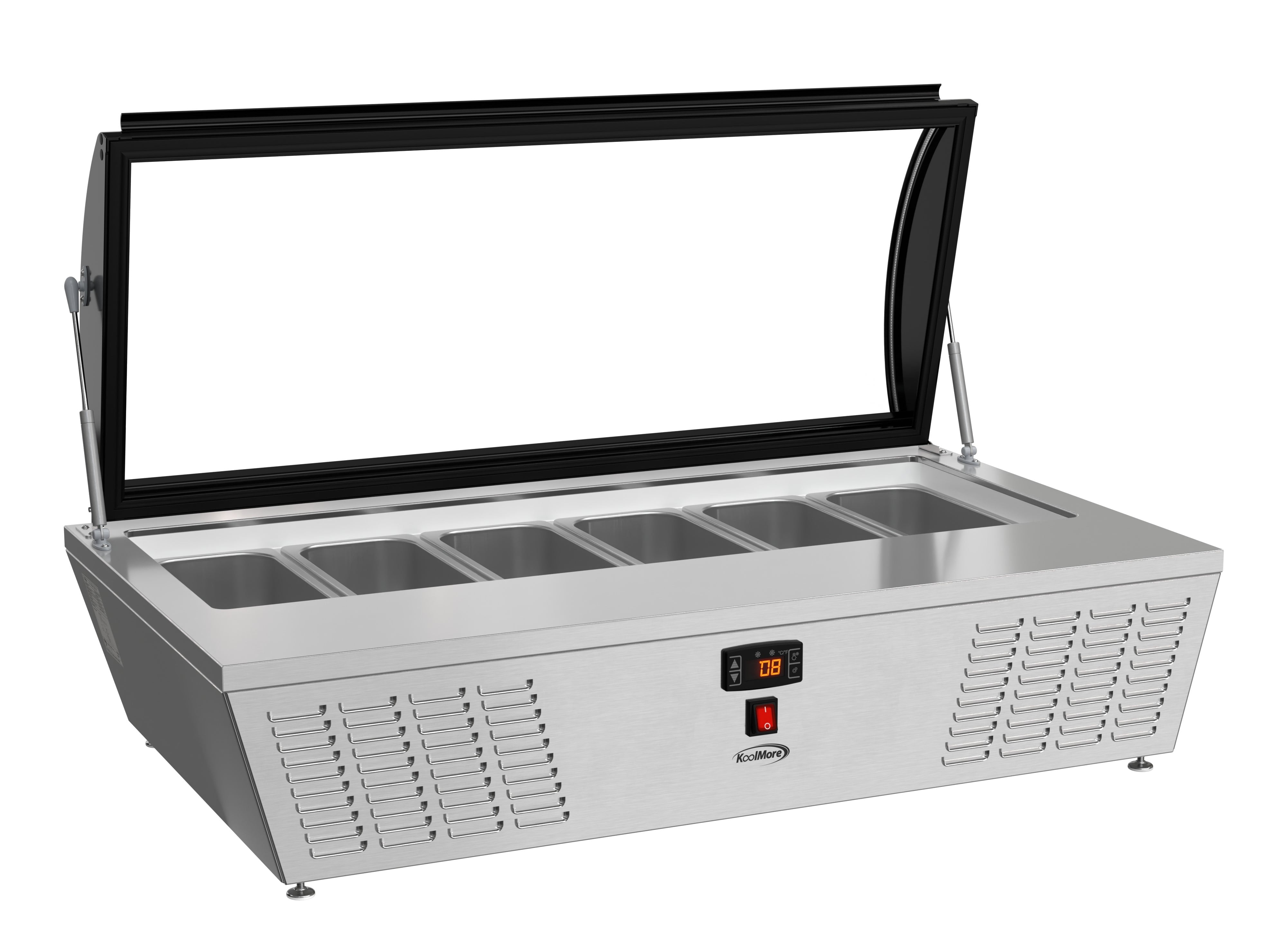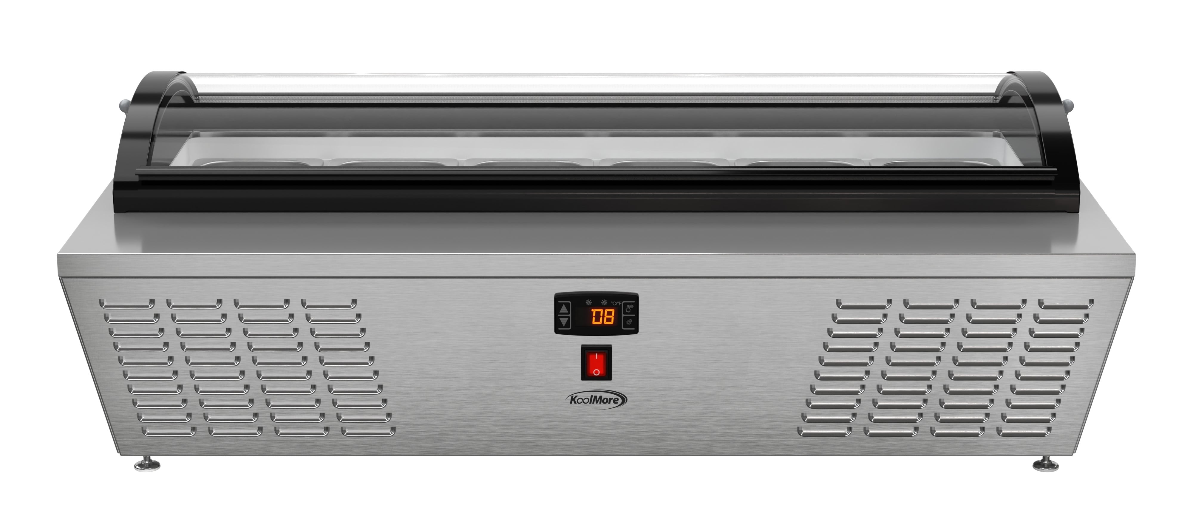 KoolMore 45 in. Countertop Ice Cream Display Freezer with Curved Glass Top with 6 Pans The 45-inch Countertop Ice Cream Freezer is a stylish and functional solution for ice cream shops, cafés, and food service venues. With a static cooling system that preserves frozen goods at an ideal temperature range of 7.6°F to 10.4°F, this freezer ensures the best quality for your ice cream and desserts. Its stainless-steel body and double-tempered glass construction promise durability and safety, while the curved glass display cover provides clear visibility of products while protecting them from contaminants. The soft-closing cover adds convenience and extends the unit’s lifespan. The freezer comes with six ½ GN pans, allowing you to showcase multiple flavors at once. Its compact countertop design optimizes space, and the energy-efficient operation of 1080 KWH/year reduces costs. The digital temperature control makes it easy to adjust settings, while the plug-and-play installation ensures quick setup. ETL certification guarantees safety and sanitation compliance, making this unit a reliable choice for any establishment. Key Features: Stainless Steel and Double-Tempered Glass Construction: Built with durable stainless steel and double-tempered glass, this unit provides long-lasting performance while ensuring your ice cream and other frozen treats are safely displayed. Static Cooling for Optimal Temperature Control: Featuring a static cooling system that maintains a temperature range of 7.6°F to 10.4°F, this freezer is ideal for preserving ice cream without compromising texture or quality. Digital Temperature Control for Convenience: Easily adjust temperatures with the digital control panel, allowing for precision cooling of ice cream or other frozen goods to keep them fresh and ready for service. Curved Glass Display Cover for Visibility and Protection: The elegant curved glass display cover not only showcases your ice cream but also protects it from external contaminants, enhancing both hygiene and visual appeal. Compact Countertop Design for Space Optimization: Designed for countertop use, this compact freezer fits seamlessly into small spaces, making it ideal for cafés, ice cream parlors, or food trucks. Soft-Closing Cover for Durability: The soft-closing feature ensures smooth operation, preventing slams that could damage the unit or the frozen contents, ensuring a longer lifespan for both. Six ½ GN Pans for Serving Variety: Comes equipped with six ½ GN-sized pans, allowing you to display multiple flavors of ice cream, making it easier for customers to choose and for staff to serve. Energy Efficient with Low Consumption: Operating at just 1080 KWH/year, this unit is designed to save on energy costs, making it both environmentally friendly and economical for daily operations. Easy Setup with Plug-and-Play Installation: Featuring a standard NEMA 5-15P plug and a 94.5-inch cord, this freezer is quick and simple to install, reducing setup time in busy commercial kitchens. Stable Countertop Placement : Featuring 4 adjustable plastic feet, this countertop ice cream display freezer provides reliable stability, ensuring it remains securely in place on any surface while offering flexibility for various setups. ETL Certified and 1 Year Manufacturer’s Warranty: Built to meet stringent ETL safety standards, guaranteeing reliable performance, and backed by a comprehensive 1-year warranty covering parts and labor, ensuring support and service should you require assistance.