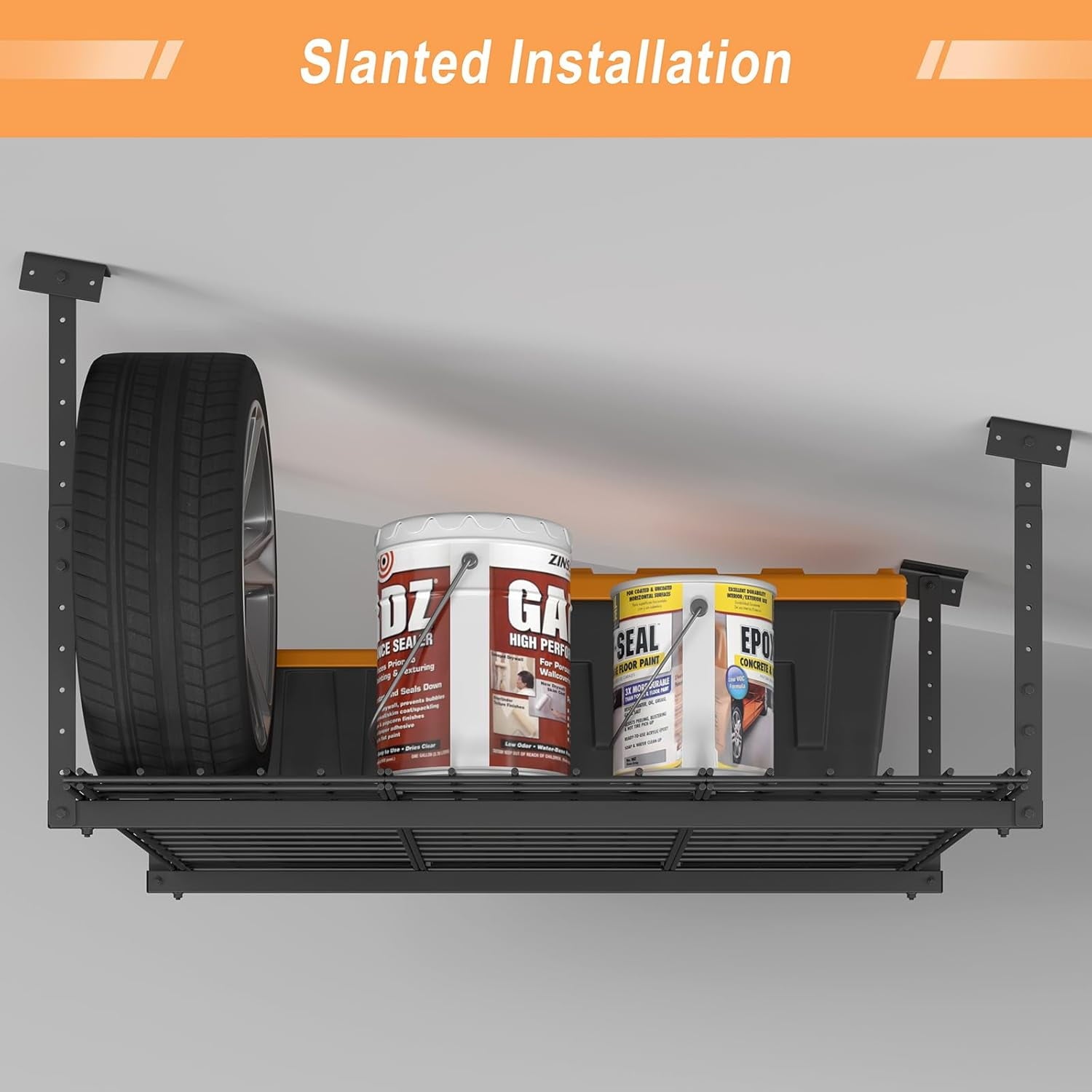 • 🏆【Heavy-Duty 250 lbs Capacity】- Crafted with industrial-grade cold-rolled steel, our garage ceiling storage rack securely holds up to 250 lbs. Perfect for bulky seasonal items, toolboxes and outdoor gear.