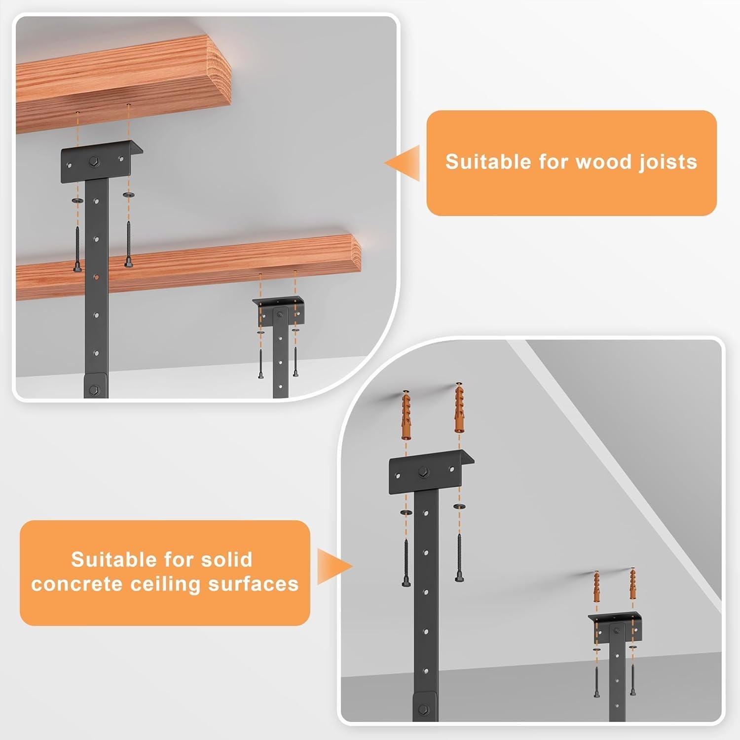 • 🔧【Quick Installation】- On any Ceiling Joists ≤42″. Pre-drilled universal mounting brackets work with all standard joist spacing. No complex measurements – install this overhead garage storage rack in under 1 hour using basic tools.