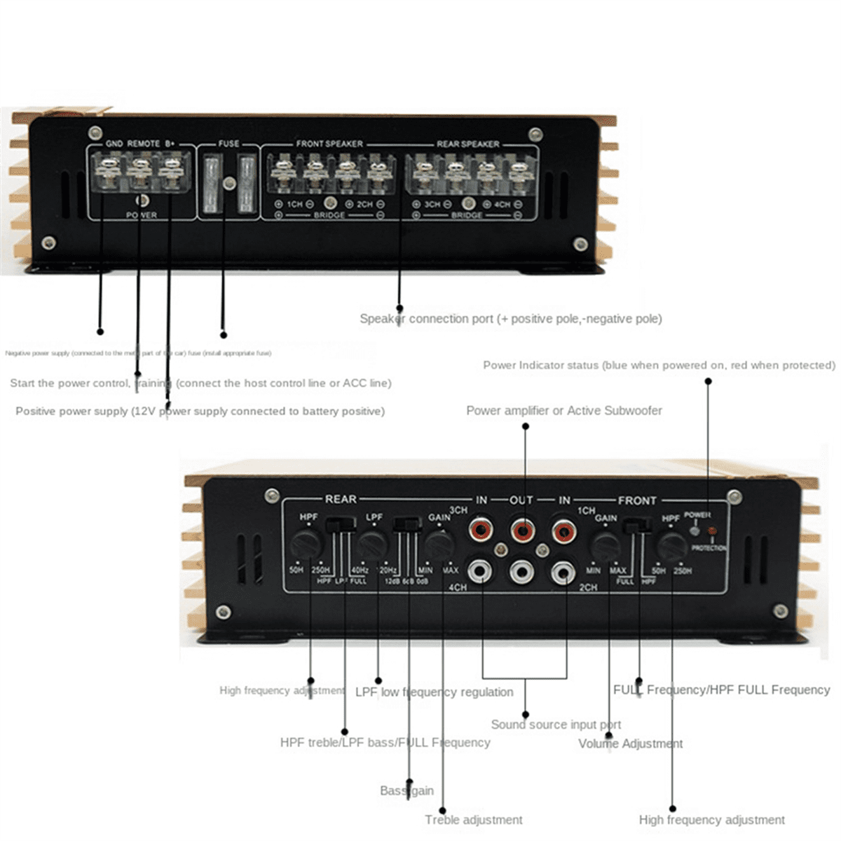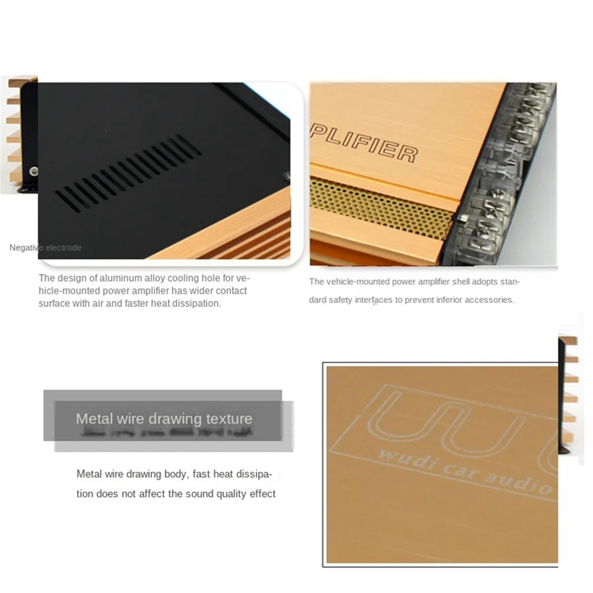 • The car amplifier is designed with aluminum alloy heat dissipation holes, which has a contact with the air and faster heat dissipation.