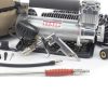 - Comes with vibration-resistant diamond-plate sand tray, 3 inflation tips, 90-degree twist-on air chuck, 45-degree extension chuck, 30-foot air hose with gas-station style inflation gun, 30-foot extension air hose, inline 160-PSI gauge, deluxe carry bag, 40-amp inline fuse holder, and dual battery clamps