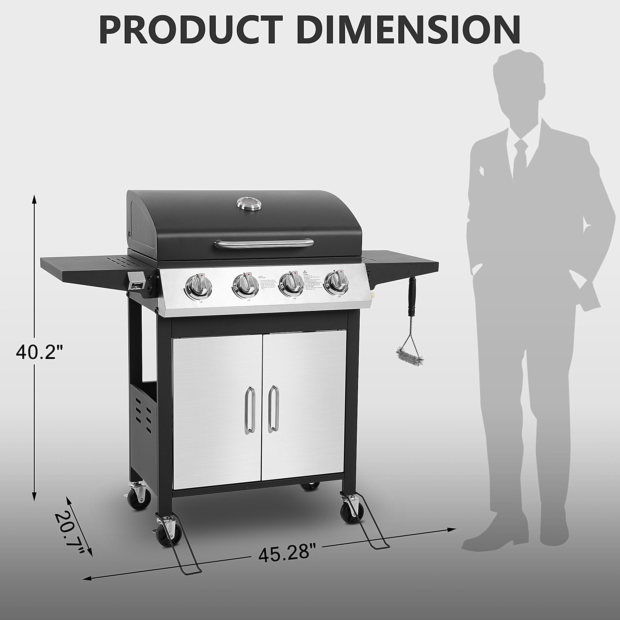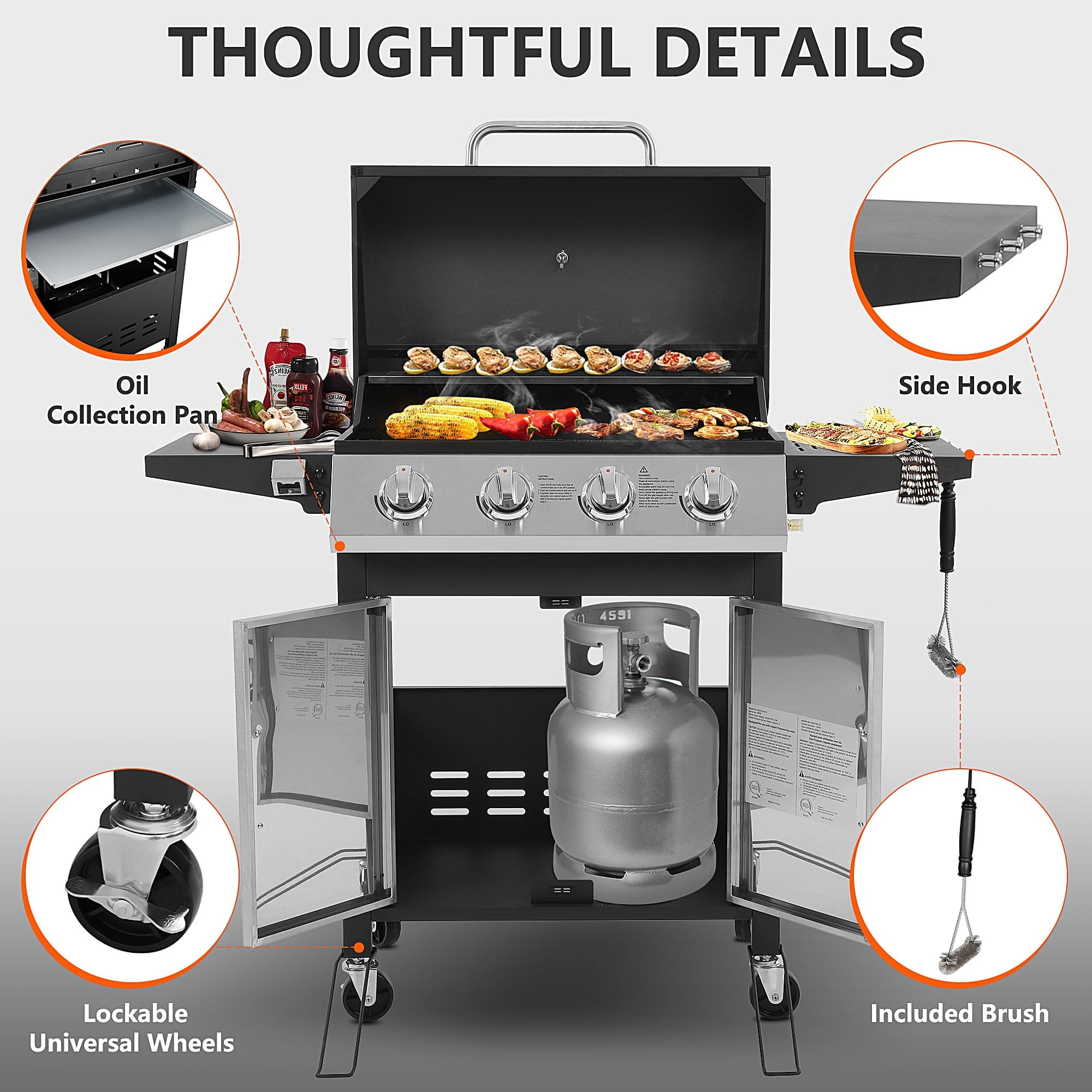 - 【STAINLESS STEEL BURNERS】: This propane gas grill has 4 Stainless Steel burners, can put out 34,200 BTU-per-hour with integrated piezoelectric ignition system, quick start up with the push &turn of a control knob.