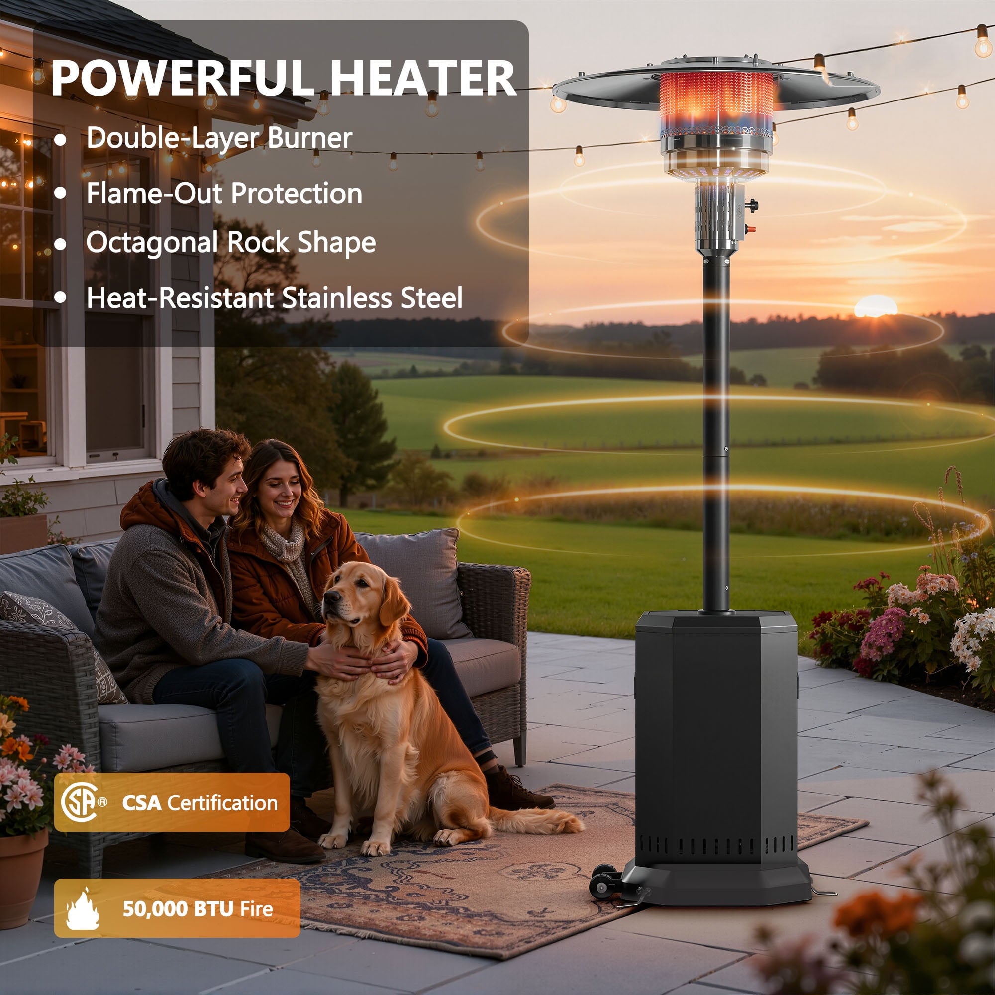 - ☀️Safety Design – The outdoor heater is equipped with an automatic safety shutdown function to ensure that no accident will occur during use.