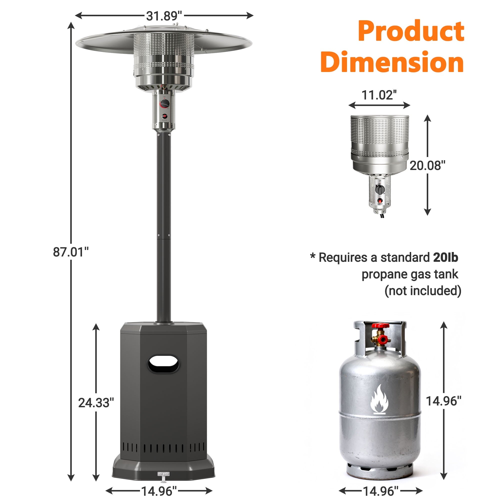 13.Fuel Capacity: 20lbs(18.11”H x Dia.9.84”)