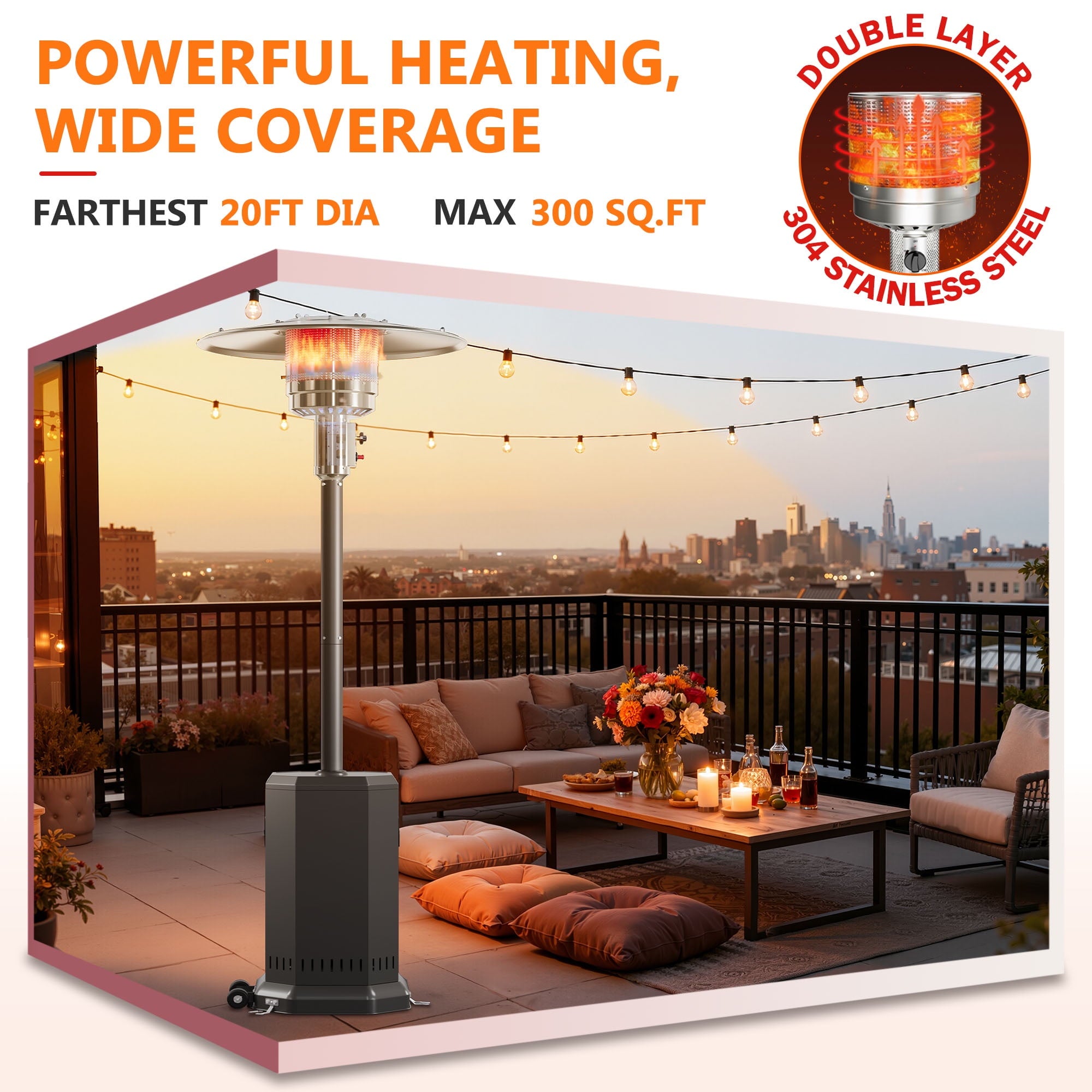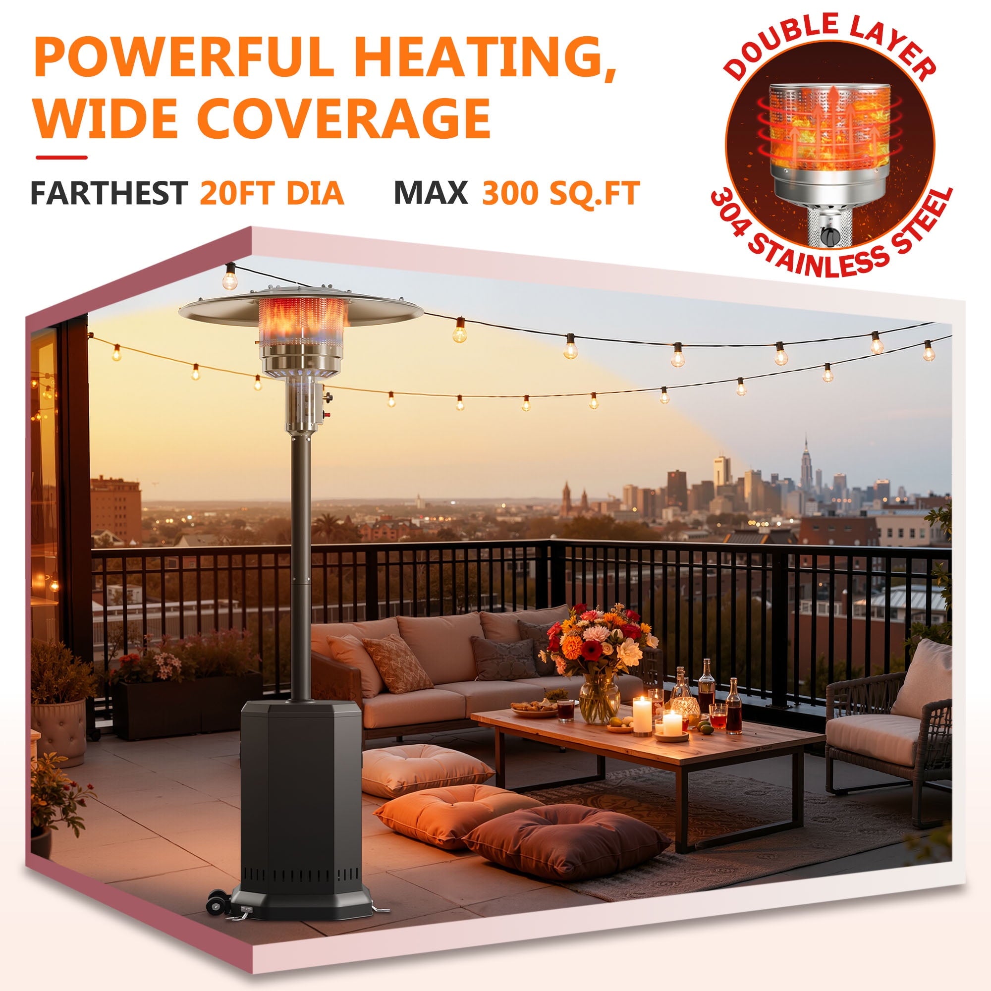 - ☀️Large Warming Range – This 50,000BTU outdoor heater can easily warm up to 314.16 sq.ft When you use the standard 20 lbs. With a propane cylinder, you’ll enjoy 10 hours of continuous warmth with your loved ones.