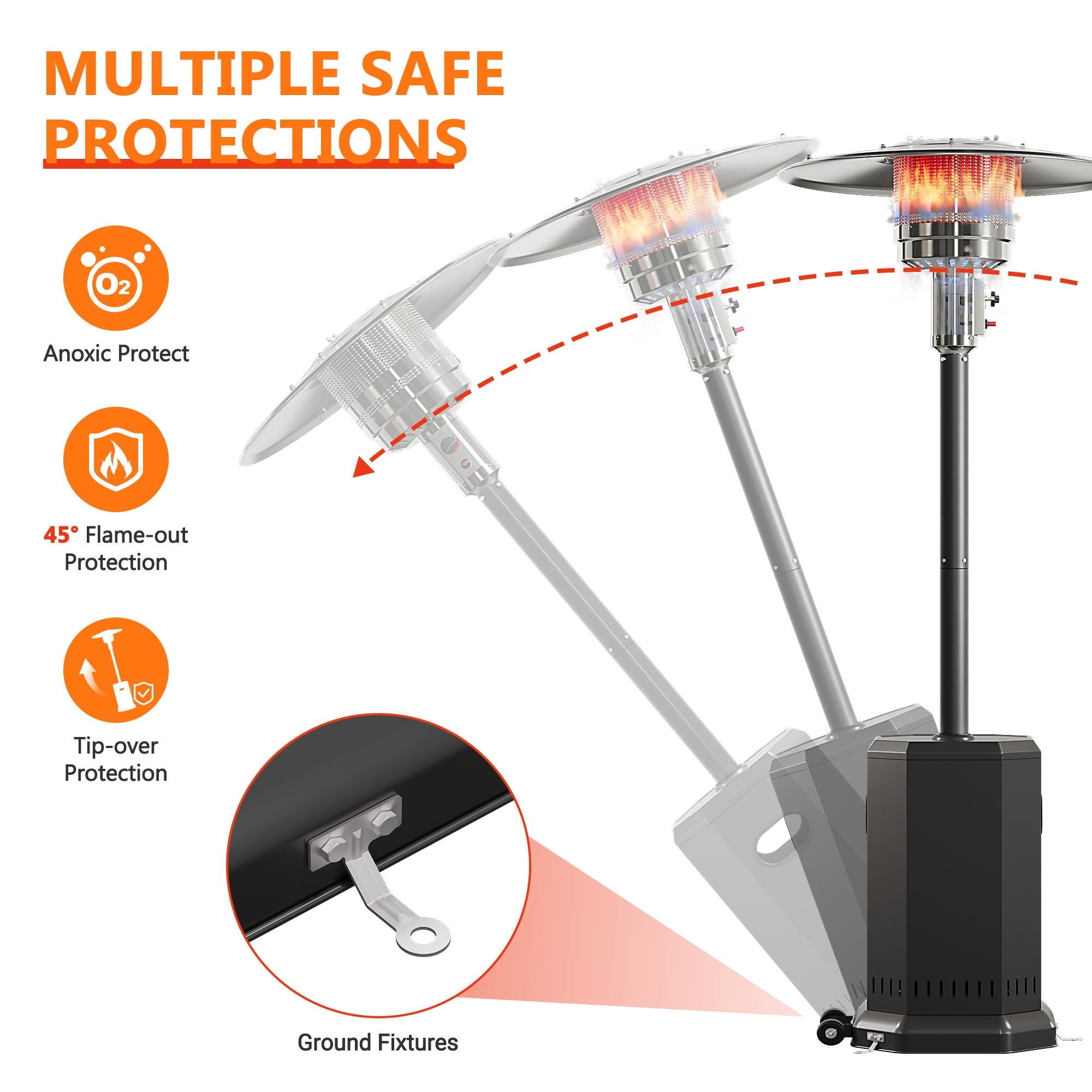 4. Anti-Tilt Safety Device – if the tall heater up to 45°, it will be shut off.