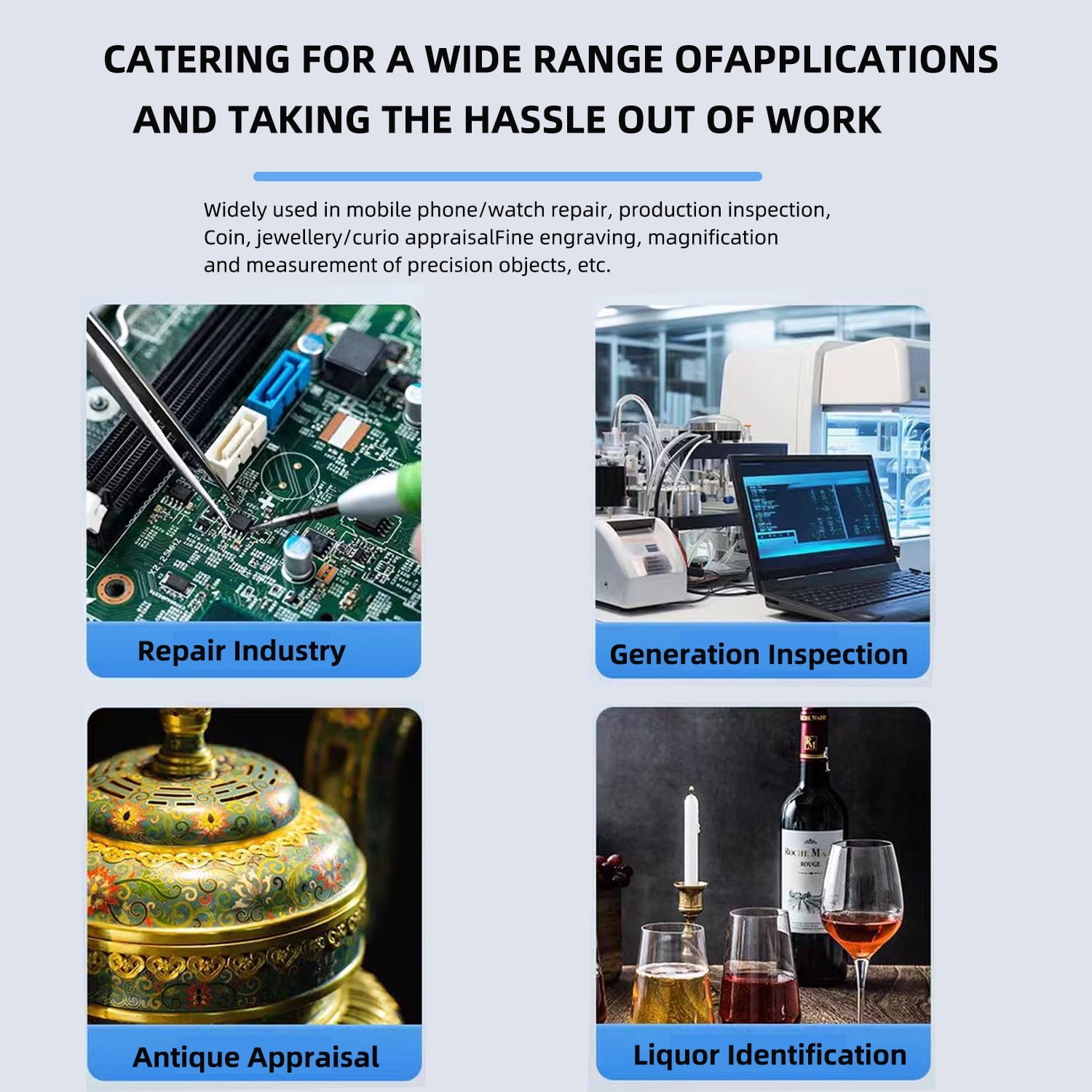 Applicable Scenarios and People: Quality control testing, testing for educational purposes, industrial printing, industrial testing, PCB materials, jewelry and stamp identification, textile industry, biological testing. Can be used by students, adults