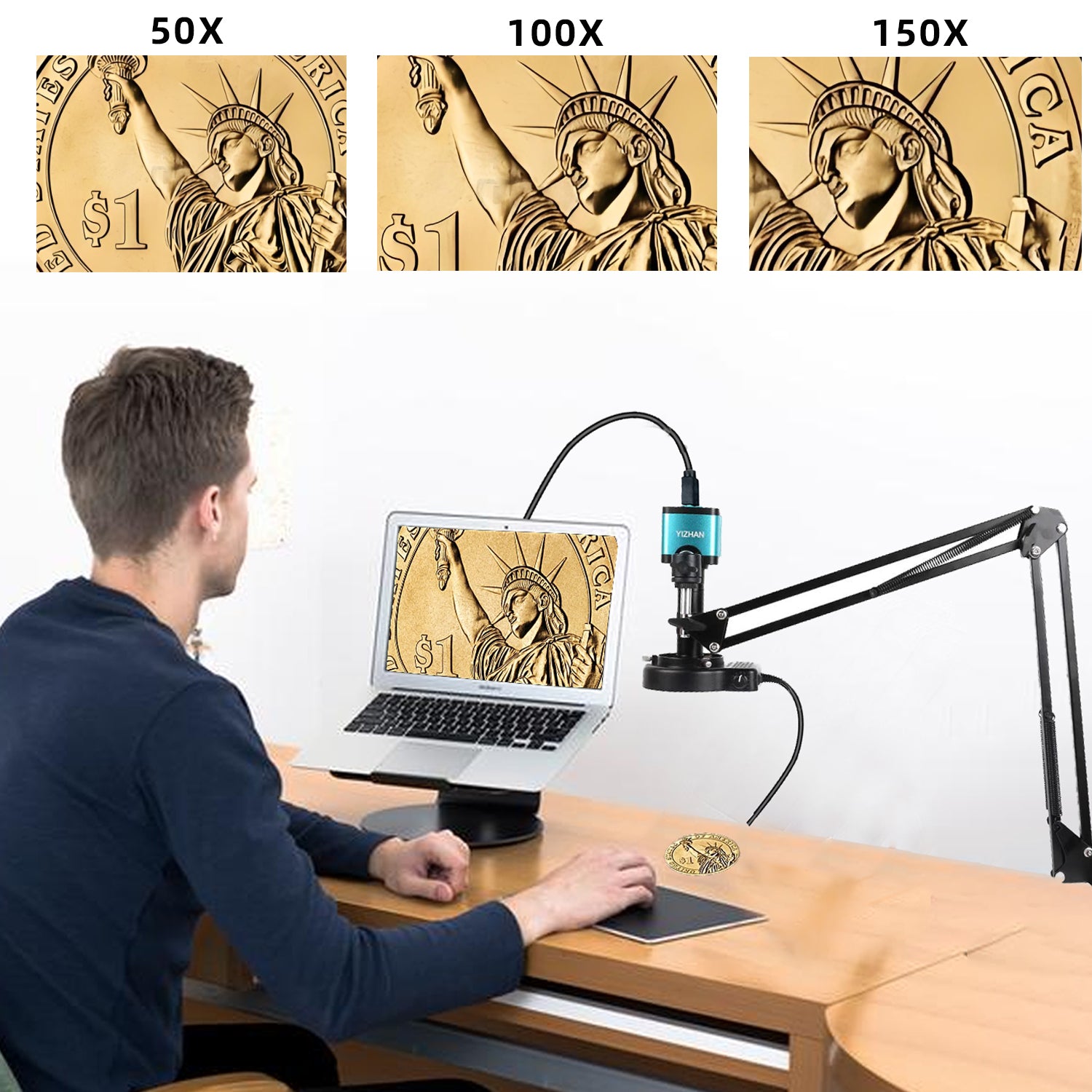 - 150X Zoom C-Mount Lens: The digital microscope adopts 150X Zoom C-mount Lens, the maximum working distance of the lens can reach 1000mm, and the magnification on the display is 1-150X. You can adjust the magnification by the knob on the lens. The industrial microscope is suitable for a variety of work scenarios, such as electronic repair, observation of coins, etc.
