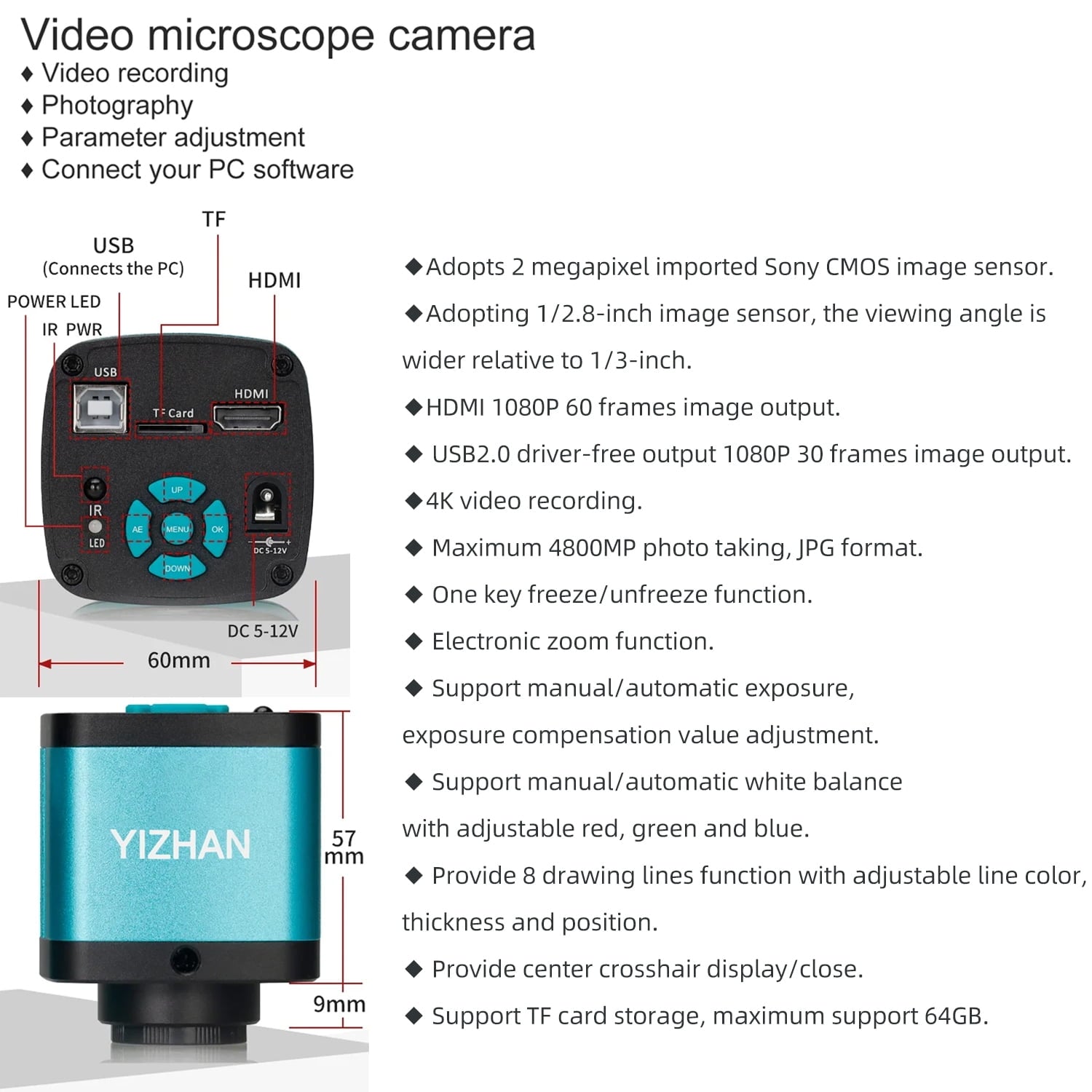 This professional microscope camera supports 4K resolu tion (30 frames per second) and 1080P 60 frames per second image output. It features a standard C/CS interface design and is equipped with a high-sensitivity CMOS sensor. It can achieve high-resolution imaging at 1920*1080. It comes with a remote control that supports remote menu operation, making shooting and viewing more convenient. It supports photo, video, and measurement functions, and can be connected to a computer monitor for synchronized output.