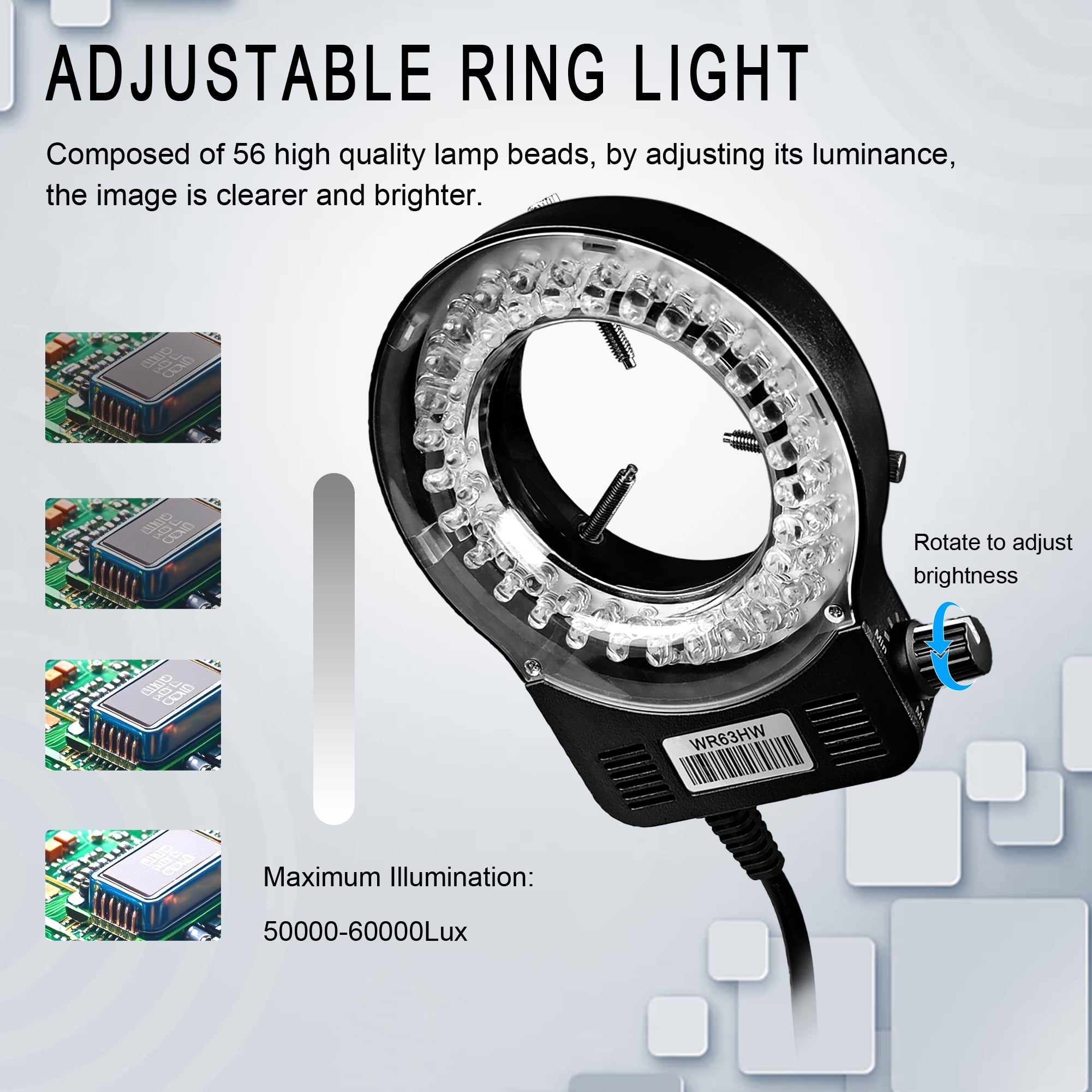- Bright LED Light:The industrial microscope is equipped with a bright LED ring light, the ring light consists of 56 bright LED beads, the color temperature of the light is 6500K-7000K. The ring light can be adjusted to adjust the brightness, and its maximum illuminance is 60,000 Lux. The ring light enables the video microscope to get clearer pictures and videos when working.