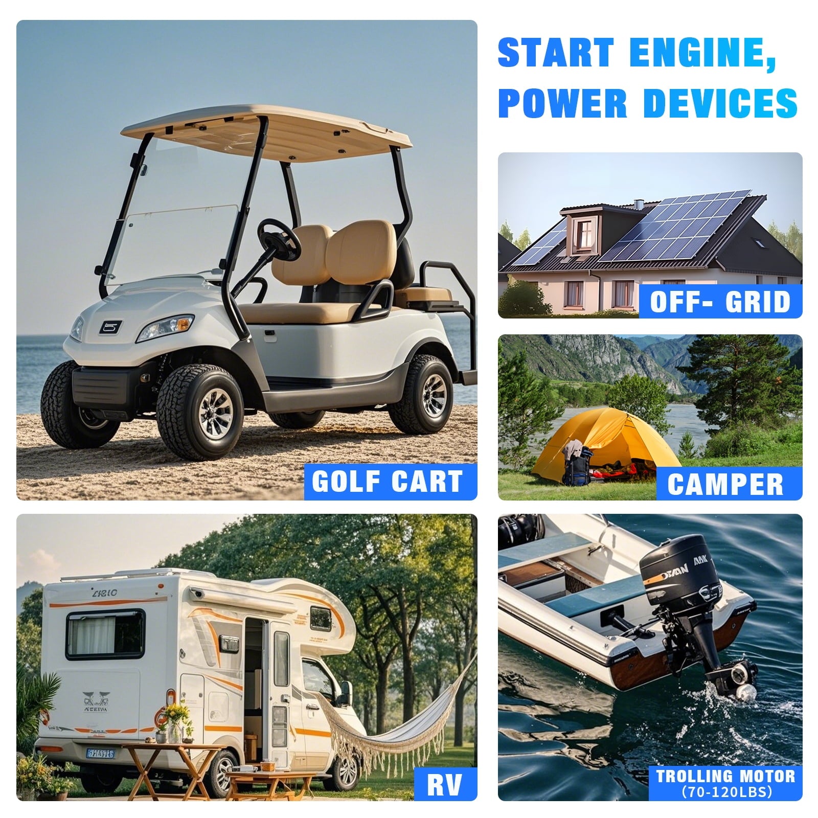 - Designed to power a range of 48V applications including golf carts, like YAMAHA, Club Car, EZ GO, lawnmowers, RVs, trolling motors, marine vessels, and off-grid systems. Its stackable design and easy connectivity make it a space-efficient solution for your storage needs.
