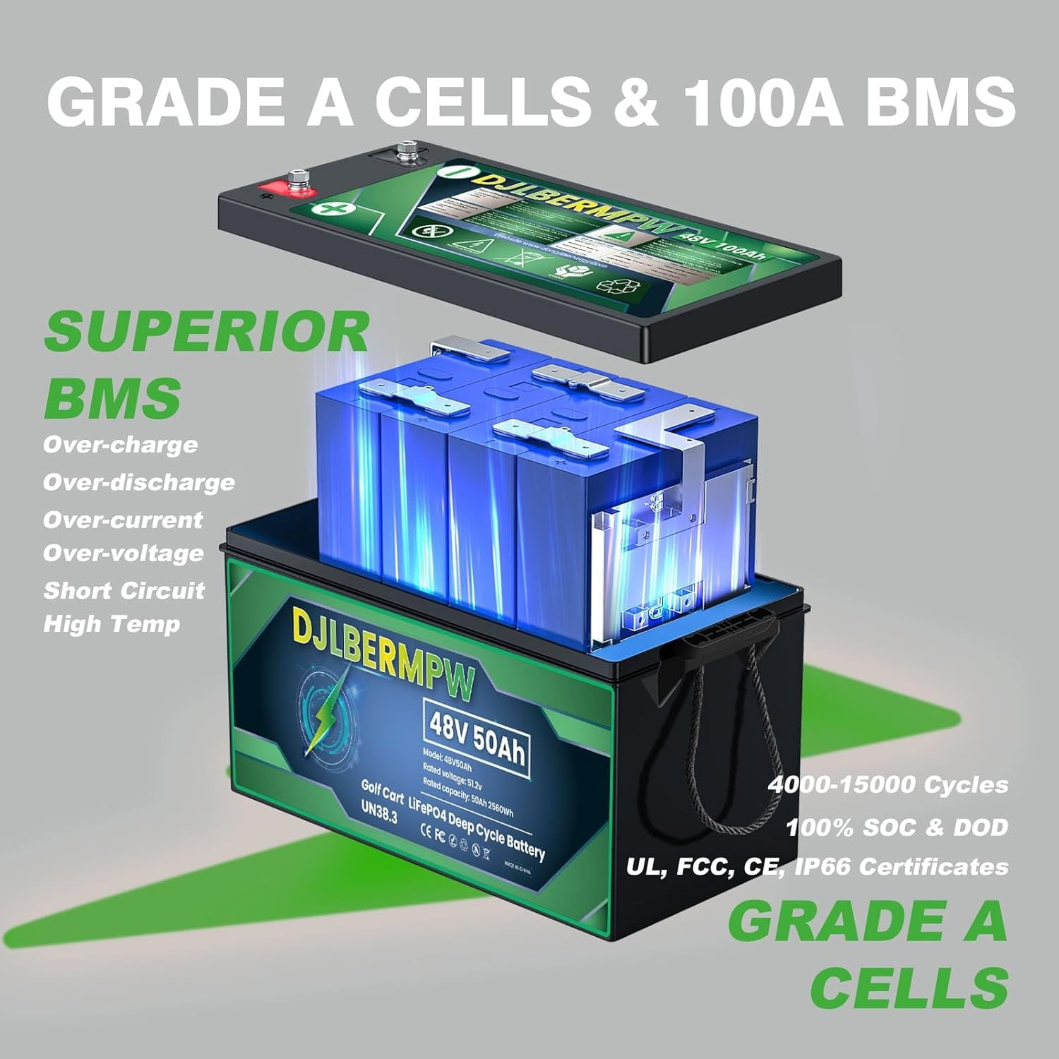- 【100% Grade-A BMS Protection】Highest-level of safety based on UL testing reports for the cells inside the battery and upgraded BMS. Our LiFePO4 battery has built-in 50A BMS to protect it from overcharging, over-discharging, over-current, overheating and short circuits. It has an excellent self-discharge rate, ensuring the LiFePO4 battery’s safety level and optimizing the 48V battery performance.