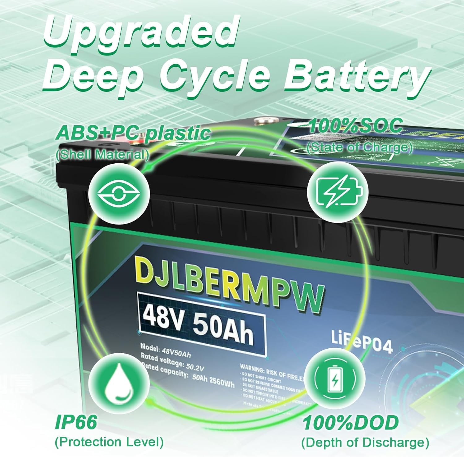 - 【Large Capacity and Lightweight】DJLBERMPW 48V 50Ah LiFePO4 battery LiFePO4 Lithium Battery can support 2560Wh energy for your appliances, only 1/3 the weight of the lead-acid battery at the same capacity, lighter and more portable for you to move or carry it. And our LiFePO4 battery More faster to be fully charged, which makes it easier to use.