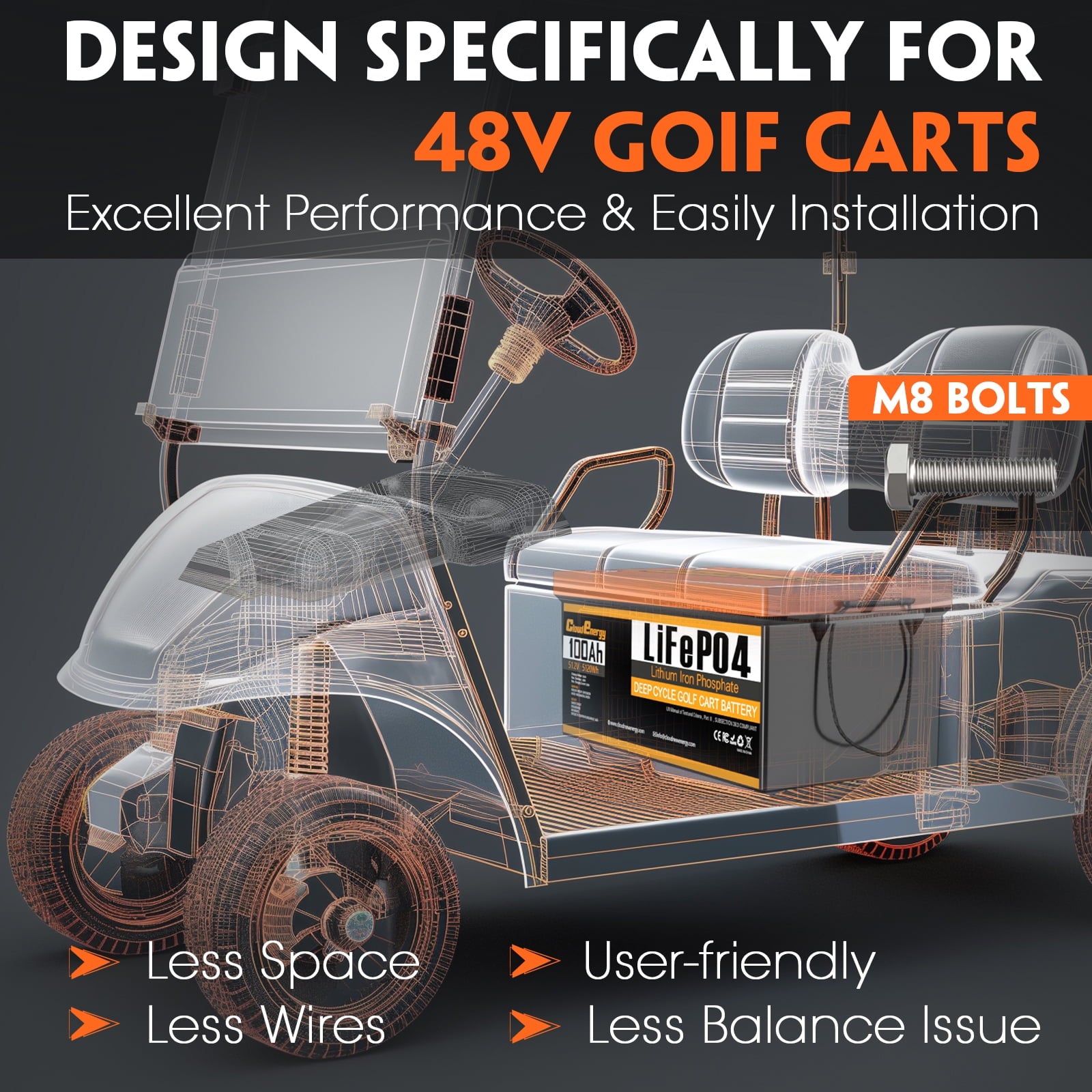 - 【Safe and Reliable Power Source】Cloudenergy golf cart 48V 100Ah batteries are designed for 48V golf carts, utilizing high-density A-grade cells for high energy(Support 2C Discharge) and performance,The battery case is made of ABS, which is fireproof shockproof and IP67,Compatible with all major brands of golf cart controllers on the market,they are ideal for golf carts,electric vehicles,Trolling Motor,marine engines and other applications.