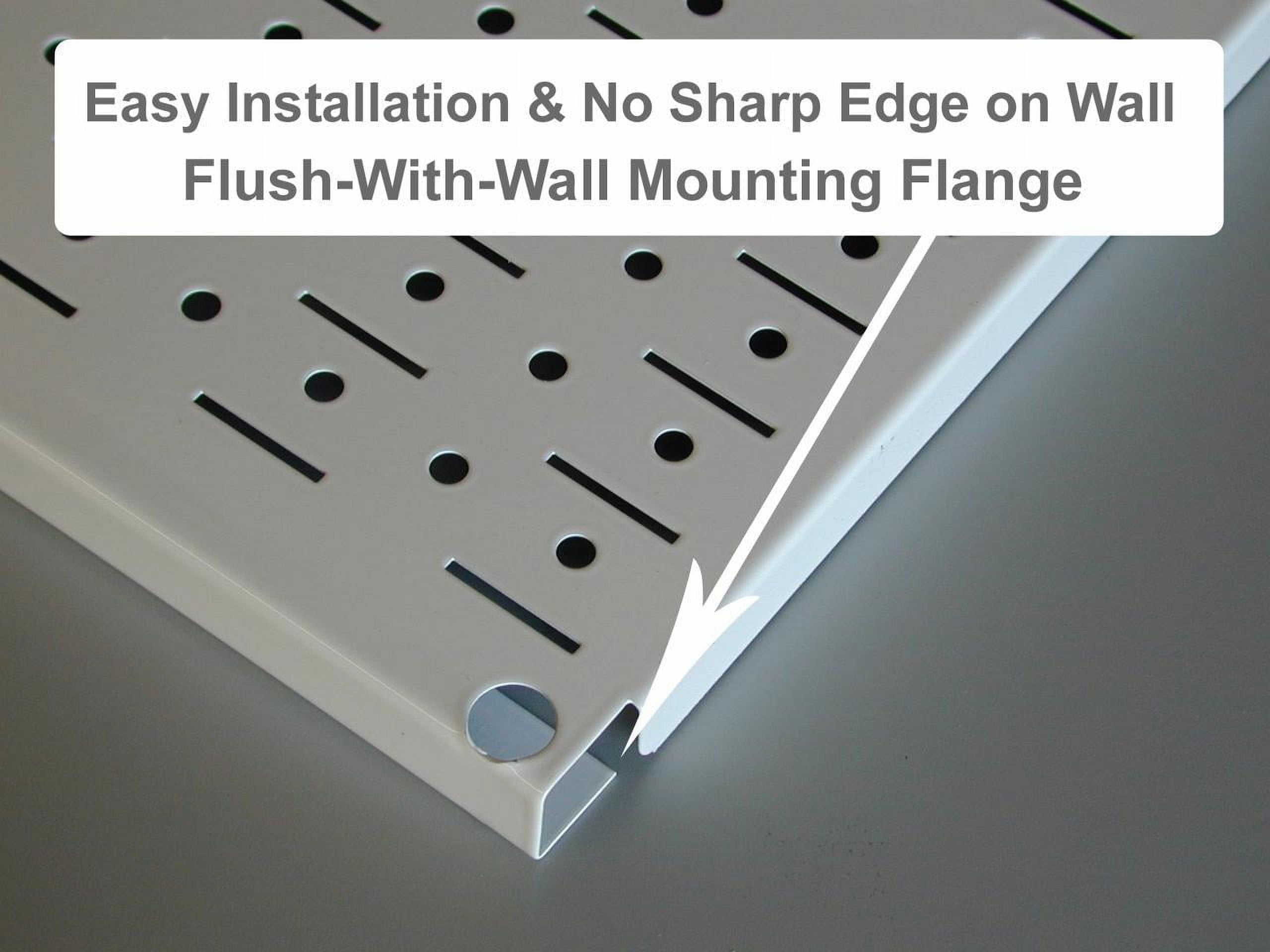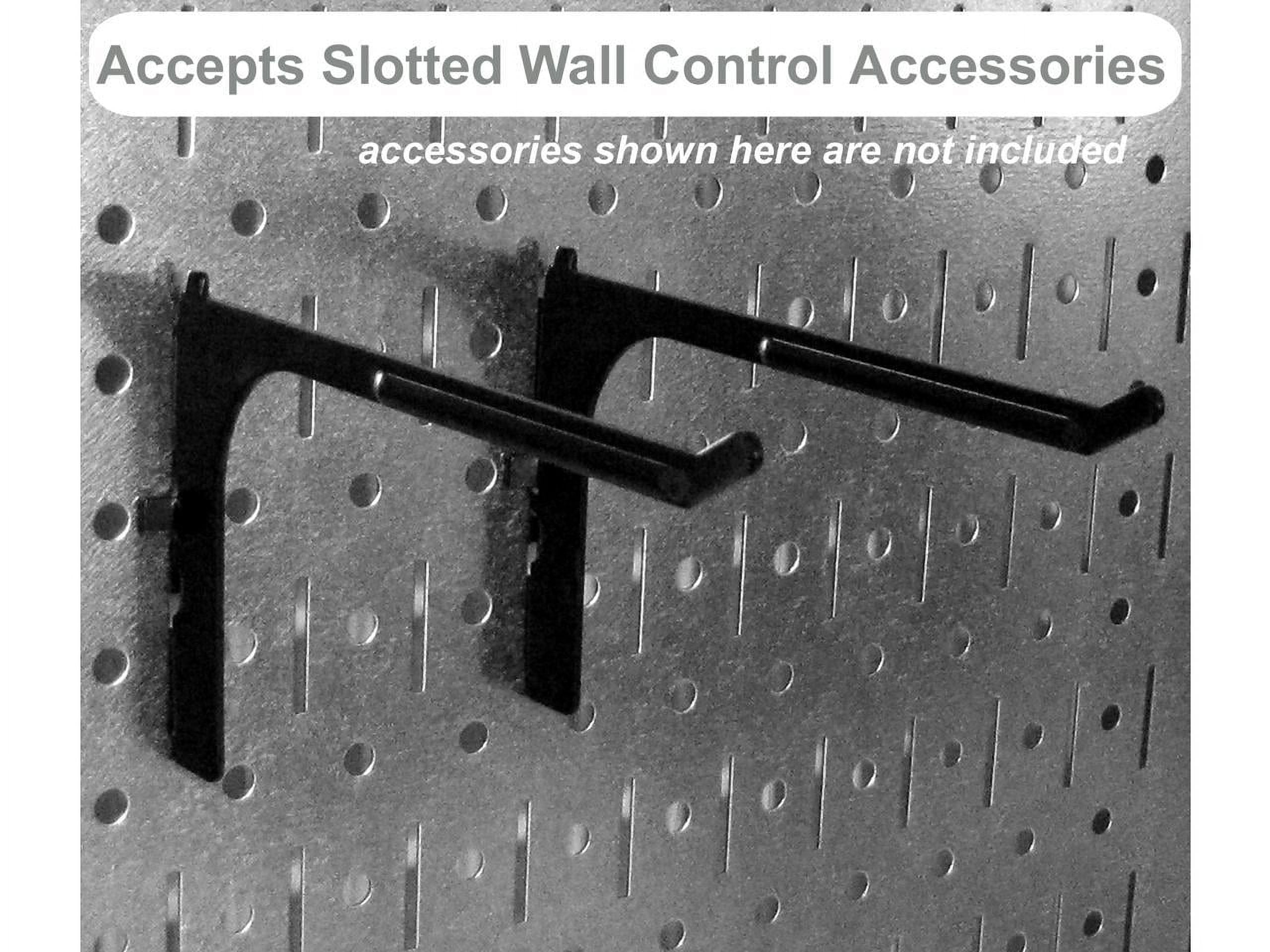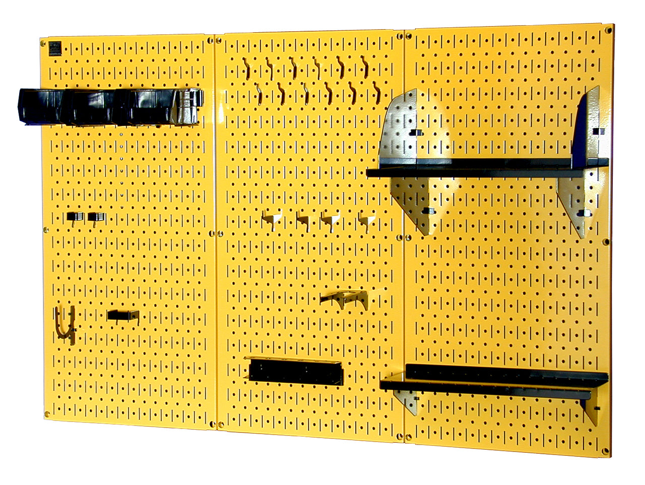 The Metal Pegboard Standard Workbench Tool Storage Organizer Kit offers maximum tool board storage versatility and strength with over 10.5 square feet of pegboard storage space. Three 16in x 32in Yellow powder-coated pegboard panels combine for a total tool storage area of 48in x 32in. The attractive Metal Pegboards are great for heavy duty toolboard storage needs due to their 20 gauge steel construction that will not warp, fray, or crack and are over 10 times stronger than conventional pegboard creating an industrial grade tool storage solution. Wall Control metal pegboards offer both slots and holes to accept slotted tool board accessories as well as conventional 1/4in peg board hooks making this pegboard extremely versatile by giving the user multiple options with tool board accessory selection. Mounting hardware is included with pegboards. Includes Screws and Sheet Rock Anchors. • The Metal Pegboard Standard Workbench Organizer Kit Includes: (3) Yellow Powder-Coated Metal Pegboard Panels 32in x 16in (Covers 48in x 32in when Installed), (1) 9in Shelf Assembly, (1) 6in Shelf Assembly, (3) Plastic Hanging Bins with Bin Hanger, (1) Screwdriver Holder, (1) Hammer Holder, Assortment of (20) Additional Hooks and Brackets. Mounting Hardware is Included. Metal Pegboard is in Yellow with Black Slotted Toolboard Accessories. Tools & Tool Sets Not Included. • Over 10 Times Stronger than Conventional Pegboard • Maximum Pegboard Versatility. Wall Control pegboard panels accept conventional 1/4in pegboard pegs as well as Wall Control slotted pegboard hooks, brackets, shelves, and supplies for maximum tool storage versatility • Easy to Install. These Metal Pegboard ToolBoards are constructed with a preformed 3/4in return flange that separates the panel storage surface from the wall. Pegboard panels mount directly into studs or sheet rock with no framework required.Metal Pegboard Kit Includes Assortment of Wall Control Slotted Hooks and Accessories, Pegboard Accepts 1/4in Pegboard Pegs, Pegboard Accepts Magnets, 10 Times Stronger Than Conventional Pegboard,