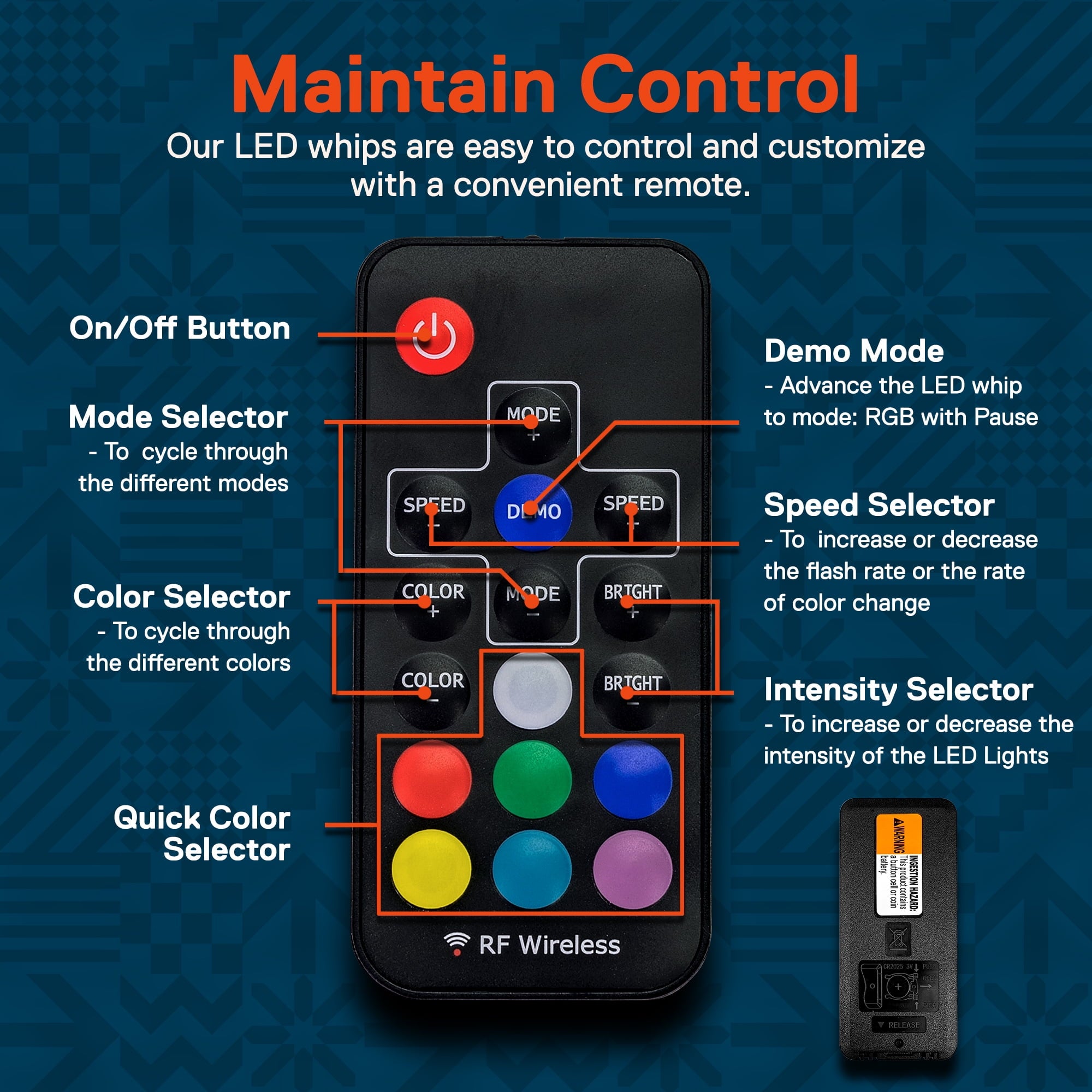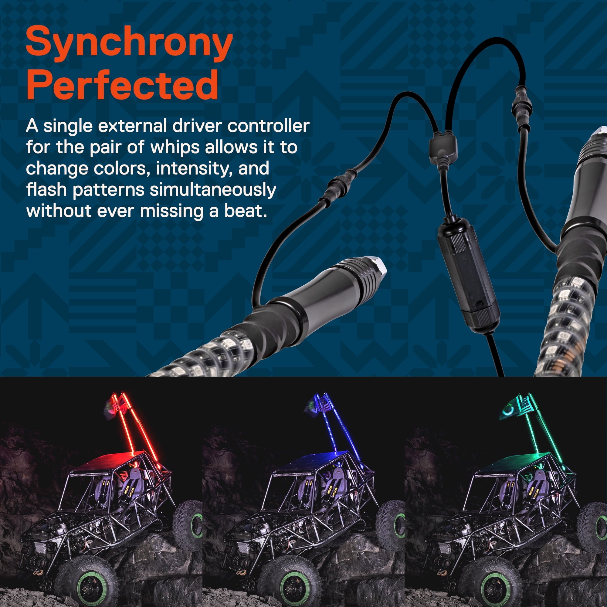 Off-roading is about leaving everything behind, wiping out a bad week, and the feeling that at that moment, nothing else exists. We understand that every piece of equipment should enhance your off-road experience, not get in your way. That’s why we designed our LED whips with a simple remote control. The easy to understand controls allow you to quickly dial in the color you want, pick your flash pattern, and get back to doing what you love. You can even use one remote to control multiple units!