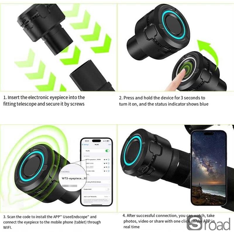 Transform your telescope into a smart observation device with this 4K HD WiFi electronic eyepiece. Featuring 5 million pixels and full-color imaging, it delivers crisp, detailed views of celestial bodies, birds, and distant landscapes. The built-in WiFi allows seamless connection to smartphones or tablets for real-time viewing, photo capture, and video recording. Powered by a 1600mAh rechargeable battery for extended outdoor use, its lightweight and portable design makes it ideal for astronomers, bird watchers, and outdoor enthusiasts. Compatible with most standard telescopes.