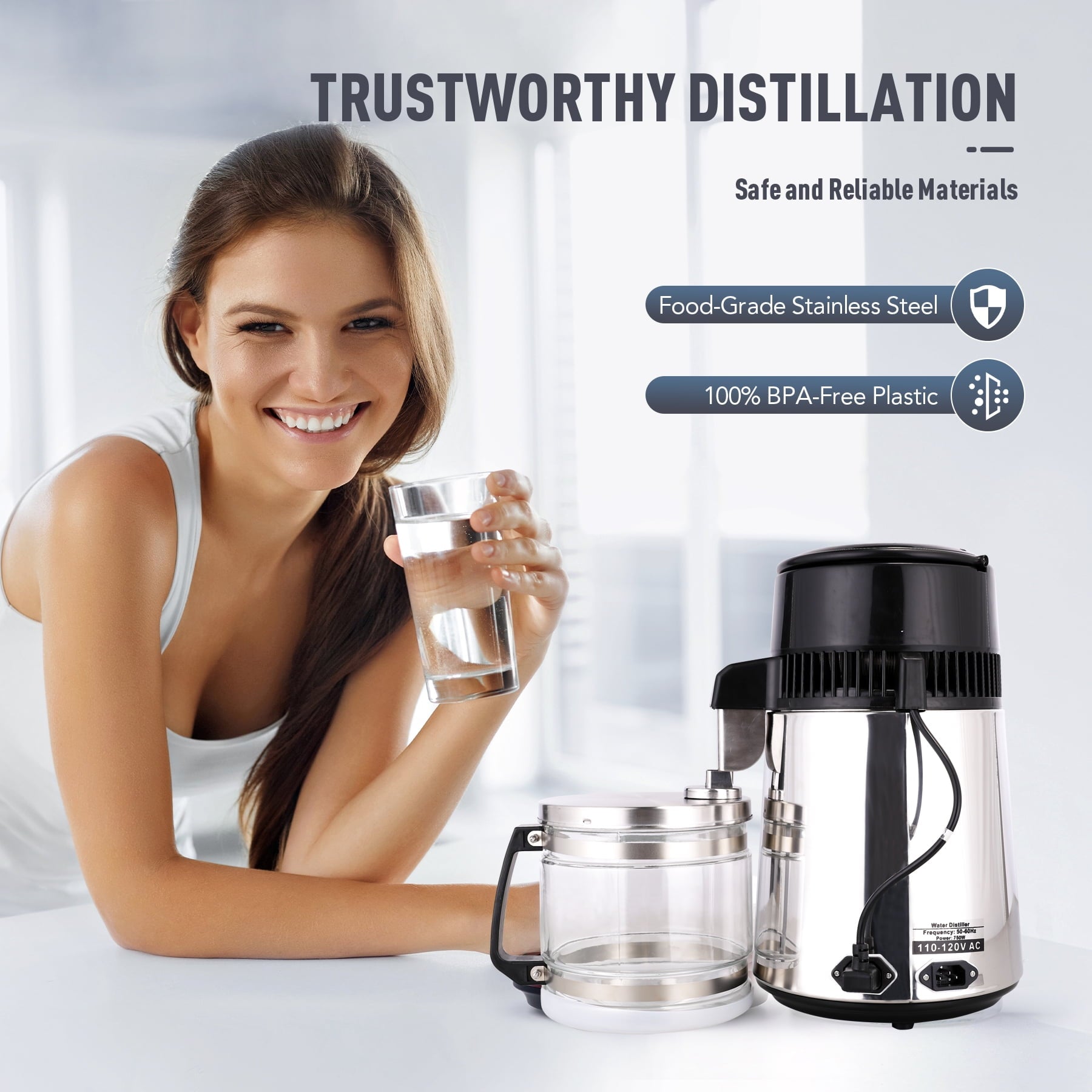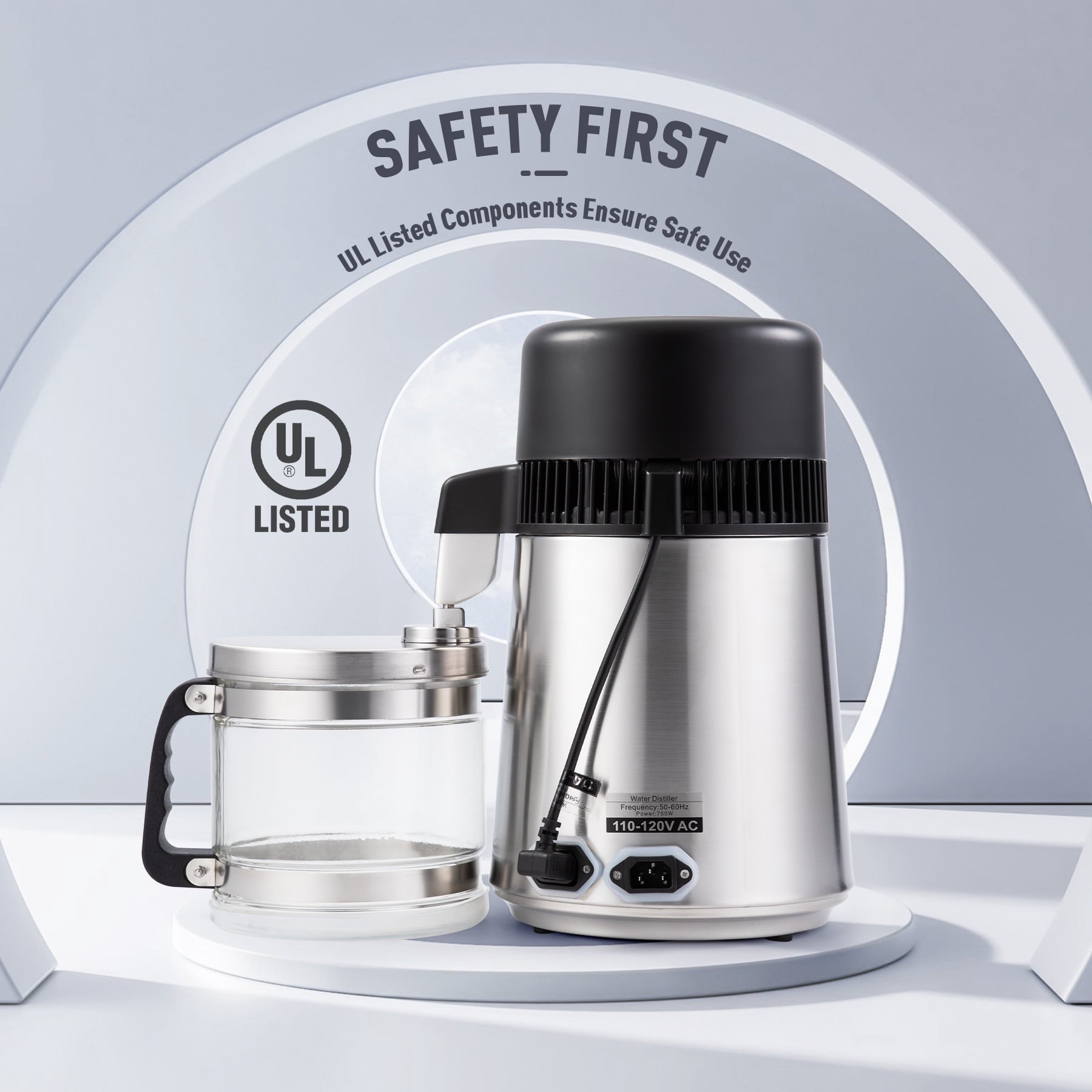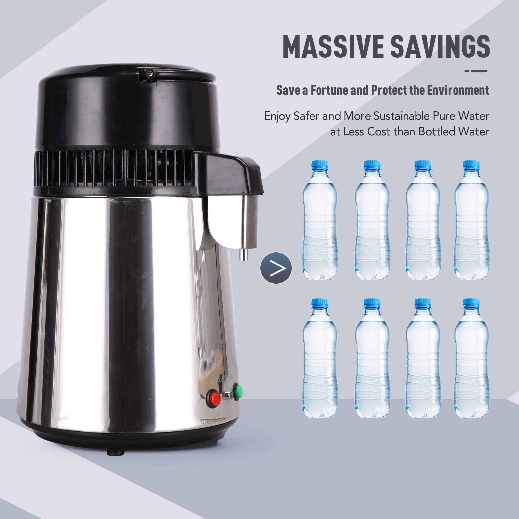 A water distiller processes water through heating, evaporation and condensation to separate pure, freshwater from contaminants. Our most sought after water distiller, this model has a 304 Stainless Steel exterior and top quality 1 gallon glass carafe with ergonomic “Easy-Lift” Handle. It can distill up to 1 liter/ hour, it also features single-button start, automatic turn off when it gets too hot.