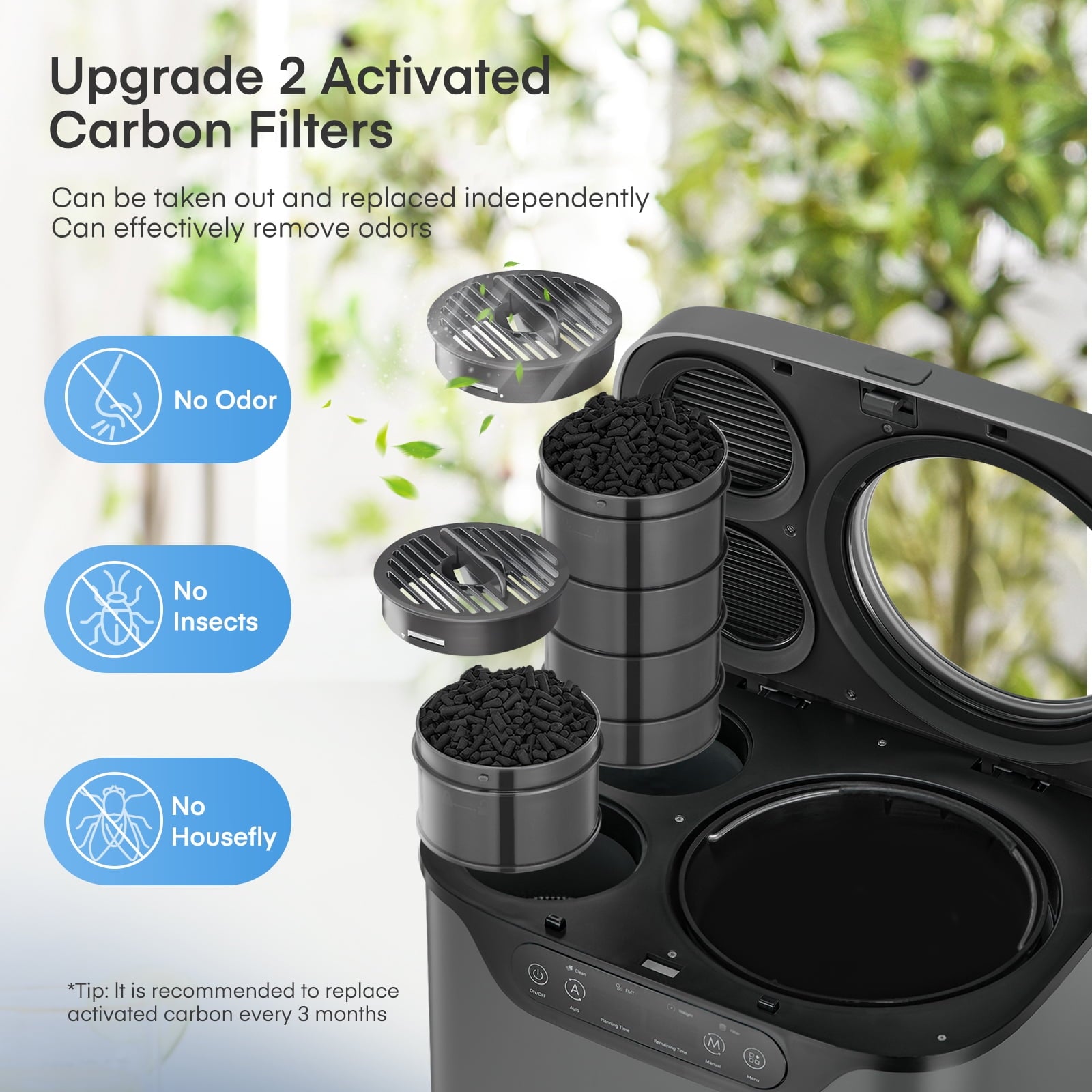 • [Experience Odor-Free Indoor Composting]The built-in activated carbon filter in the food waste composter ensures 100% odor adsorption, and the sealed design further blocks the odor from escaping, keeping your kitchen fresh and clean – ideal for apartments and open kitchens. It is recommended to replace the activated carbon every 3 months to ensure continuous odor-free performance.