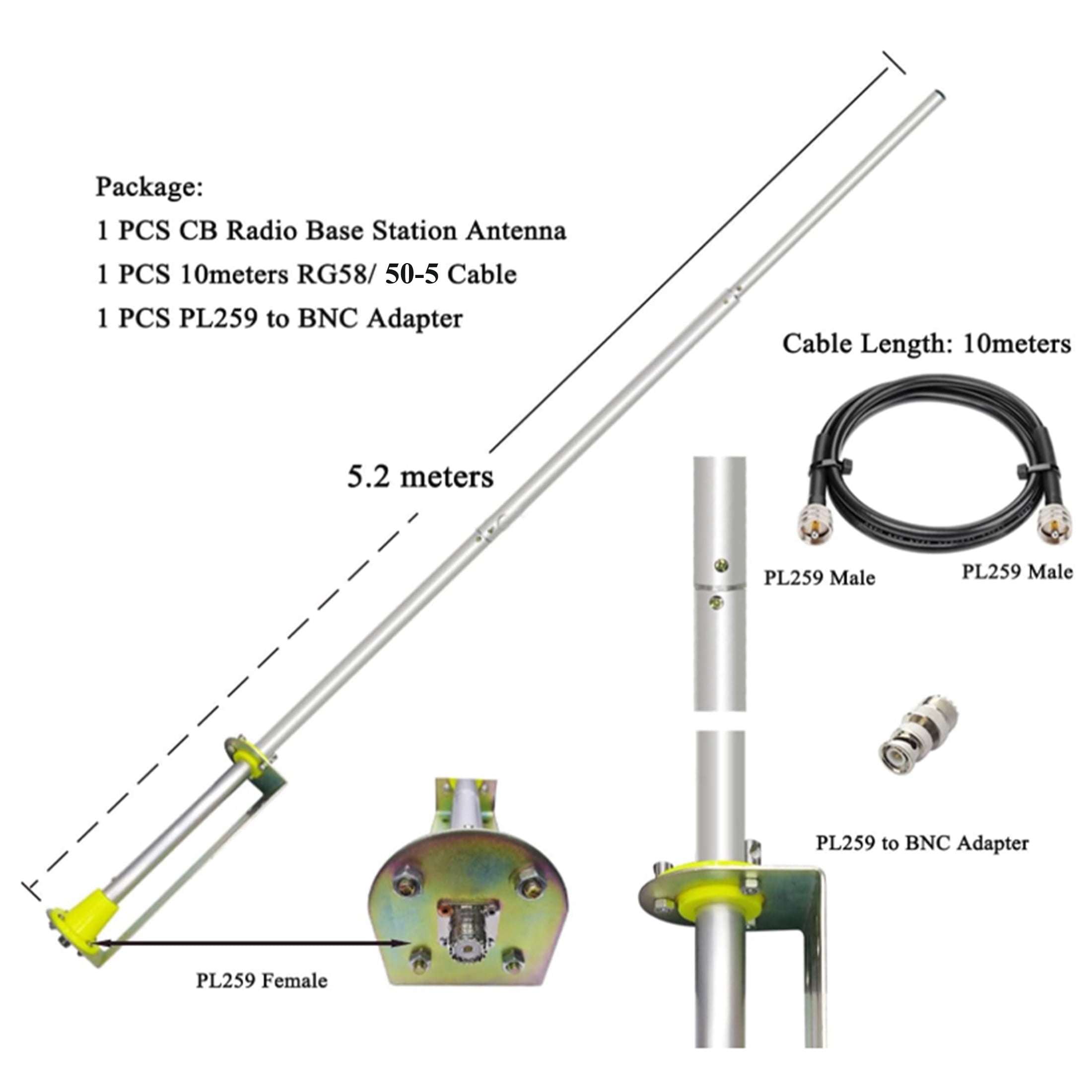 - High-Performance CB Antenna – 5.2m tall 27MHz base antenna designed for stronger reception and transmission.