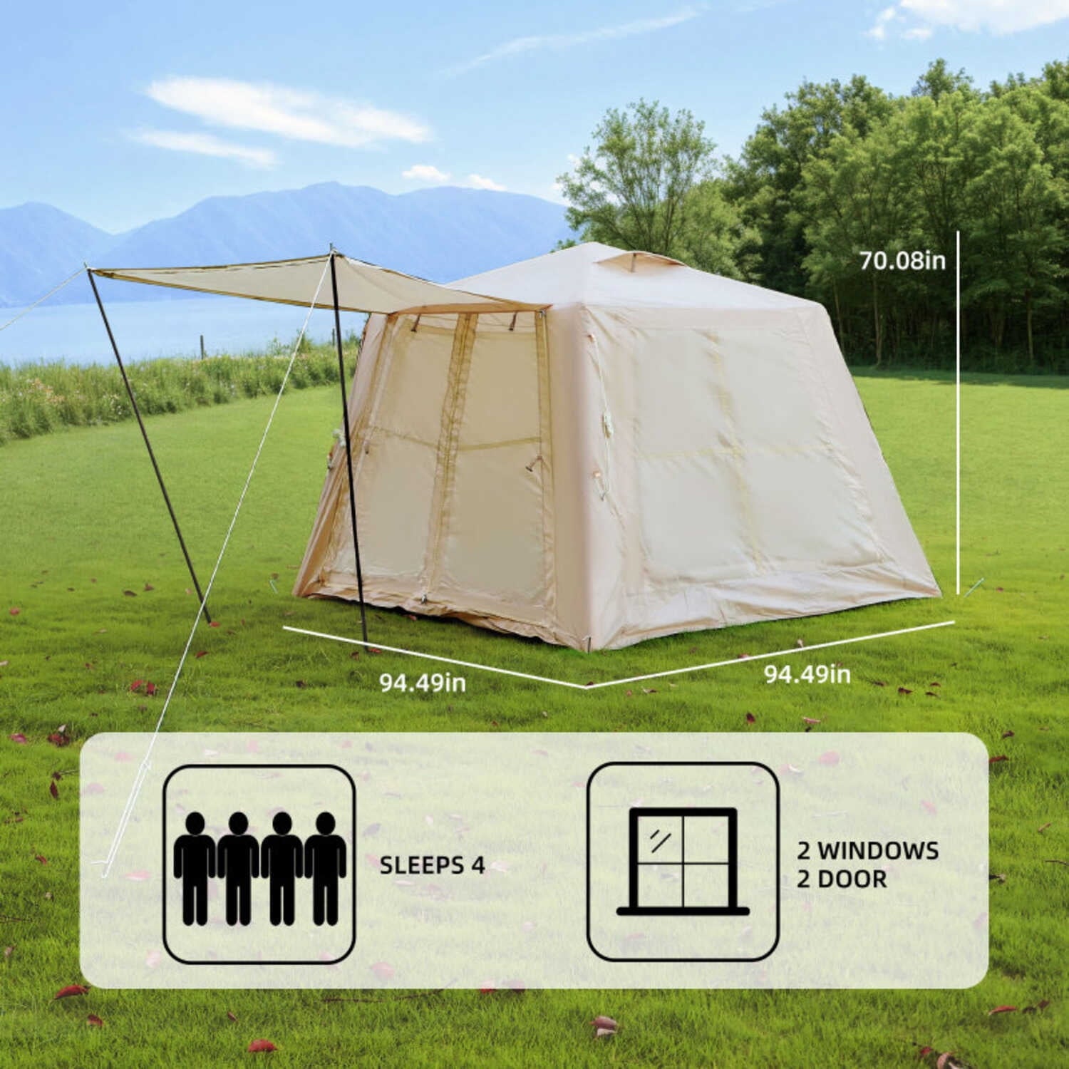 SPACIOUS DIMENSIONS- This iatable four-sided tent boasts generous dimensions of 95in widthdepth and 69in height, offering ample interior space to comfortably accommodate 2-3 people along with camping gear.Whether it’s a family camping trip or a gathering with friends, this tent ensures everyone has enough room to move around freely and relax without feeling cramped.â