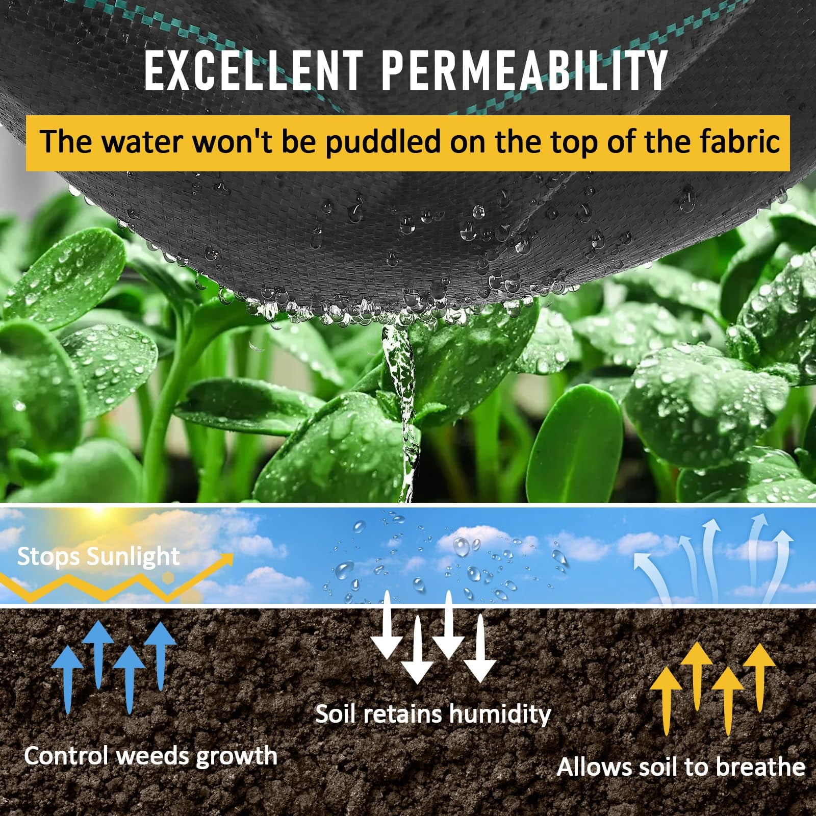 - High Water and air Permeability: Our heavy duty weed barrier is made of black woven high-density polypropylene fabric, with excellent water and air permeability. It can maintain soil moisture and nutrients, maintain plant health, but still greatly prevent weed growth. Note: The Woven Layer should face up for better sun protection, weed barrier, and more vital water permeability.