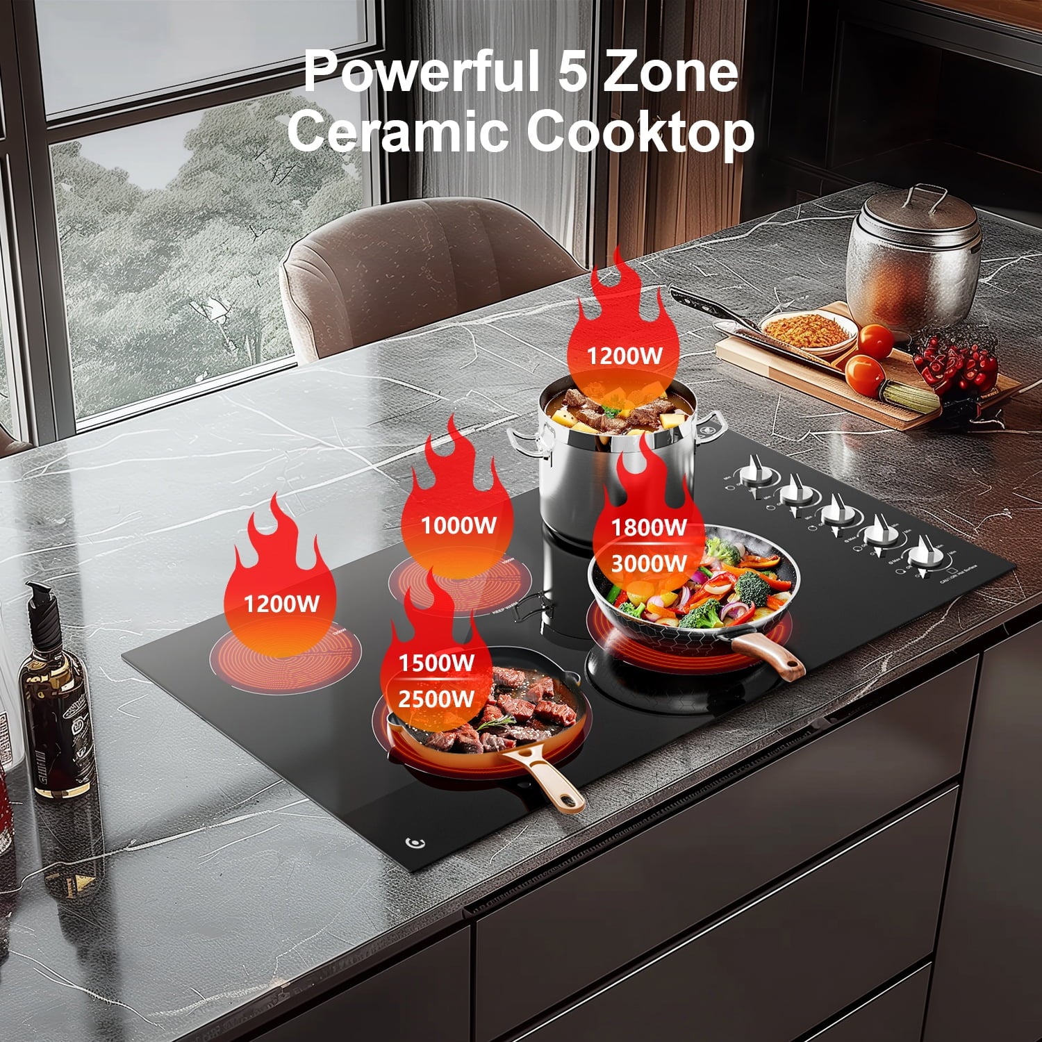 1. Powerful: 5 Cooking Zones–2×1200W, 1000W, 1500/2500W(Dual), 1800/3000W(Dual) is with independent knob control. The electric stove hob is suitable for 220-240V. Cook multiple dishes together at ease!