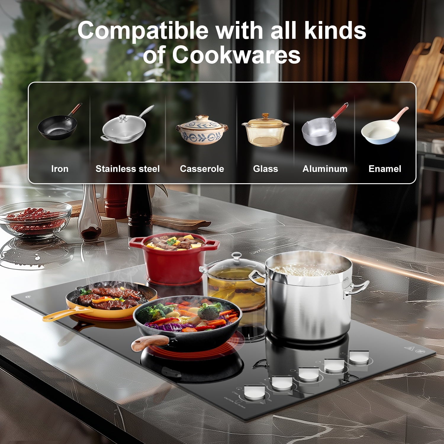 - ??【Compatible with All Cookware】 This AMZCHEF electric cooktop is designed to work with any cookware that has a flat base, including iron, aluminum, ceramic, stainless steel, copper, and heat-resistant glass. Unlike induction hobs, which require specific cookware, this ceramic hob removes the hassle of selecting compatible pots and pans, making it a versatile and convenient kitchen companion.
