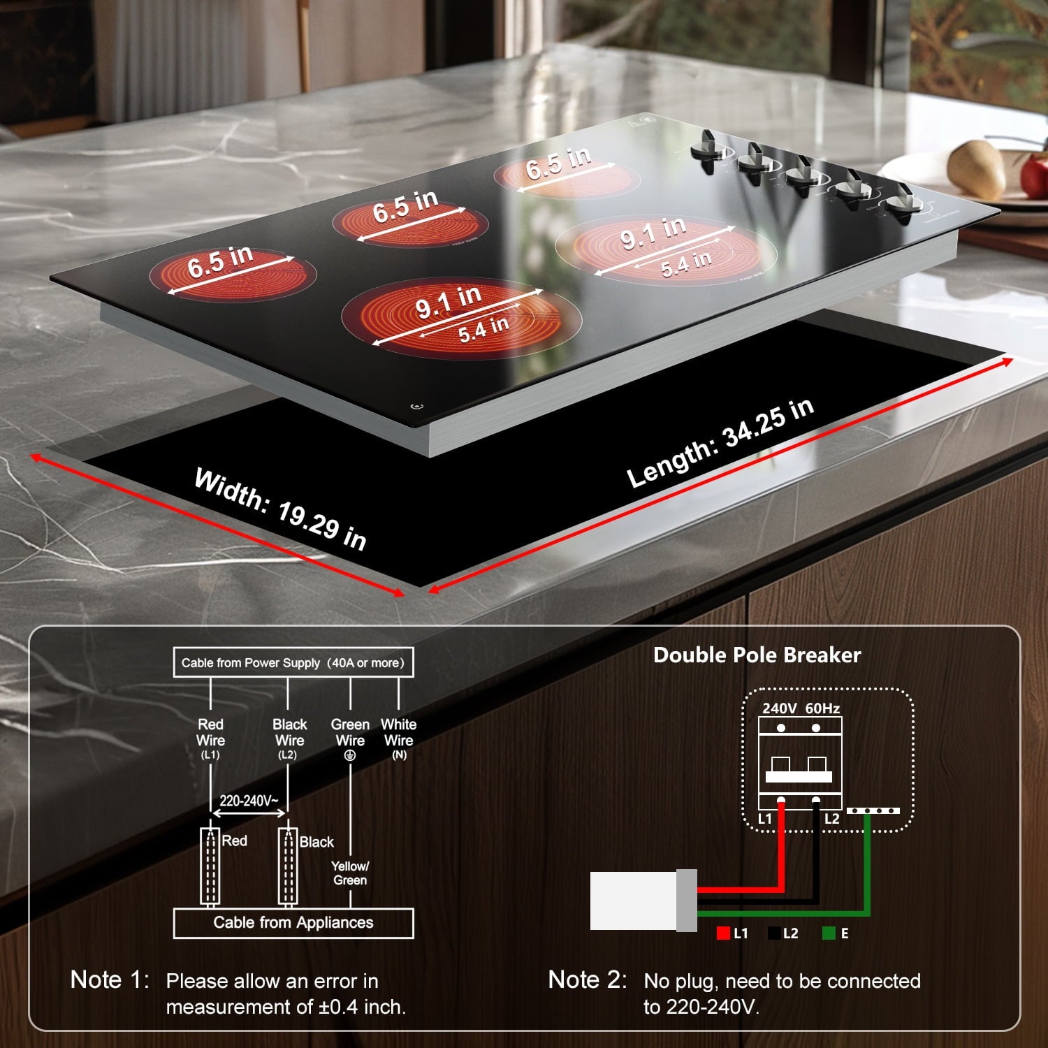 - ??【5-Zone Electric Stove for Fast and Efficient Cooking】 Featuring 2×1200W, 1000W, 1500/2500W (Dual), and 1800/3000W (Dual) power settings, this 240V/60Hz stove delivers quick and even heat distribution across five burners. Each burner is independently controlled by its own knob, offering precise temperature adjustments for various cooking needs. The spacious and well-thought-out burner layout allows you to cook multiple dishes simultaneously, saving you both time and energy. Perfect for weekend gatherings or entertaining guests, this stove lets you prepare large meals effortlessly. Please note: This built-in cooktop requires hardwiring (220-240V) and does not come with a plug.