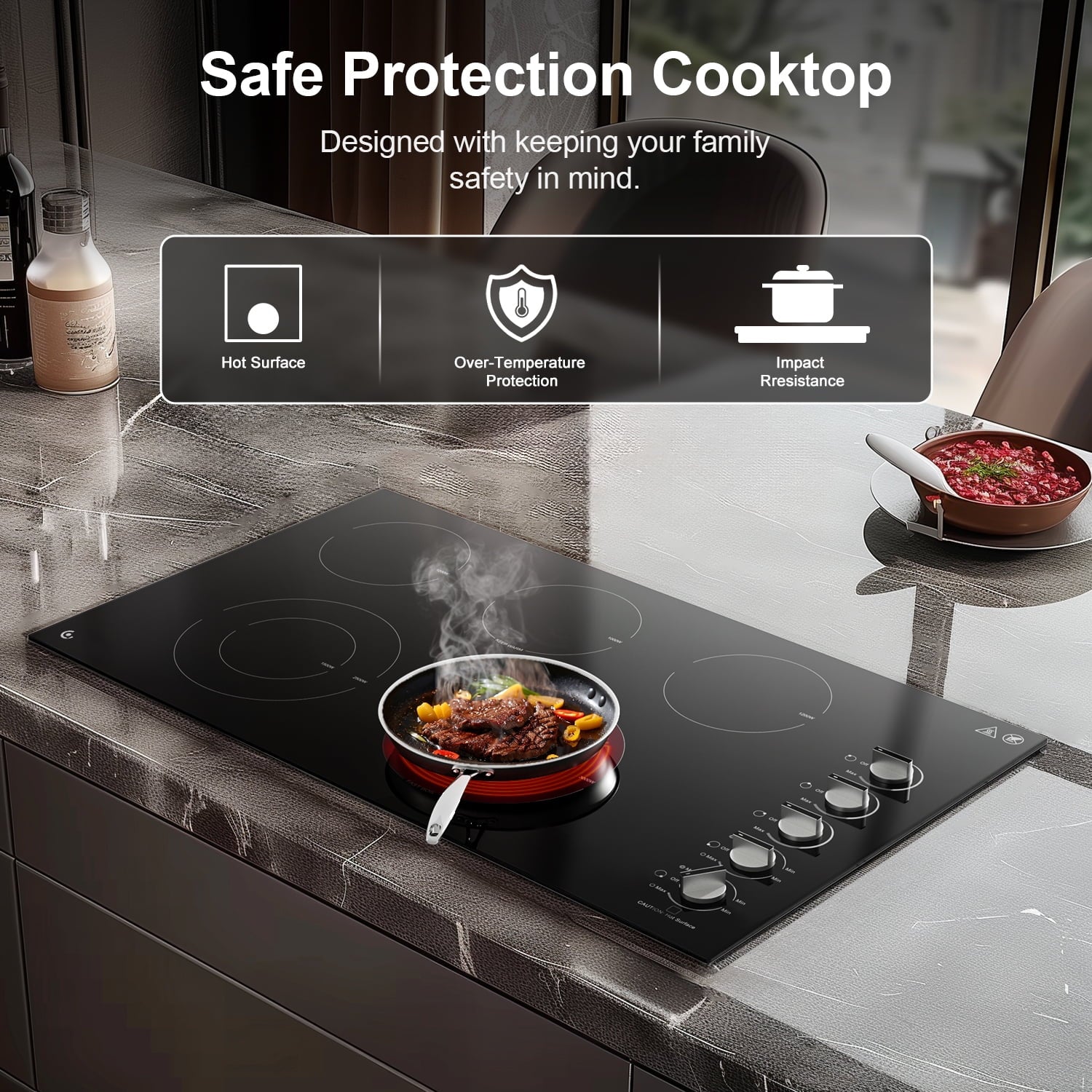 - ??【Enhanced Safety Features】 Safety is our top priority. This built-in ceramic stove comes with several safety features, including overheating protection, a hot surface indicator, and pan detection. The stove will automatically shut off if it detects excessive internal temperatures, and the hot surface indicator warns you when the cooktop is too hot to touch.