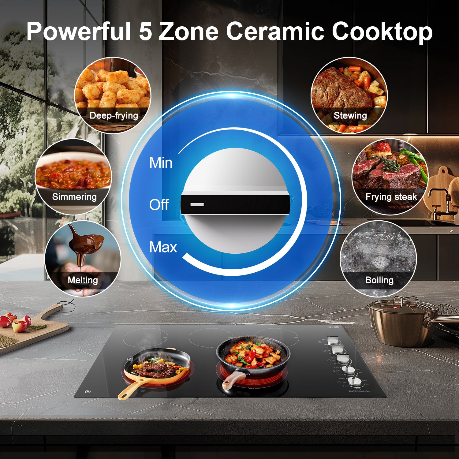 - ??【Versatile Cooking Options】 Equipped with dual power control, this ceramic cooktop offers a wide range of heating levels, from “keep warm” to “fast boil.” Whether you’re boiling, stewing, frying, searing, or simmering, simply rotate the knobs to adjust the heat to suit your cooking needs. The black polished glass plate adds a sleek, classic design while making cleanup a breeze.