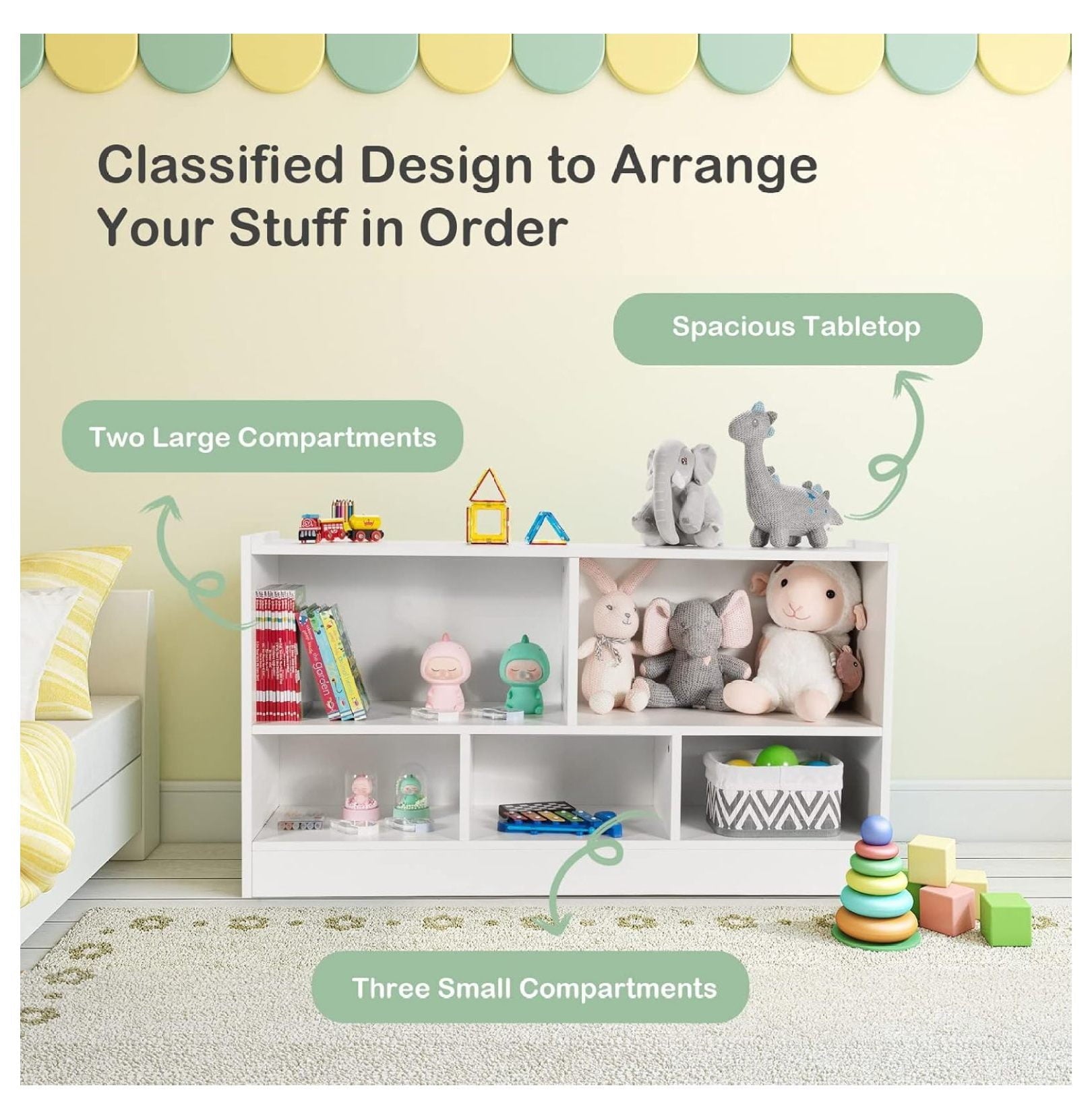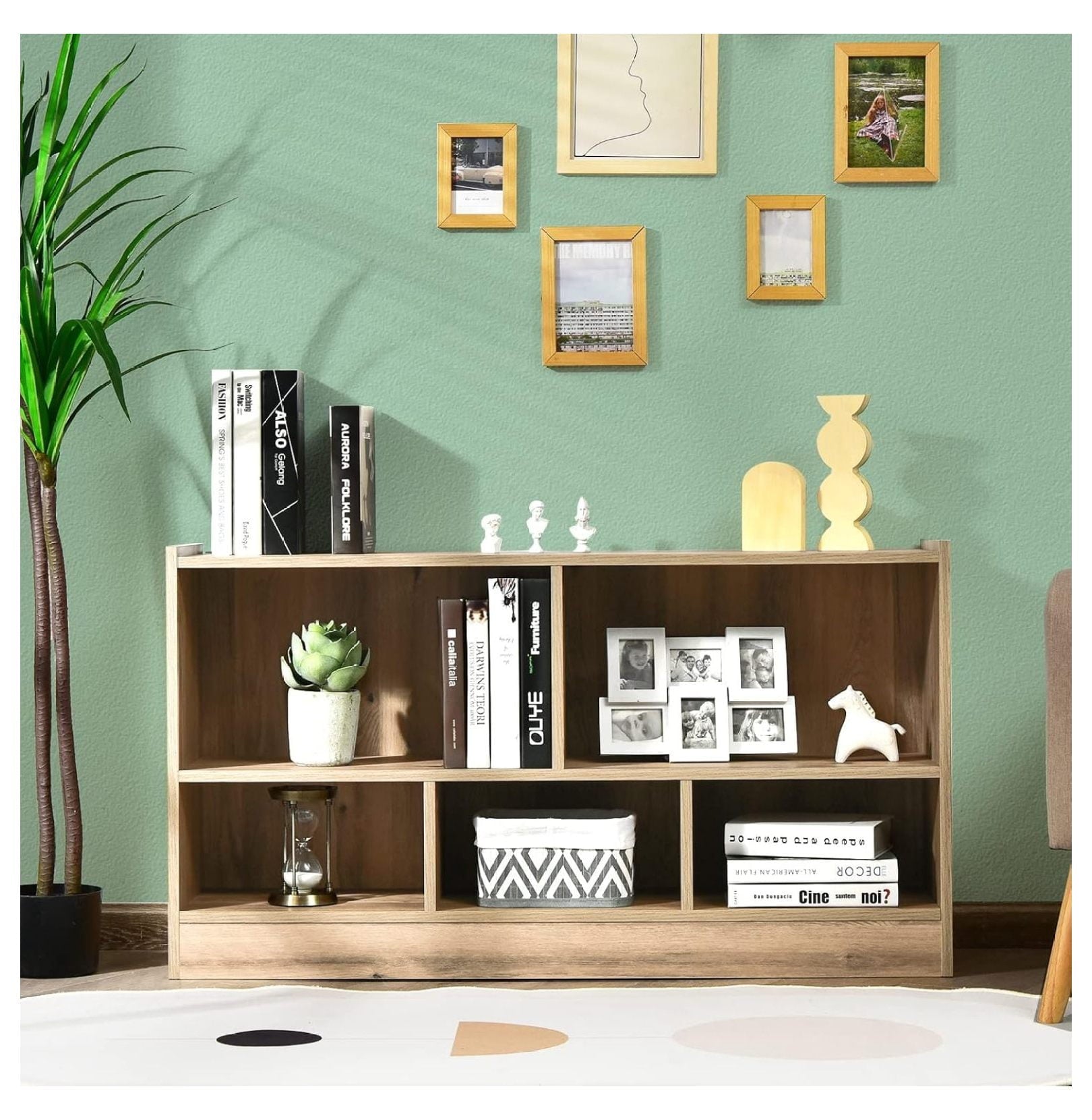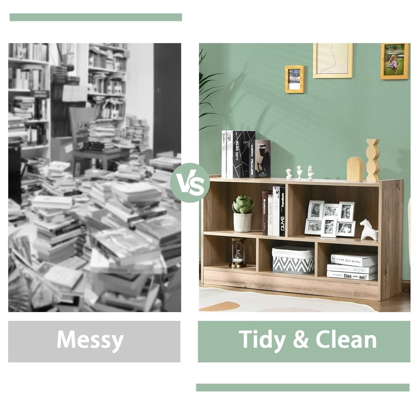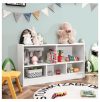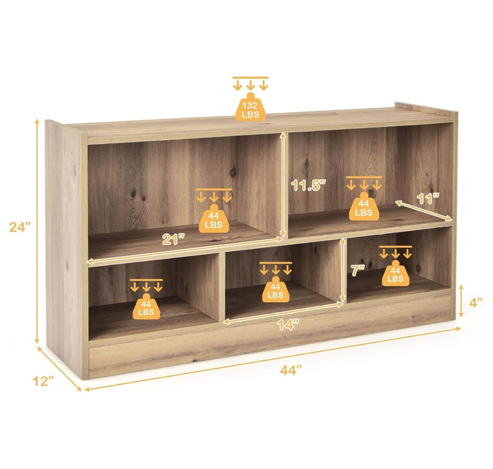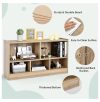 - [Perfect Storage Cabinet Organizer]: The 2-tier bookshelf is divided into 5 cubes of 2 sizes for books, toys, and daily items. The 2 large cubes measure 21″ x 11″ x 11.5″ (L x D x H) and the 3 medium cubes measure 14″ x 11″ x 7″ (L x D x H). The 42″ x 12″ rectangular top provides extra space for easy access.