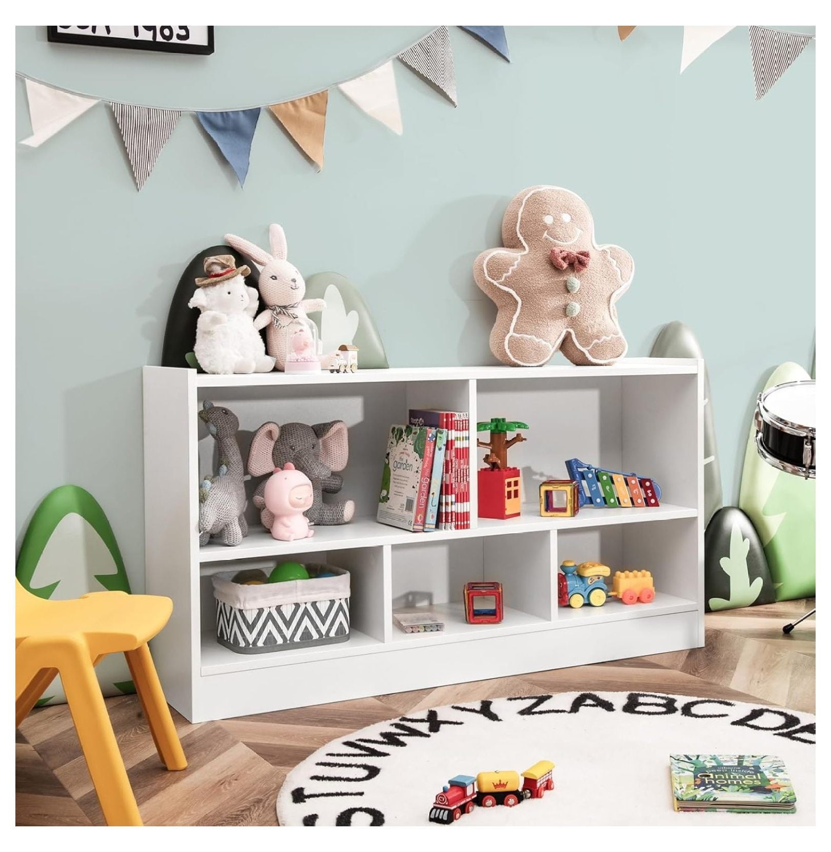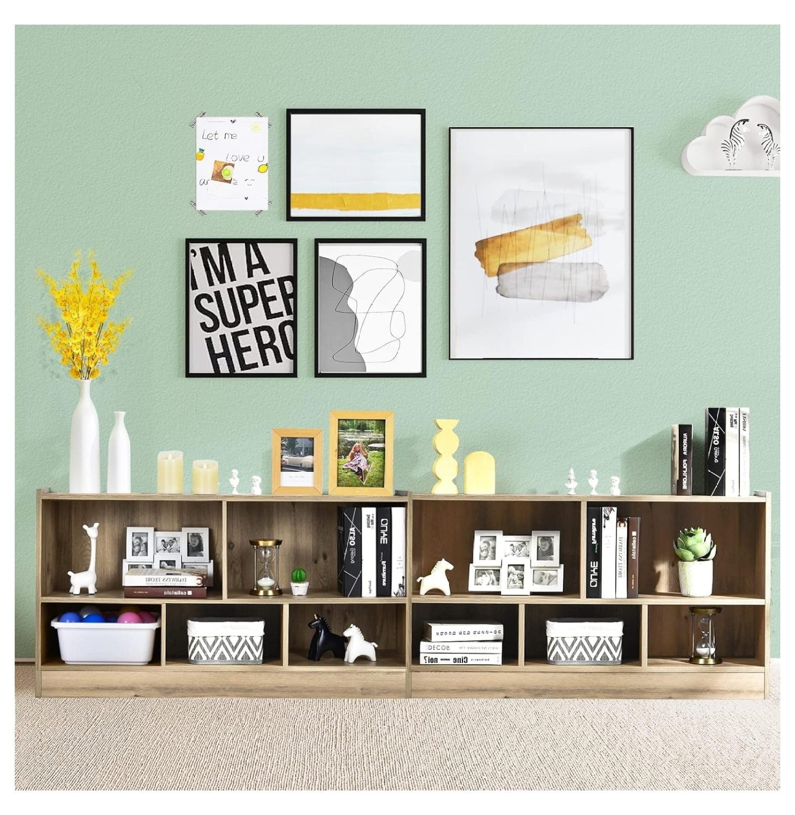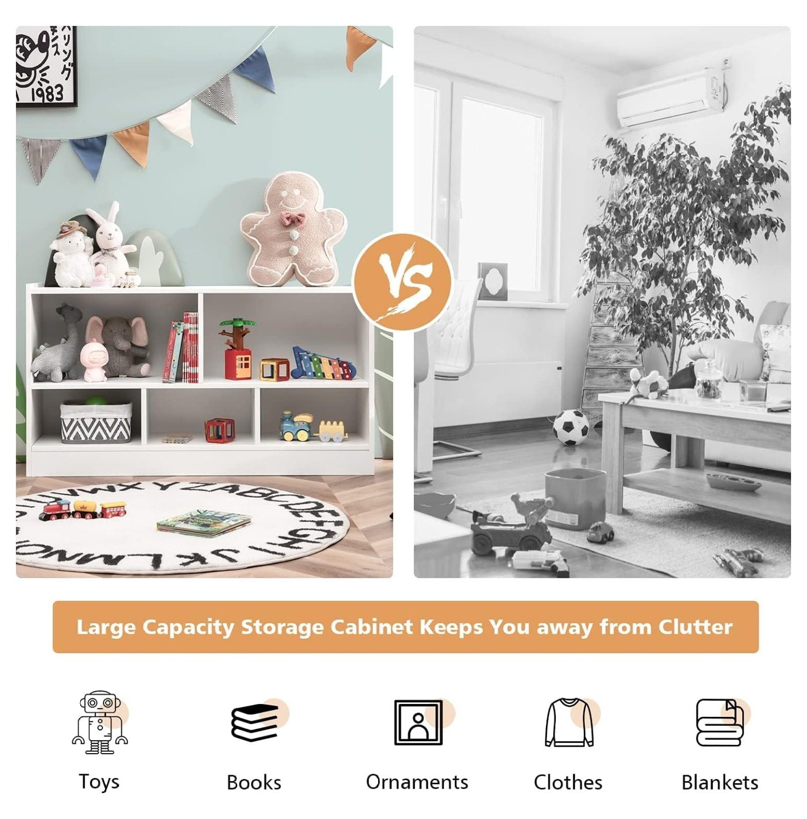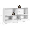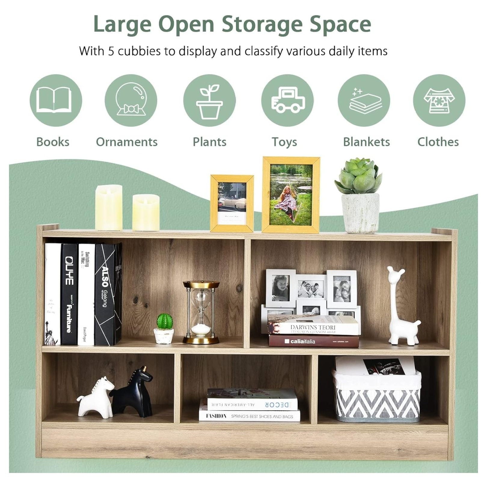 - [Perfect Storage Cabinet Organizer]: The 2-tier bookshelf is divided into 5 cubes of 2 sizes for books, toys, and daily items. The 2 large cubes measure 21″ x 11″ x 11.5″ (L x D x H) and the 3 medium cubes measure 14″ x 11″ x 7″ (L x D x H). The 42″ x 12″ rectangular top provides extra space for easy access.