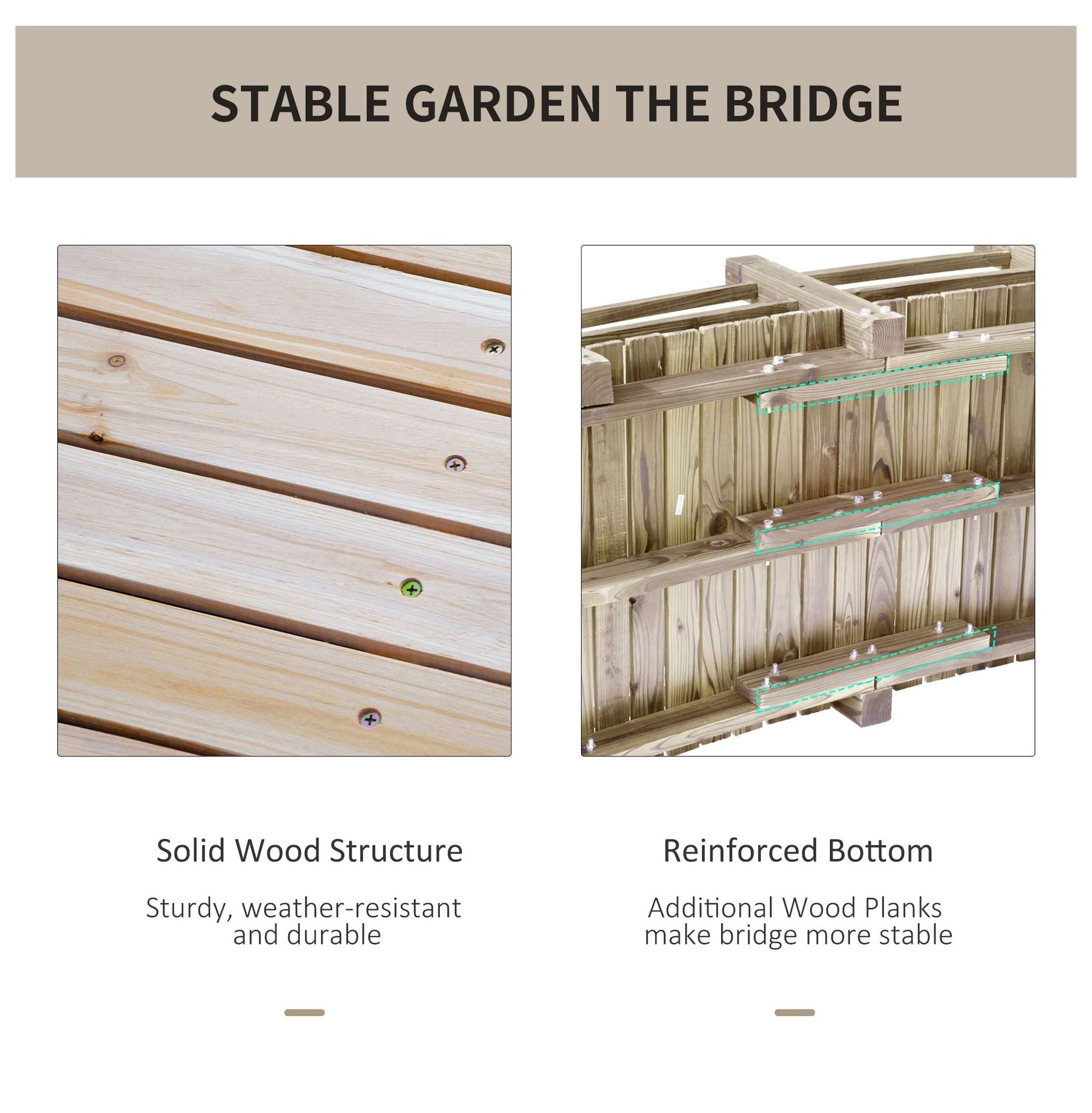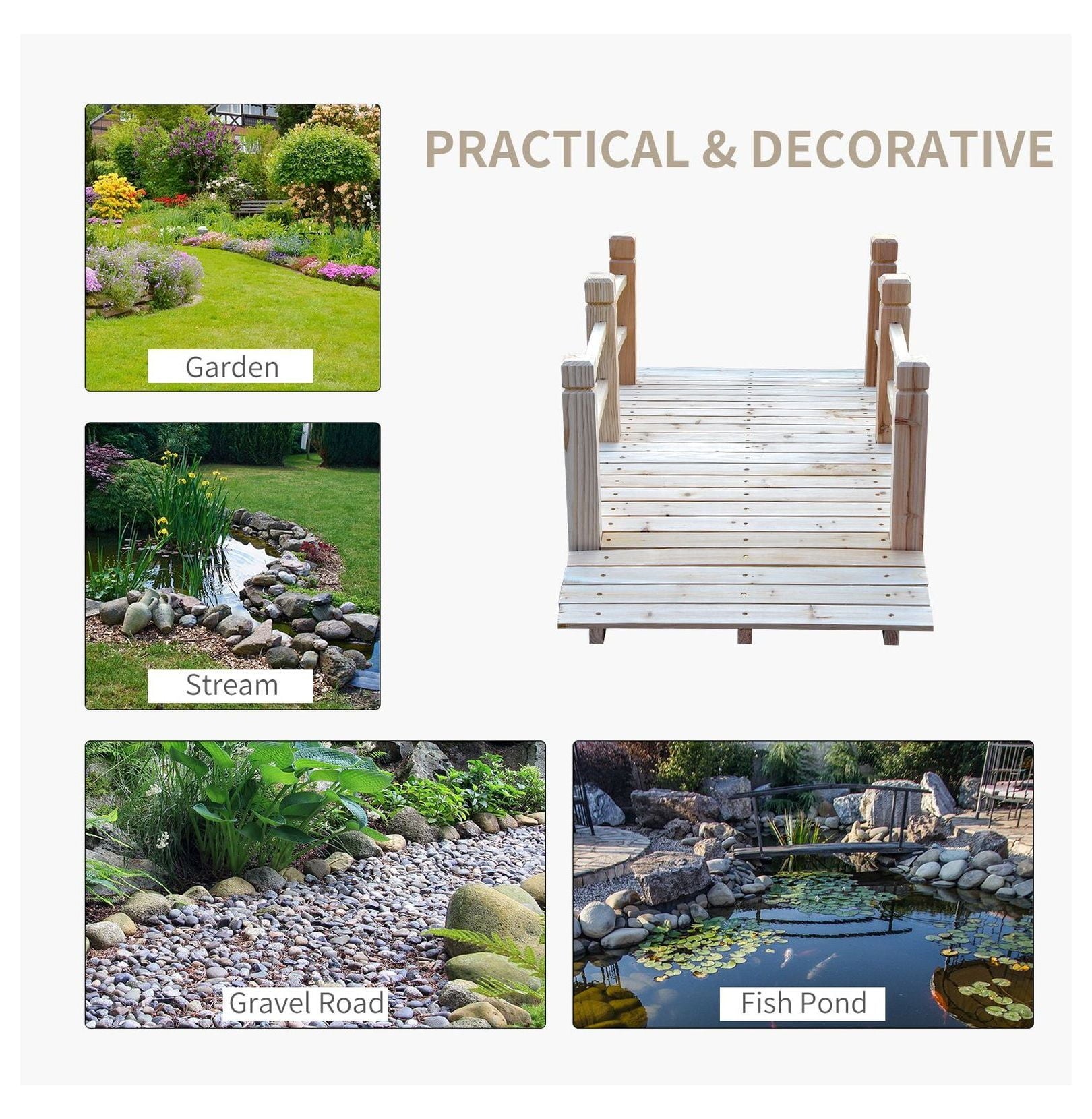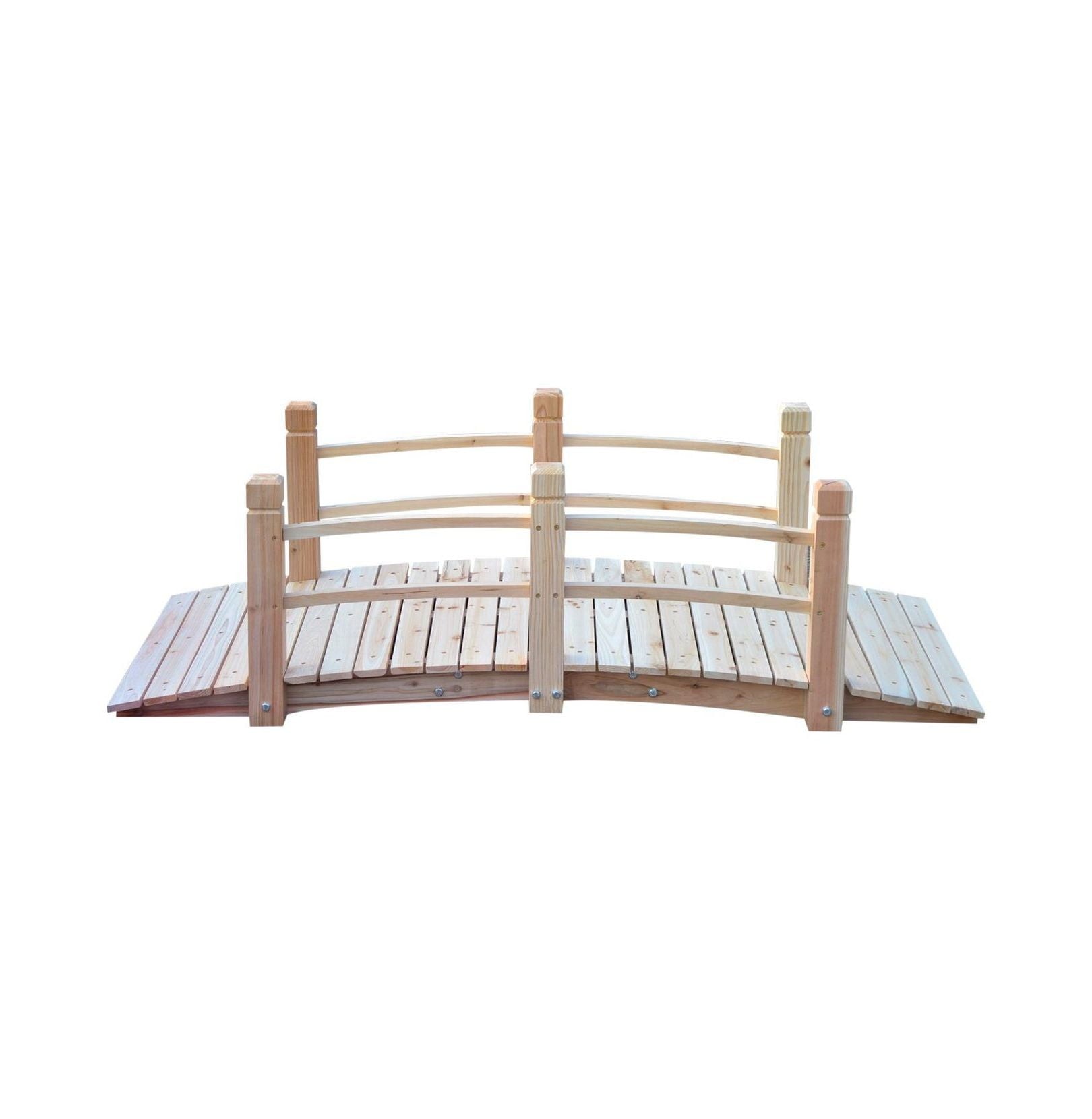 Enhance your outdoor space with this charming 5 ft wooden garden bridge; perfect for adding a touch of elegance to backyards, ponds, or garden walkways. Crafted from solid fir wood, this bridge is designed for both beauty and durability, ensuring long-lasting enjoyment. The arched frame and side railings provide a secure and visually appealing addition to your landscaping. The varnish-painted surface offers resistance to water, rot, cracking, and splitting, minimizing maintenance and maximizing lifespan. This bridge serves as a beautiful centerpiece, inviting moments of relaxation and appreciation for nature. Overall dimensions are 60″ L x 26.5″ W x 19″ H, with a bridge surface of 60″ L x 20.5″ W, and a maximum load capacity of 505 lbs. Assembly is required. The natural wood finish complements any garden style, creating a serene and inviting atmosphere. Transform your outdoor area with this decorative and functional footbridge. Enjoy the enhanced aesthetic and practical use this bridge brings to your garden, providing a delightful spot to pause and admire the surrounding landscape. This bridge is ideal for creating a focal point and adding a unique touch to your outdoor living space. It’s a perfect blend of form and function, offering both visual appeal and reliable support for years to come.