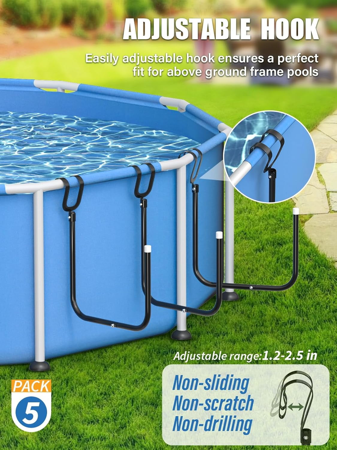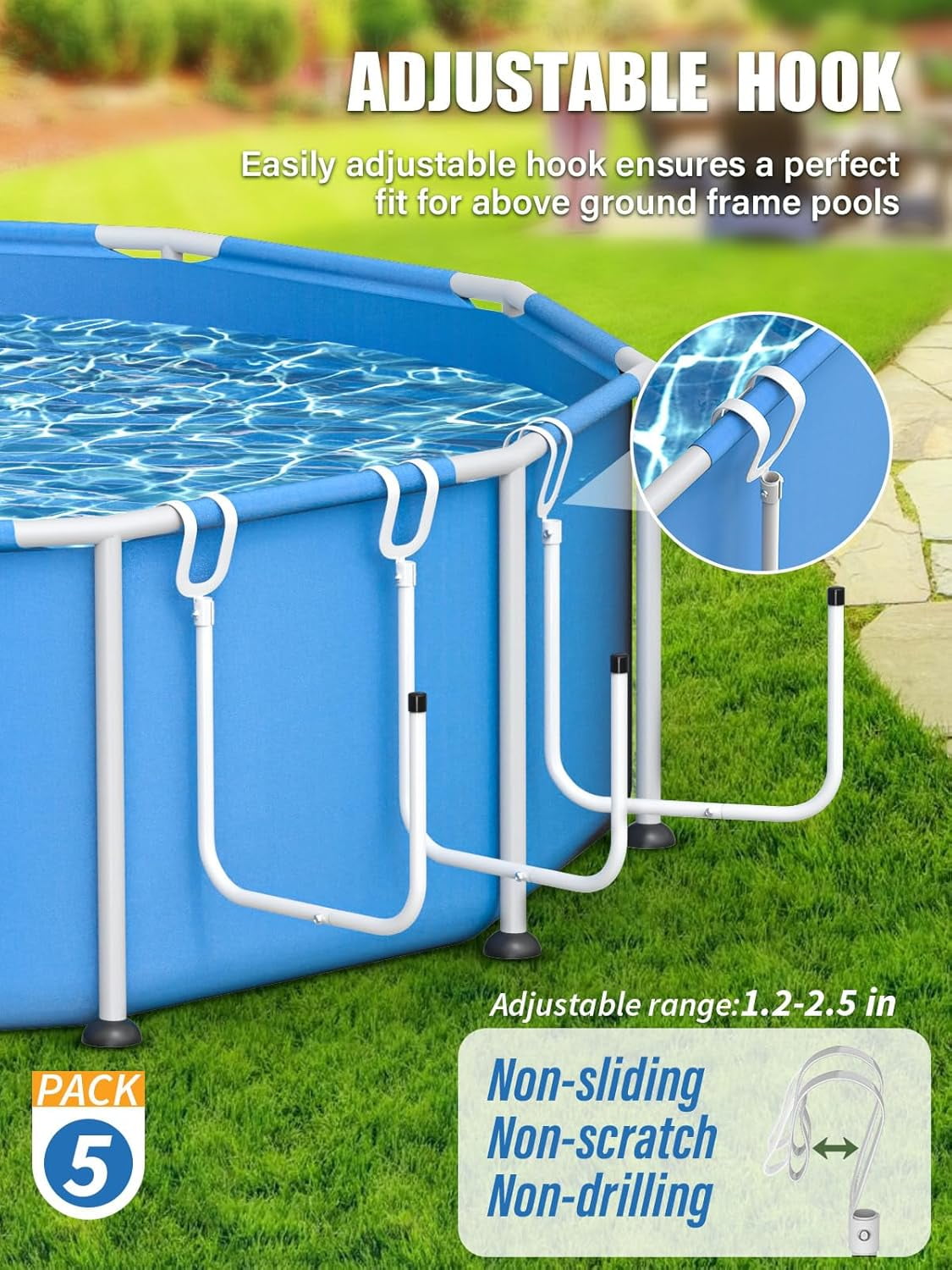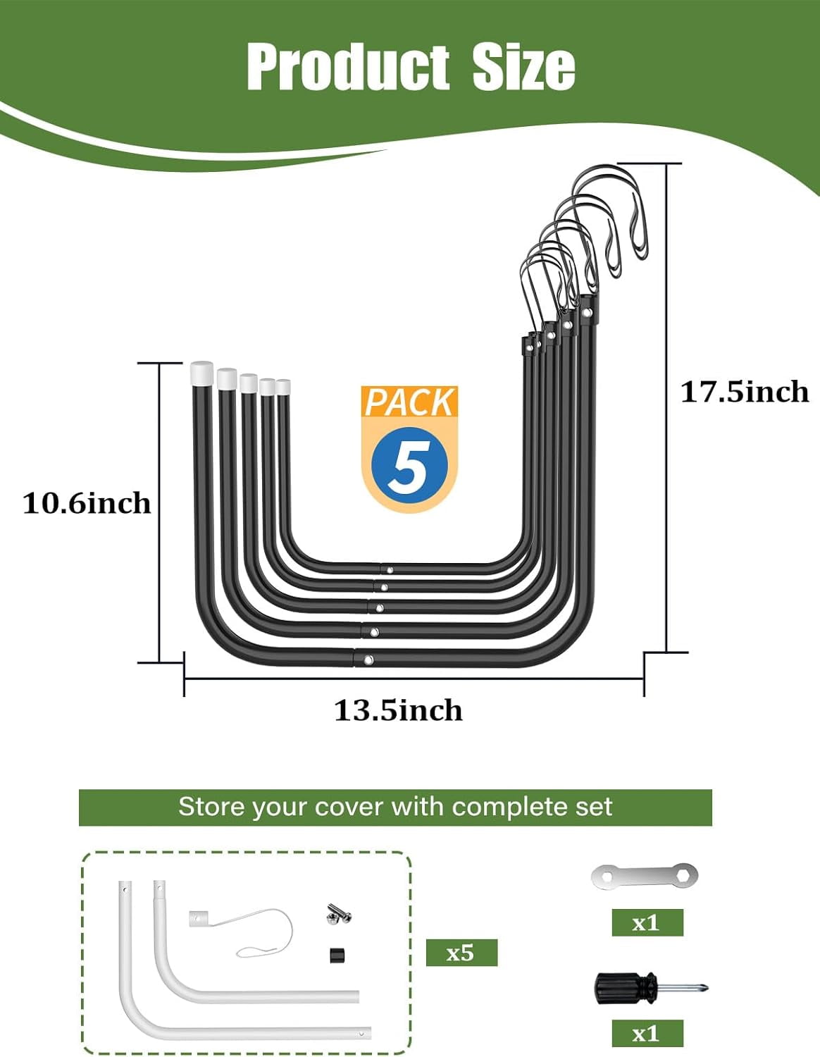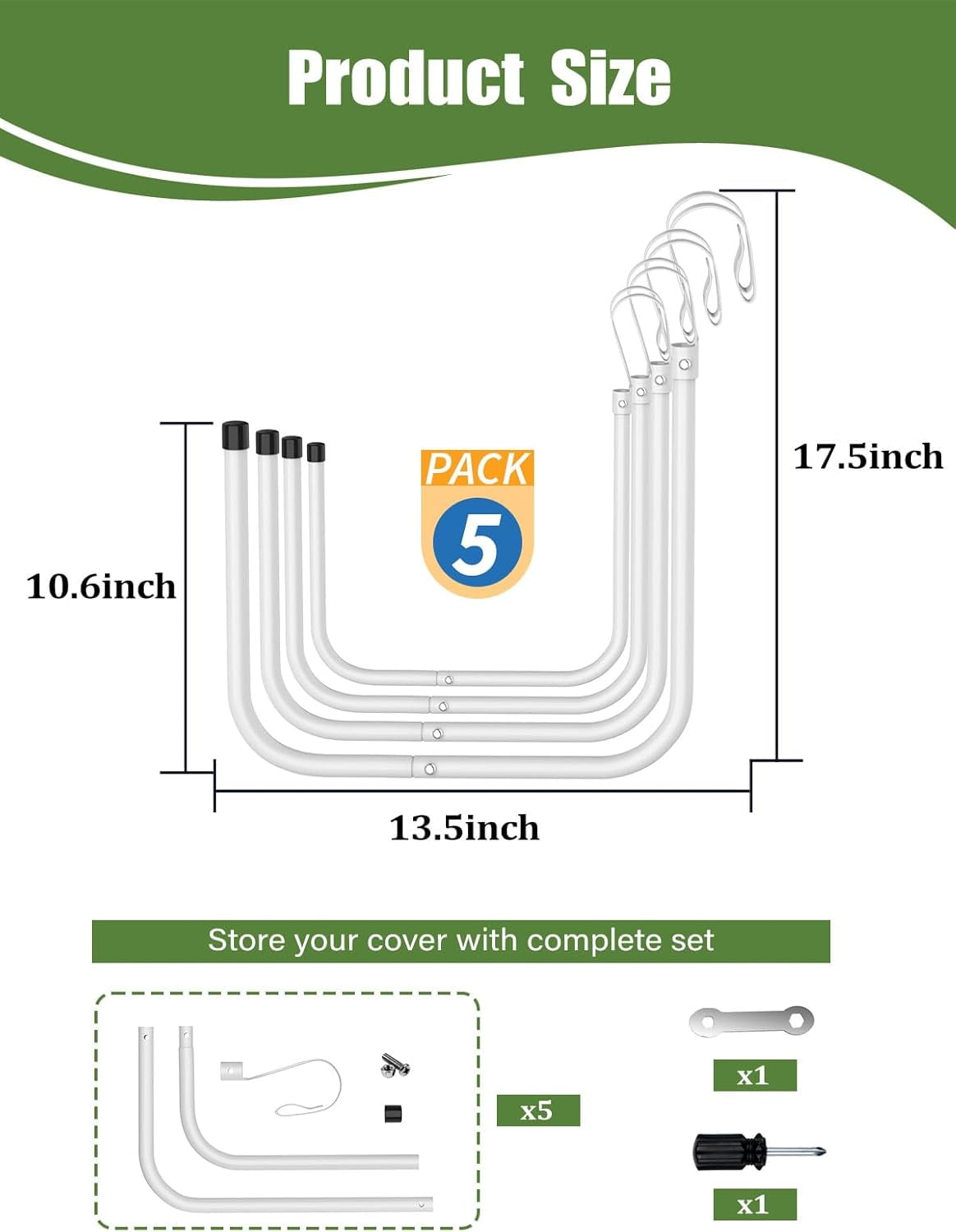 HEAVY DUTY & STRONG LOAD BEARING: A Pack of 5 L-shaped solar cover hooks constructed with high strength metal tubes and more durable than aluminum. Each hook can withstand up to 60 pounds each without deformation, ensuring its durability and long-term outdoor use without damage. It designed to withstand harsh weather and support years of reliable use.